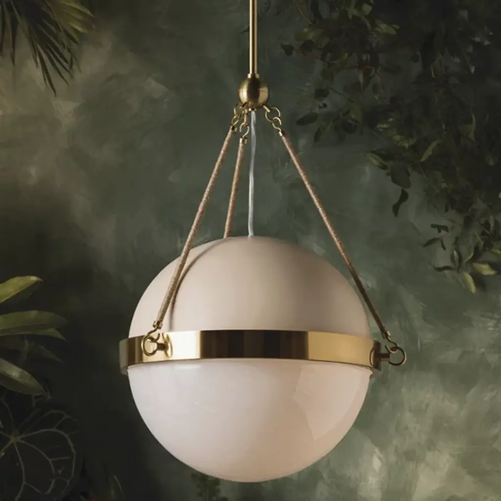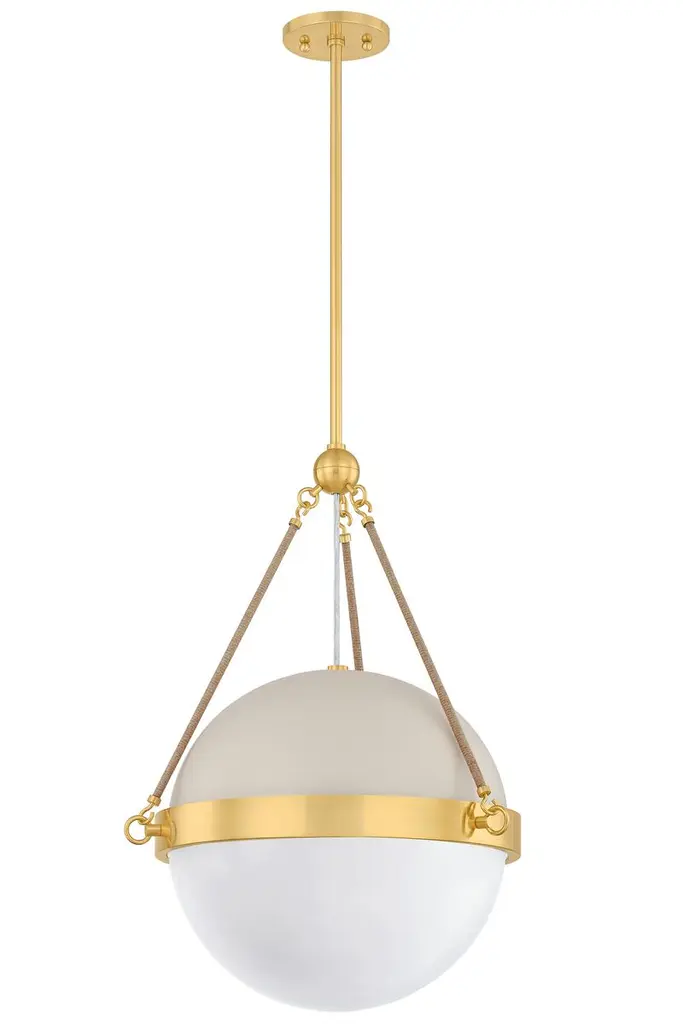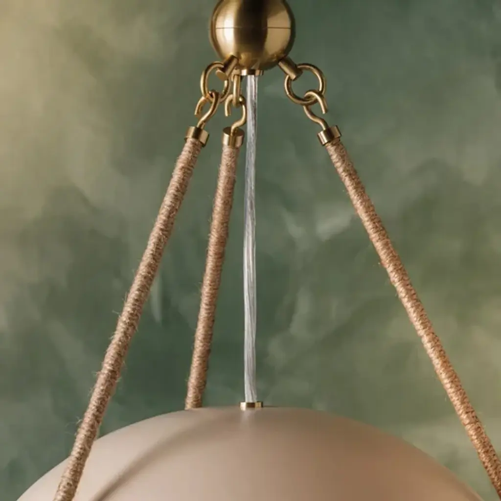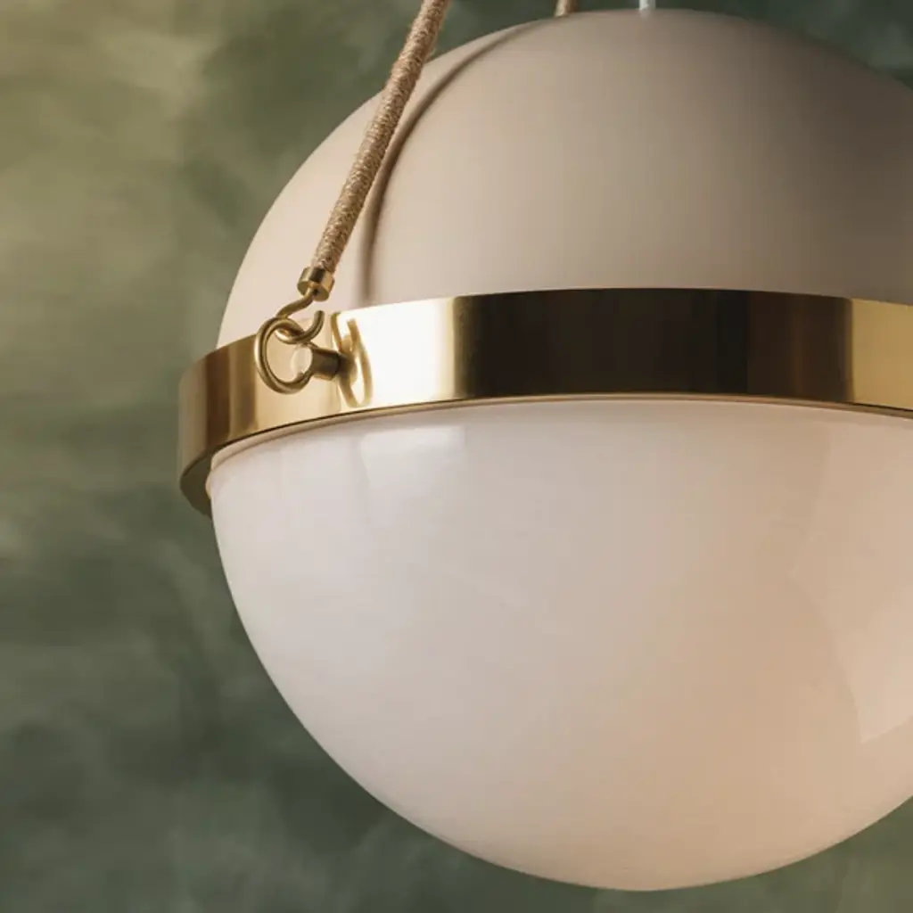 The Abbie Pendant from Mitzi, designed by Mandy Cheng, juxtaposes ethereal cloud glass with rugged jute rope for a compelling material contrast. Its spherical form recalls a medieval globus cruciger, centered by a metallic cuff that divides the composition with purposeful precision. The pendant's top half features a painted finish that introduces additional visual complexity without overwhelming the design. This historically-inspired yet thoroughly modern fixture balances delicate and coarse elements with remarkable restraint. The cloud glass diffuses light evenly while maintaining a soft glow that works wonderfully in dining areas, entryways, or as bedside lighting.