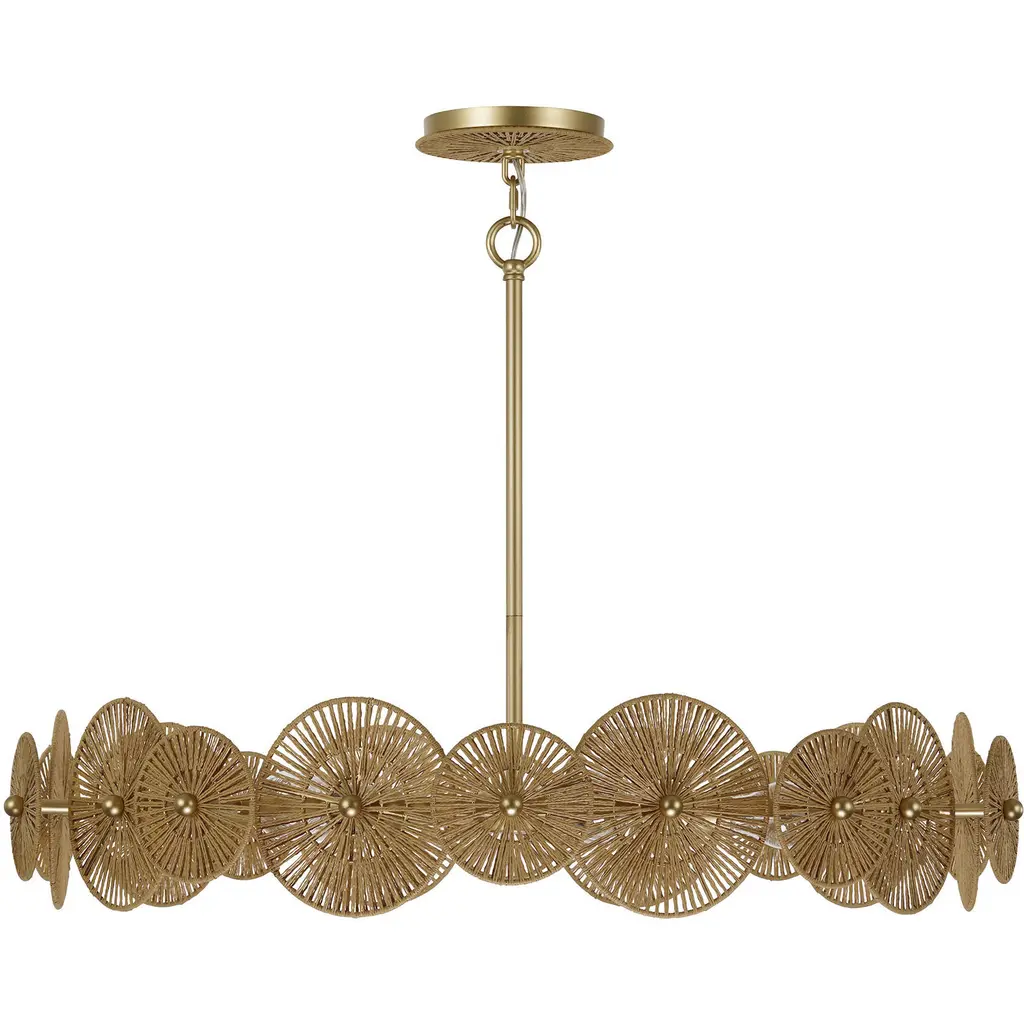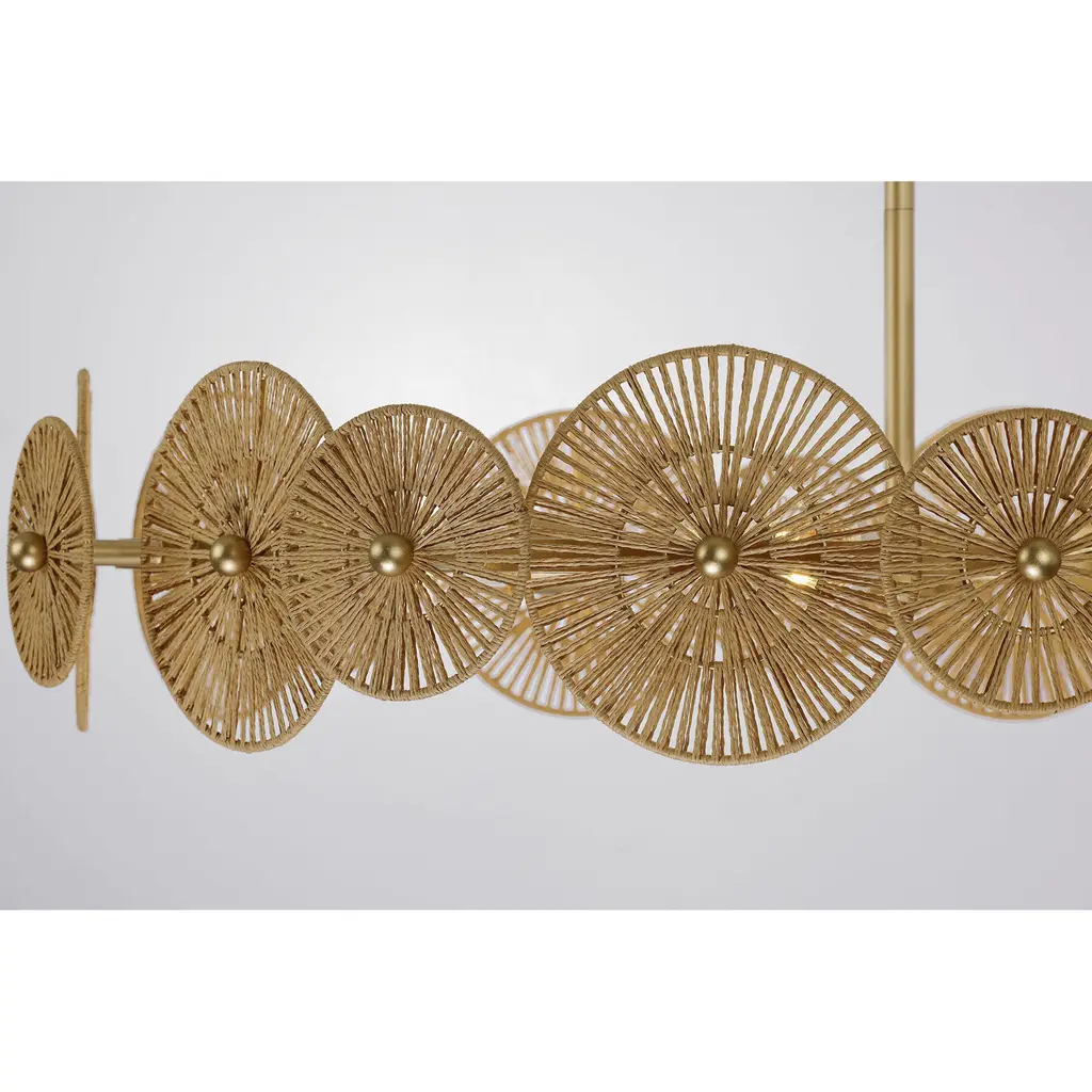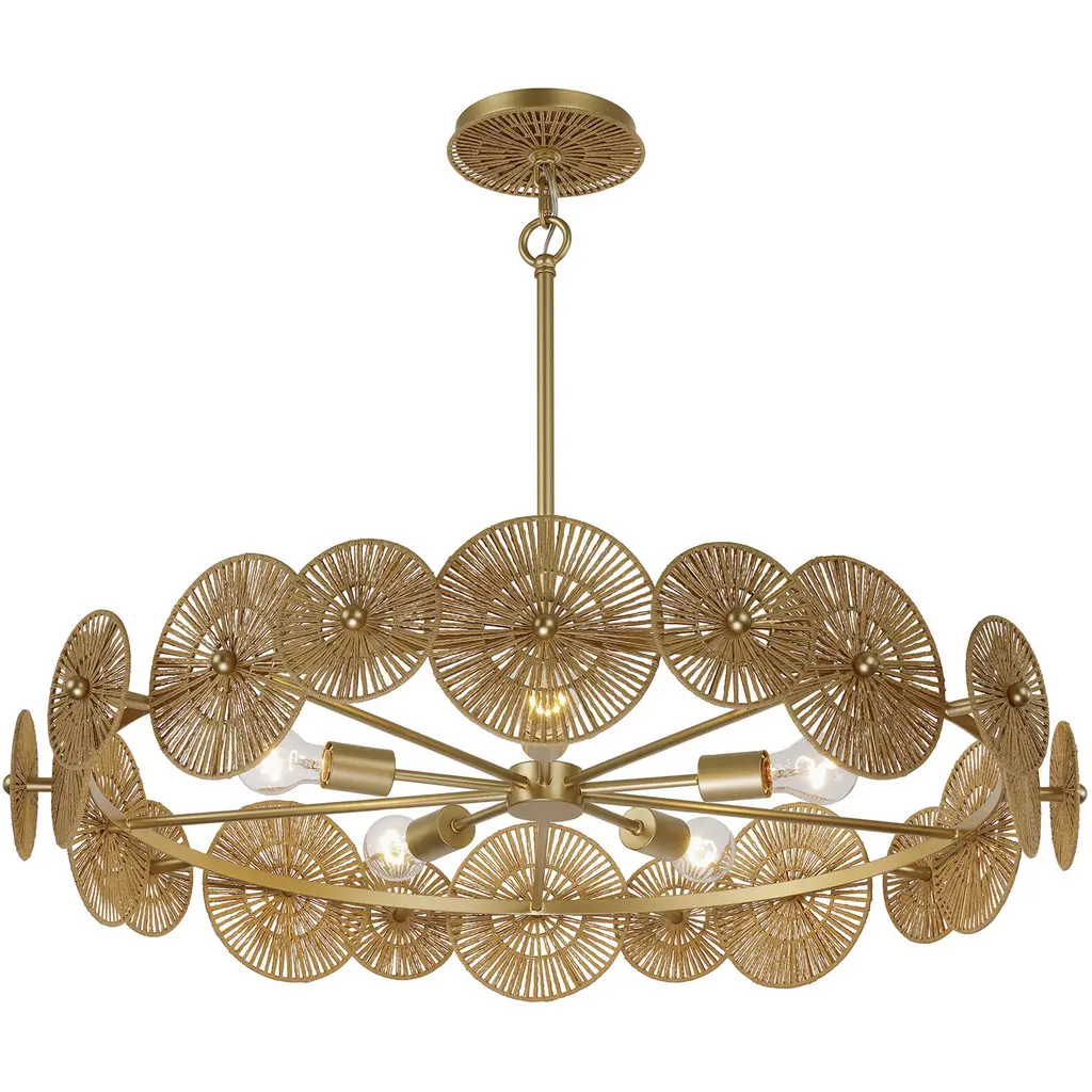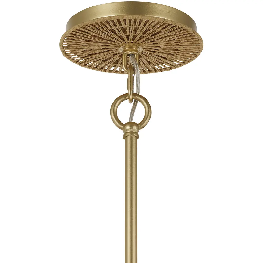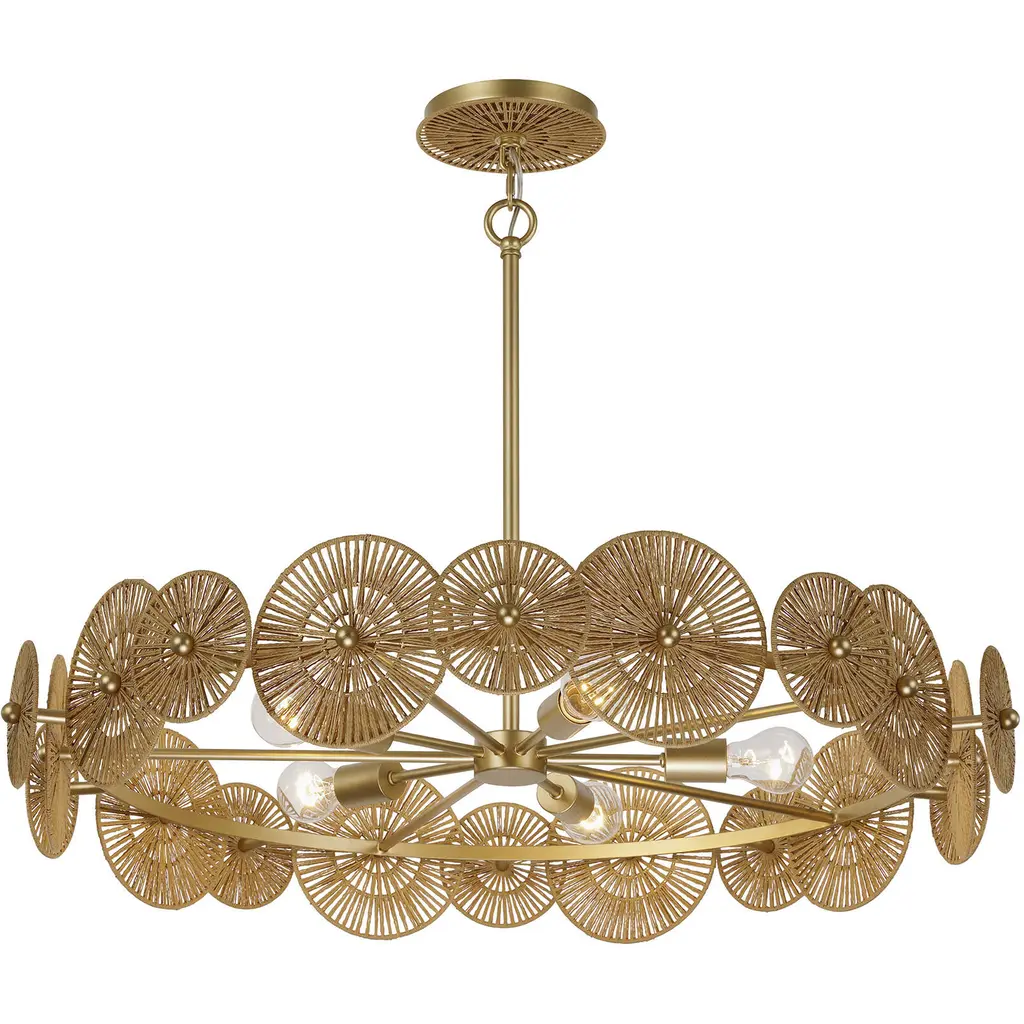 Showcasing intriguing organic style, the Savoy House Abbott 5-light pendant was designed by Breegan Jane, an award-winning interior designer and TV host. Breegan hails from California and infuses her designs with the laid-back, nature-inspired touches that are characteristic of the Golden State. Abbott holds spectacular eye-catching wheels of natural raffia that bring a big dose of touchable texture. It is finished by hand in Distressed Gold, adding extra glamour. Abbott is 30.5" in width and has an adjustable height ranging from 7.19" to 61.19". It uses five standard size bulbs of up to 60 watts per bulb. Bulbs not included. Comes with four 12" downrods and one 6" downrod.