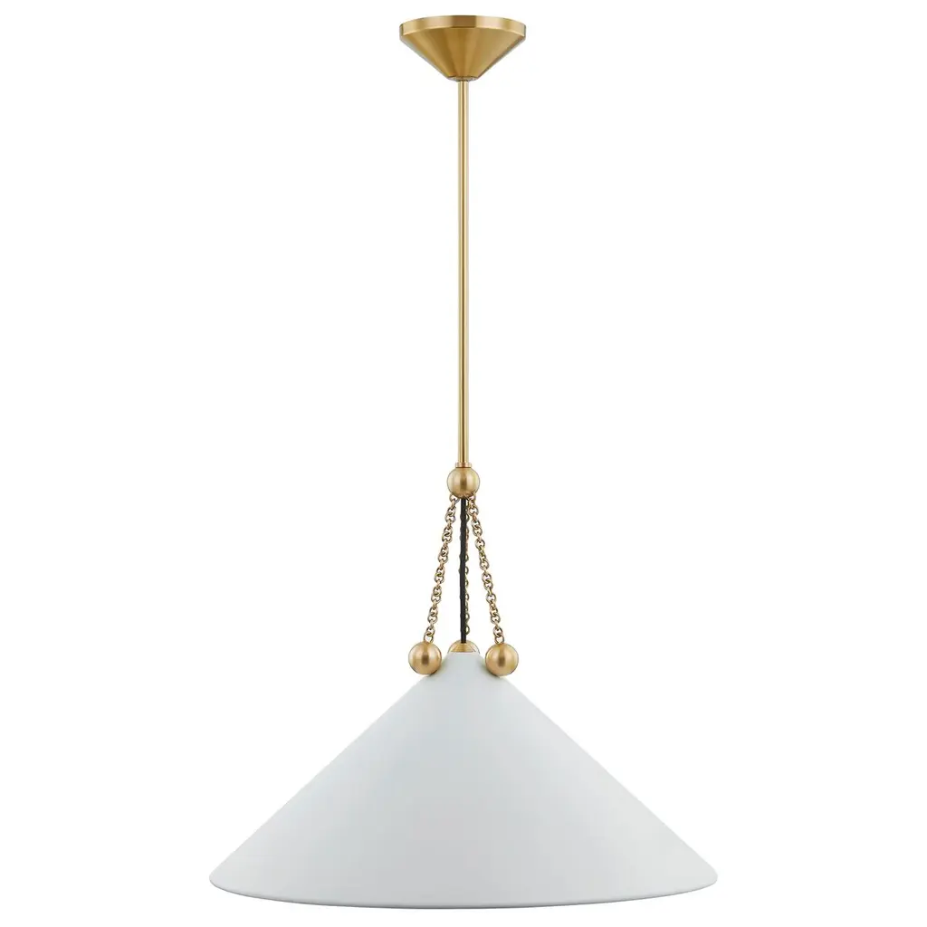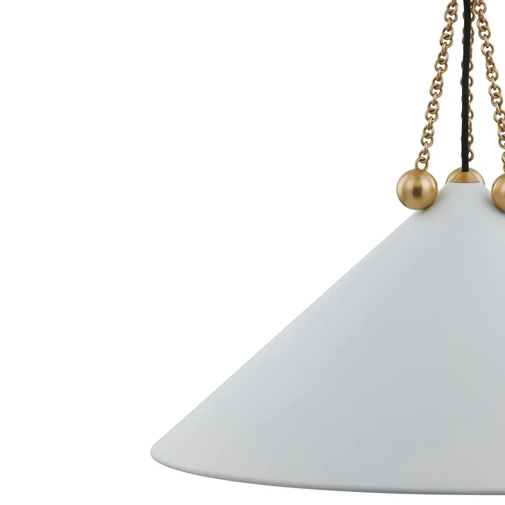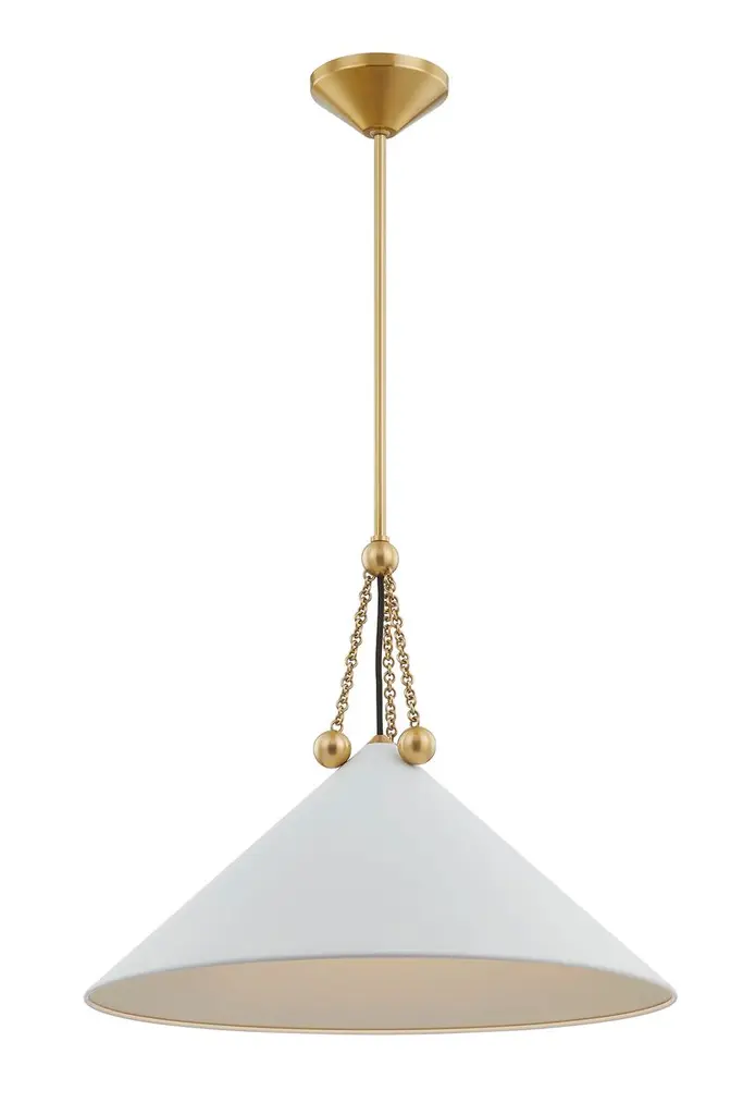 Boho meets Bauhaus in this ornamental and architectural pendant. The detailed chainwork, orb accents, and metal tip at the top decorate the straightforward, angular shade with jewelry-like accents. The finish feels crisp and clean, while the interior provides a more dramatic effect.