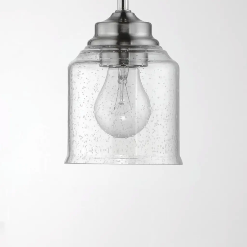 A clean and simple frame features arms that gently bend to support a Clear Seedy glass in a traditional bell shape. An easy choice for a transitional look, available in matte Black or Satin Nickel.