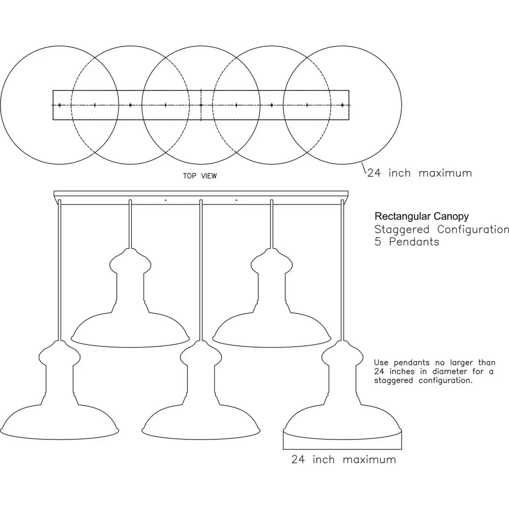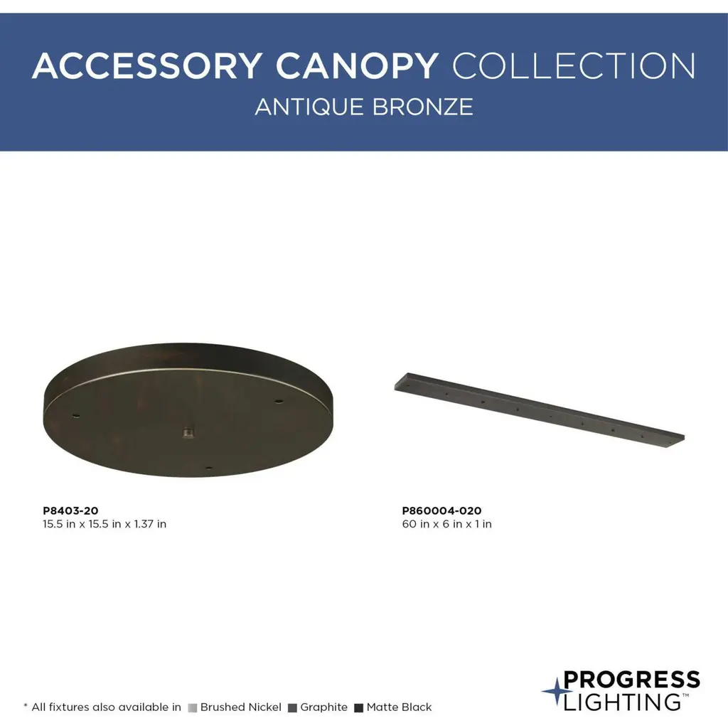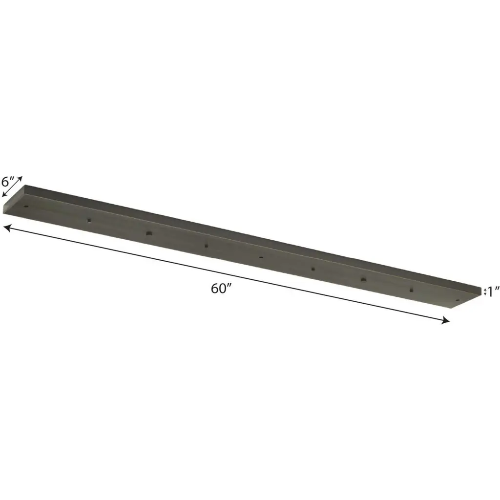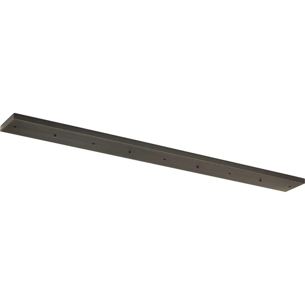 Progress Lighting's canopy accessory offers a convenient way to mount groupings of pendants. This rectangle pendant accessory allows for the hanging of three to five pendants off of one outlet box. Pendants can be hung straight or staggered. The maximum pendant width for three pendants is 18" each and for five pendants 13-1/2" each. Five-Light. Rectangle Canopy Accessory Antique Bronze finish.