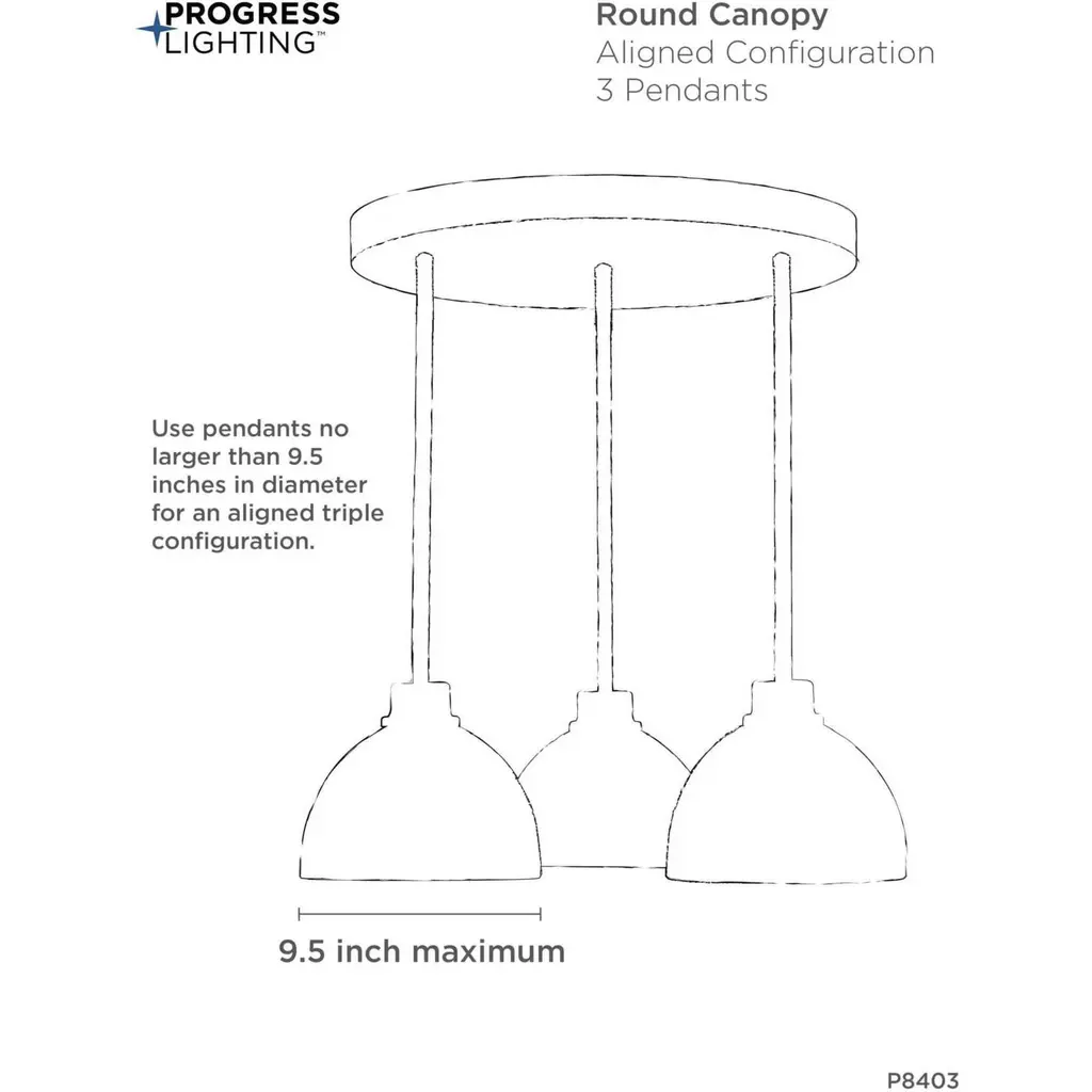 Progress Lighting's canopy accessory offers a convenient way to mount groupings of pendants. This round pendant accessory allows for the hanging of 3 pendants off of one outlet box. Pendants can be hung straight or staggered. The maximum pendant width for three pendants is 9-1/2" each.