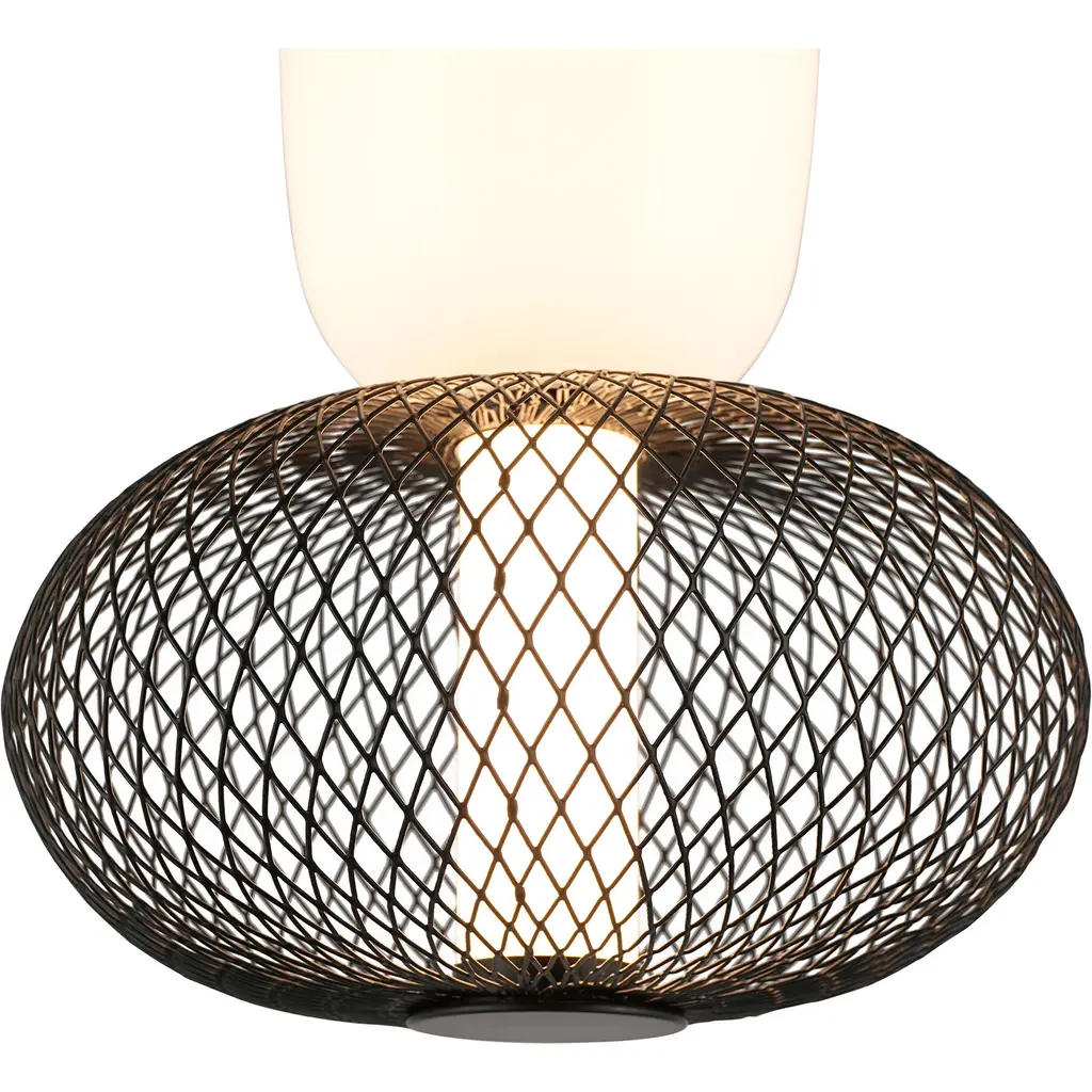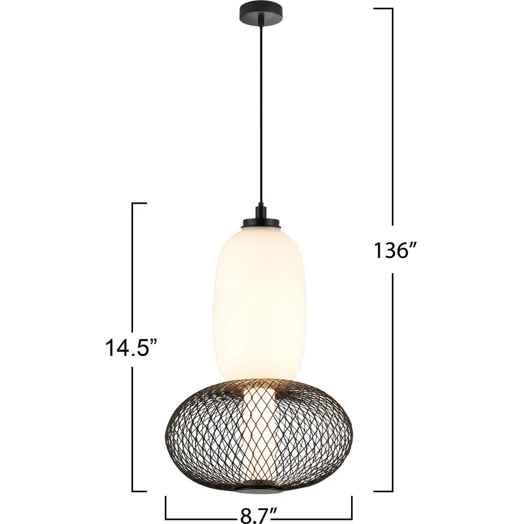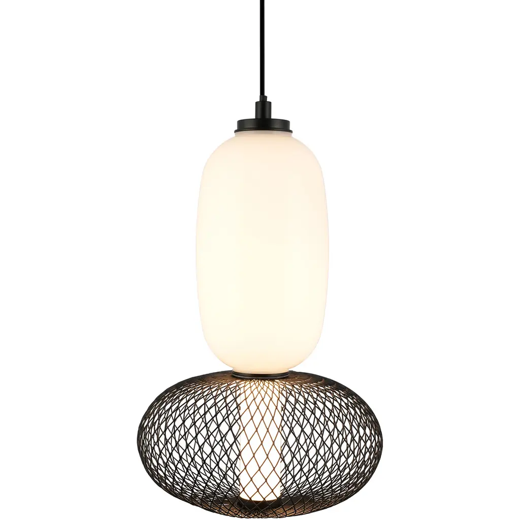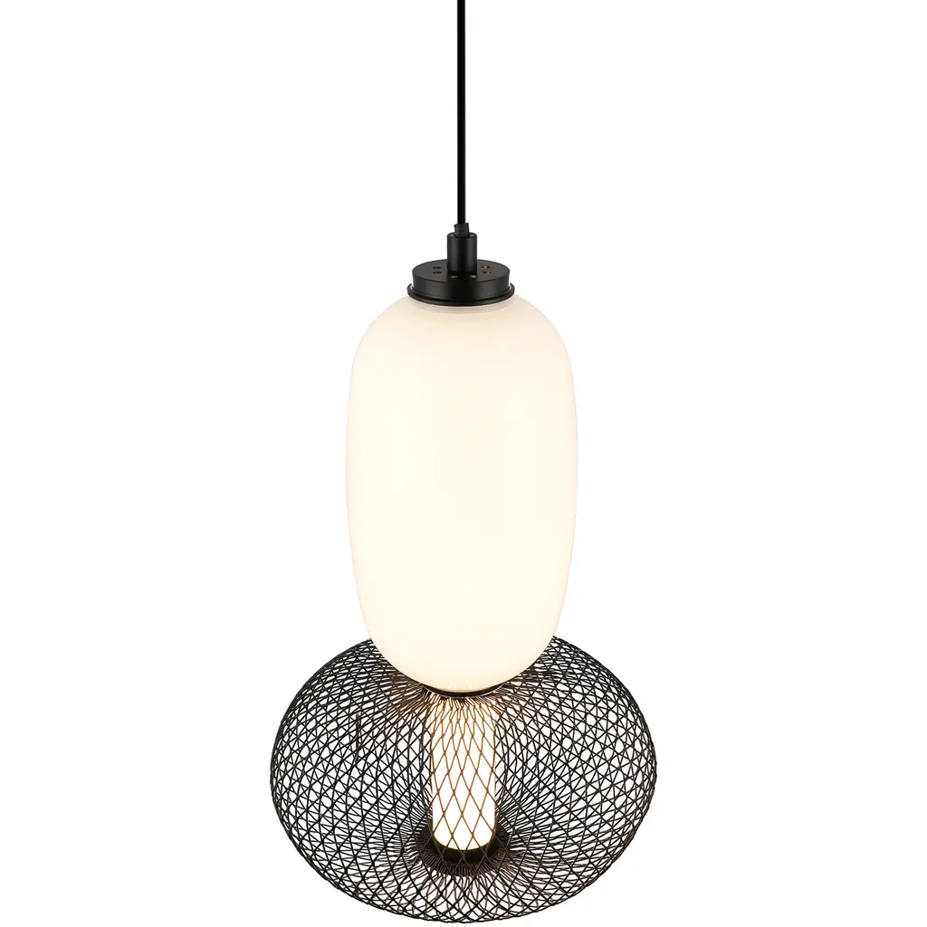 Elevate your space with the sophisticated charm of the Ace LED single pendant. This masterpiece combines an opulent white glass shade with a bold black mesh design, encasing a radiant LED tube that casts a warm, inviting glow. Its rich black metalwork and adjustable wire offer timeless elegance with versatile functionality, making it a perfect centerpiece for any setting.
