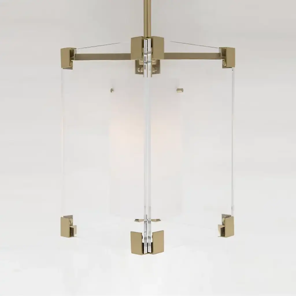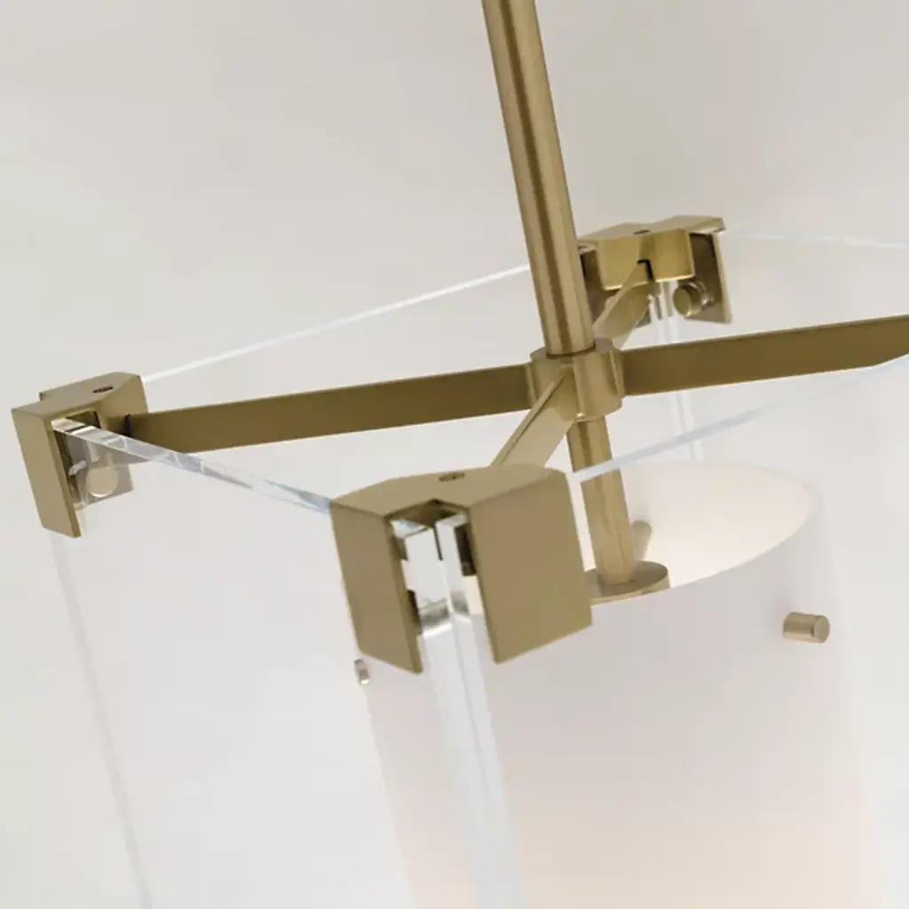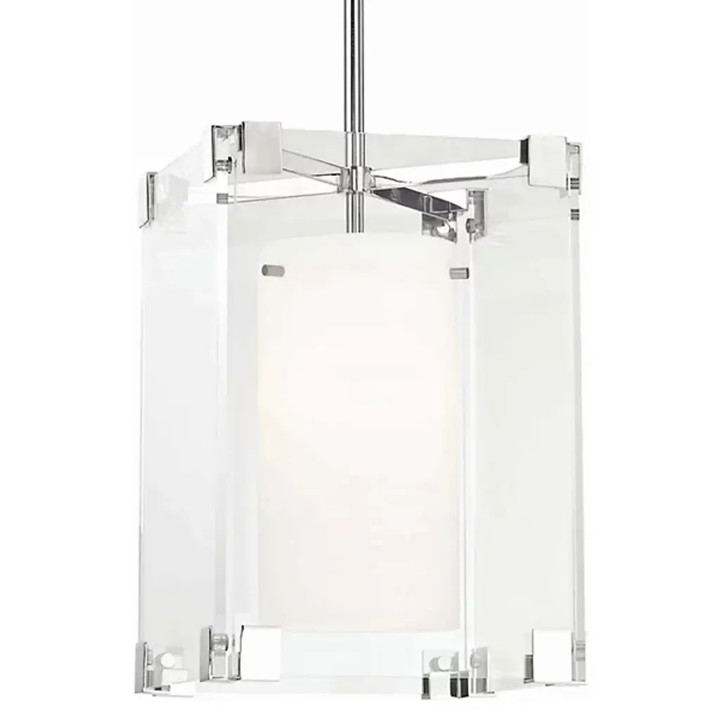 If statement lighting is your Achilles heel, count on the Achilles Pendant by Hudson Valley to make a bold declaration in any modern setting. The look starts with a cube shaped canopy lofting a Steel crossbar and Clear glass rectangular outer shade. Inside another cylindrical Opal Matte shade diffuses and directs downward lighting over a kitchen counter, entryway or powder room.
