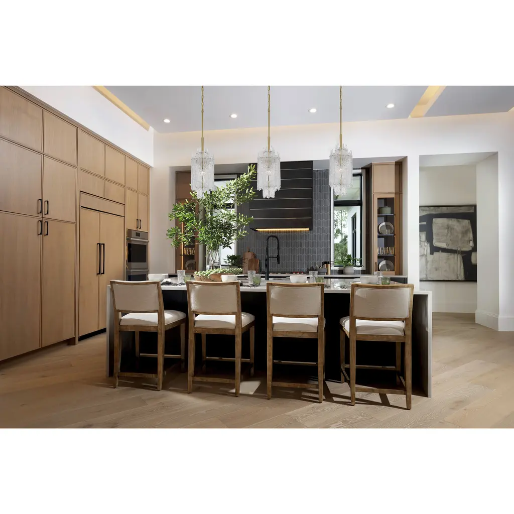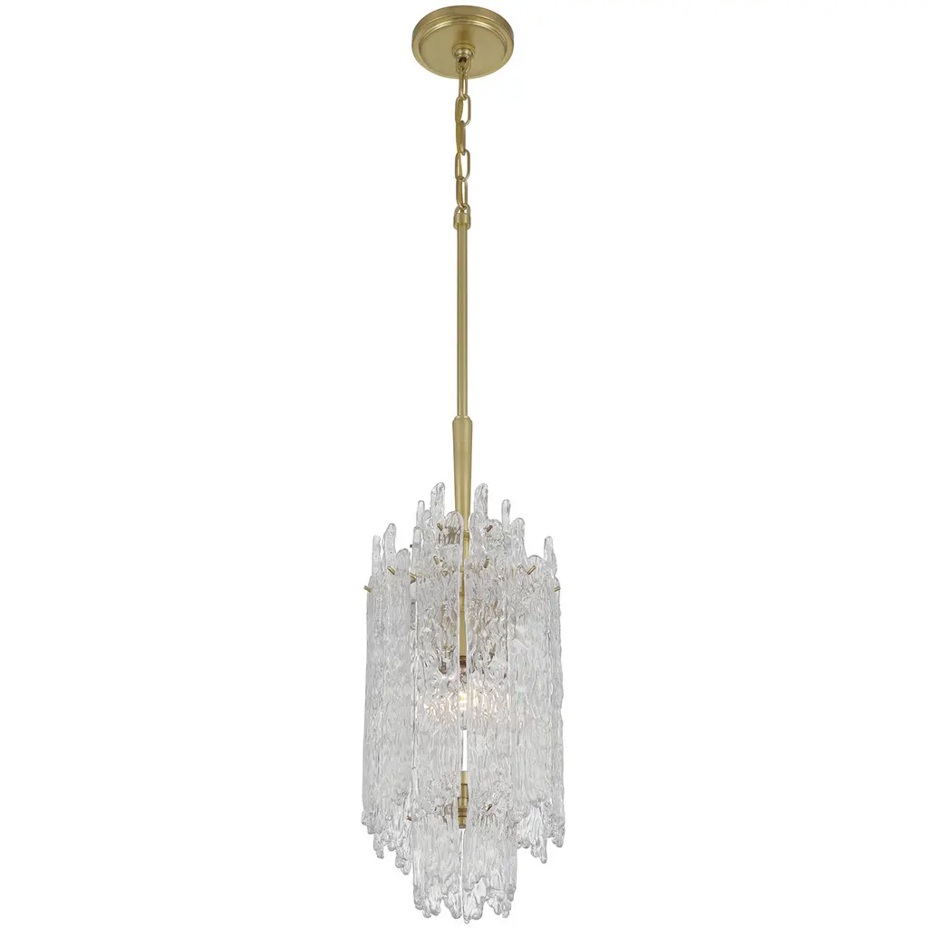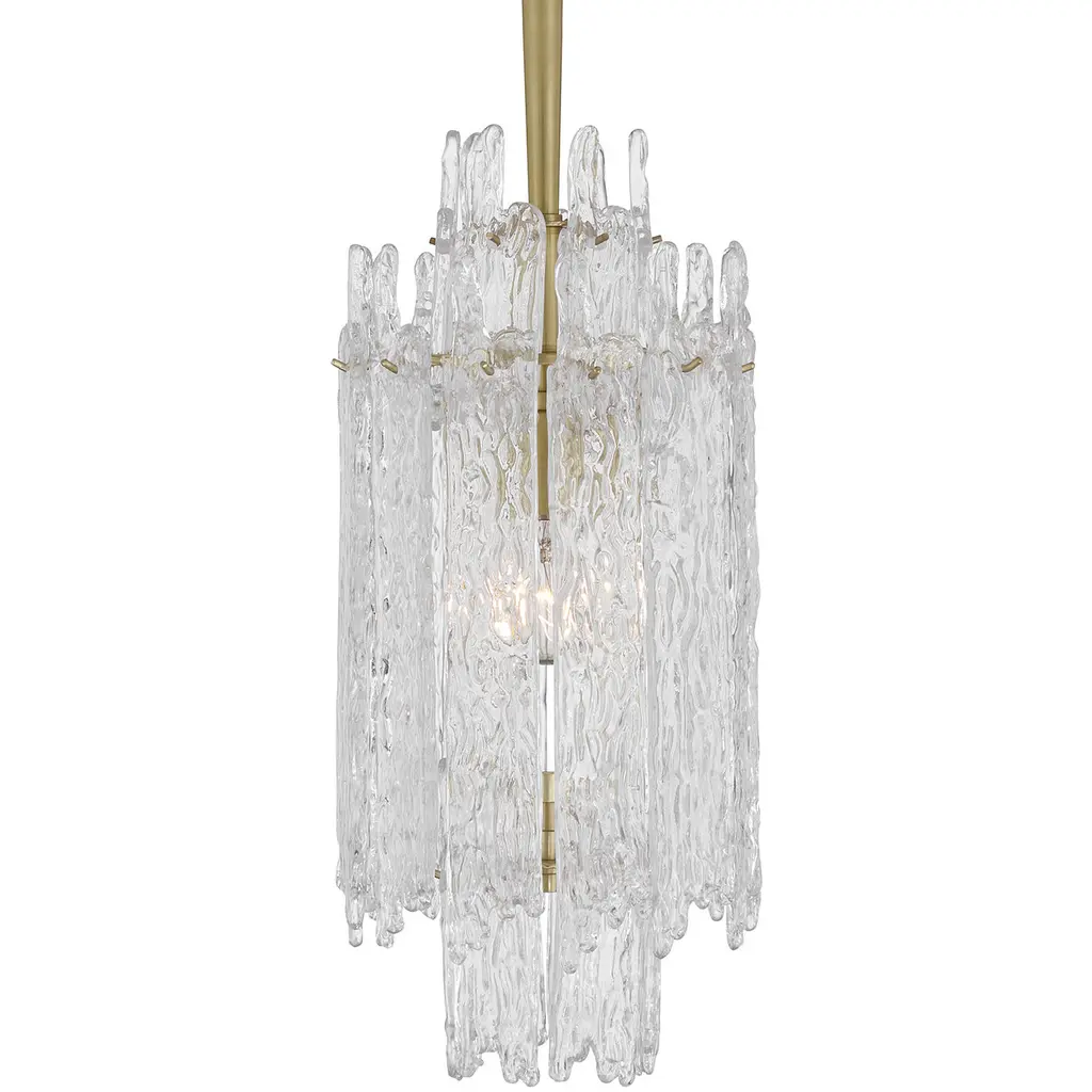 The Ackerly Collection showcases stunning ice glass, a textured material that resembles frozen or cracked ice. Its frosted, crystalline surface uniquely scatters light, producing a soft, diffused glow. This organic, sculptural effect adds a modern yet slightly retro touch to the design. The Ackerly Collection combines elegance with an artistic, edgy aesthetic, making it a standout in any space.