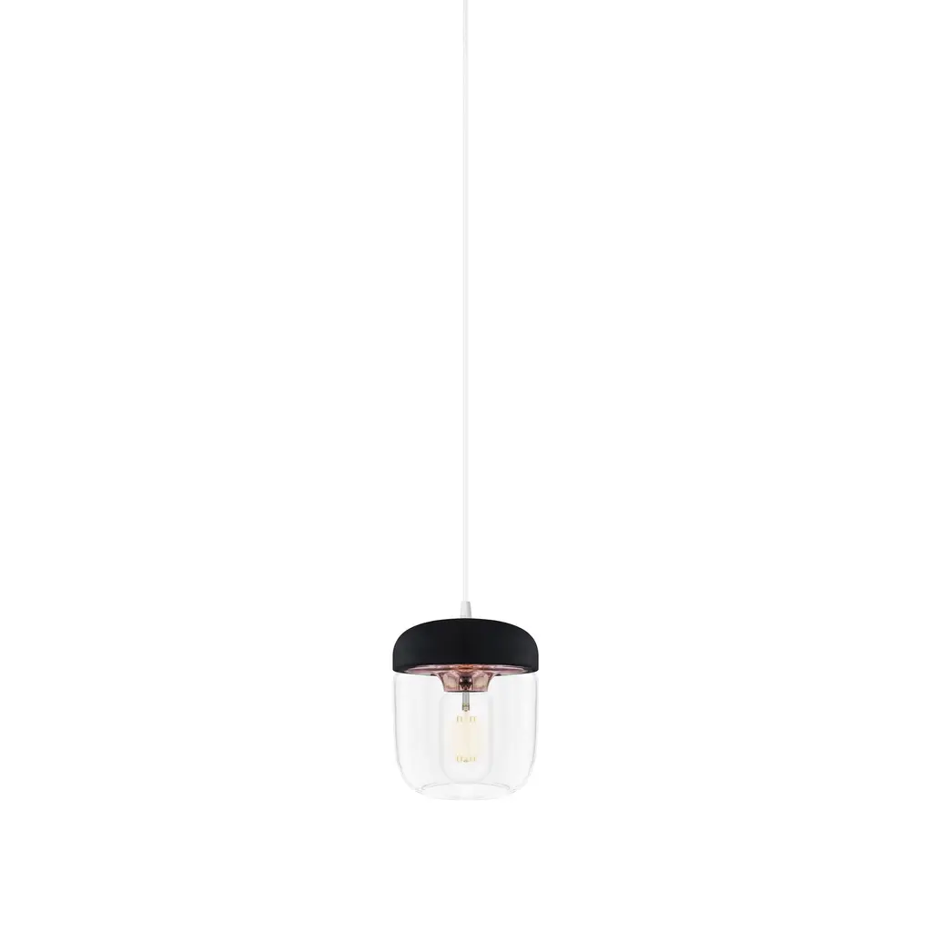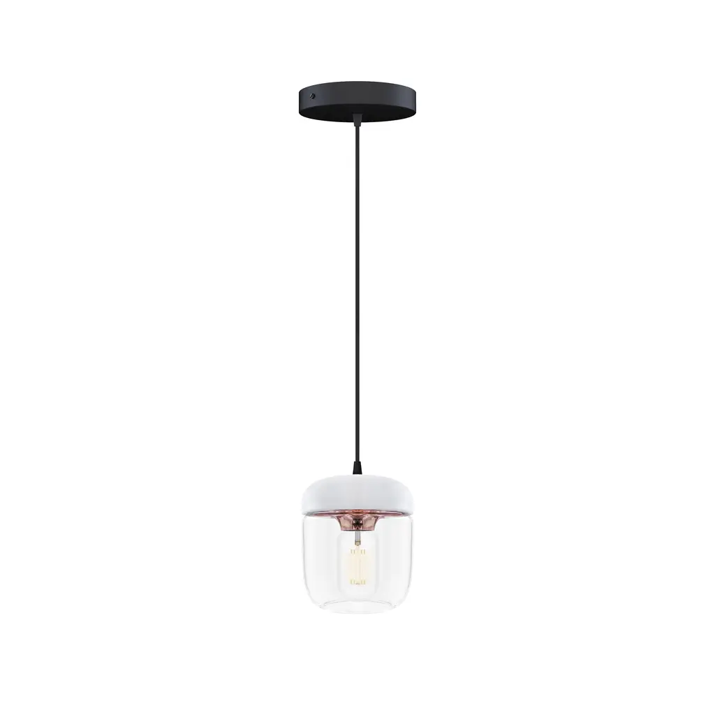 A walk in an oak forest inspired Danish designer Jacob Rudeck's charming Acorn Pendant. A clear glass shade provides a brilliant reflected light that varies in tone depending on the metallic finish inside the domed matte silicone cap. From Copenhagen-based Umage, the diminutive Acorn can be placed on its own in a cozy spot or arrayed in a group to illuminate larger spaces.