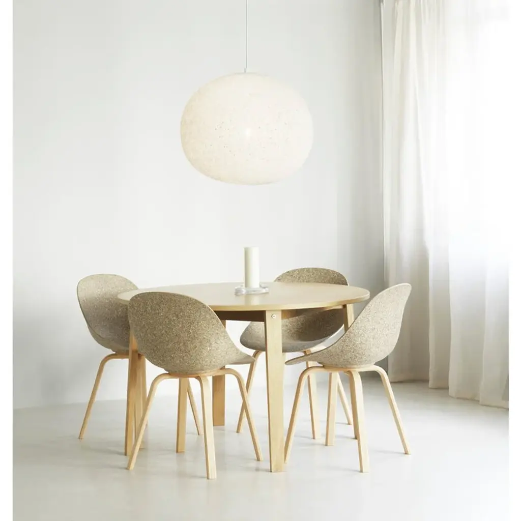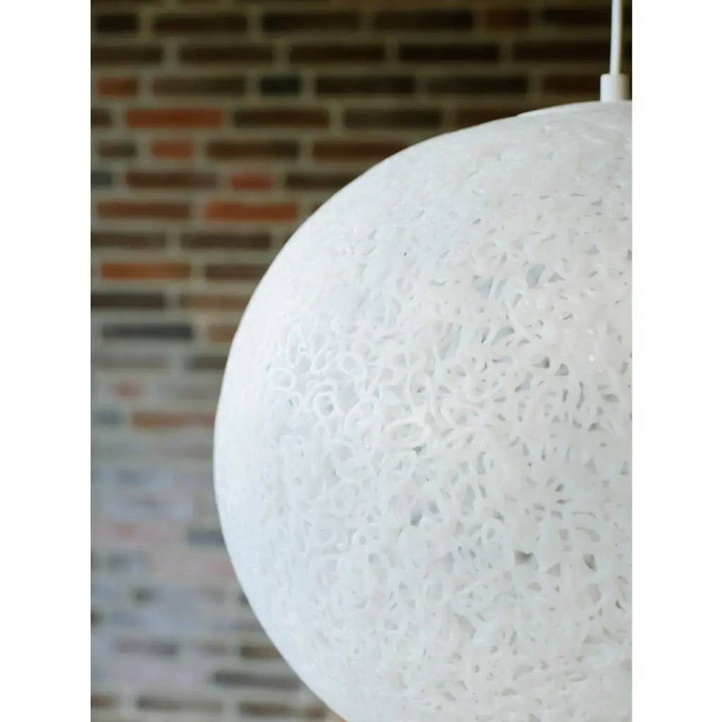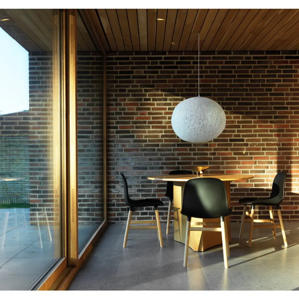 The Act pendant lamp by Normann Copenhagen is a refined example of circular thinking and inventive design. The lamp’s shade is crafted from PE plastic pipes which, due to their complex composition, have traditionally been incinerated instead of recycled. Now, in the hands of designer Simon Legald, this plastic waste is given a new life as a lighting object. The shade of the Act pendant is created by diagonally slicing the plastic pipes into oval rings and carefully fusing them together. This process preserves the material’s unique texture and reveals the subtle beauty of recycled plastic. The translucent surface of the oval shade allows light to play through it, casting a soft, atmospheric glow. The Act pendant lamp is an excellent choice above a dining table, as a statement piece in a living room or in public spaces that value sustainable and thoughtful design.