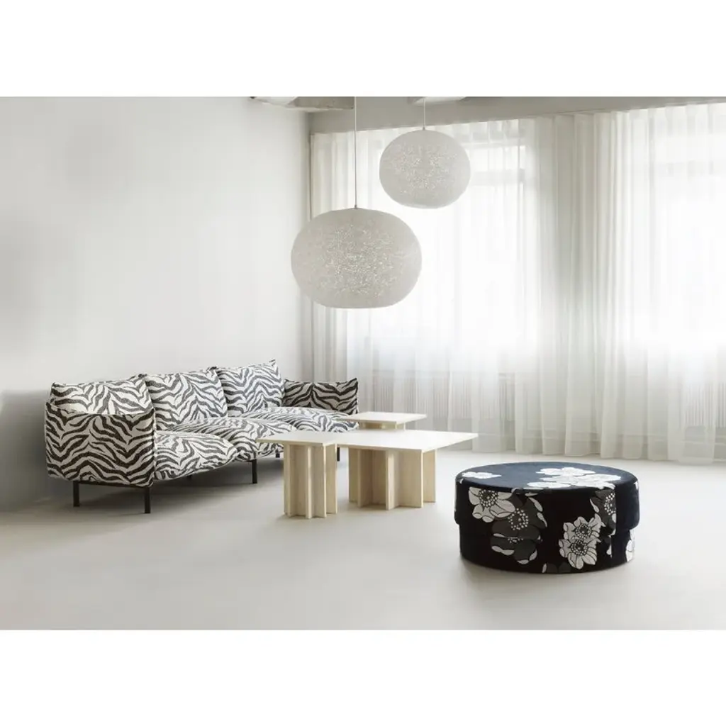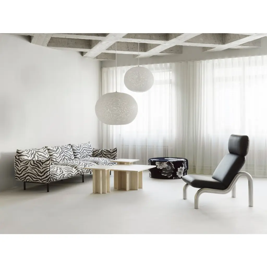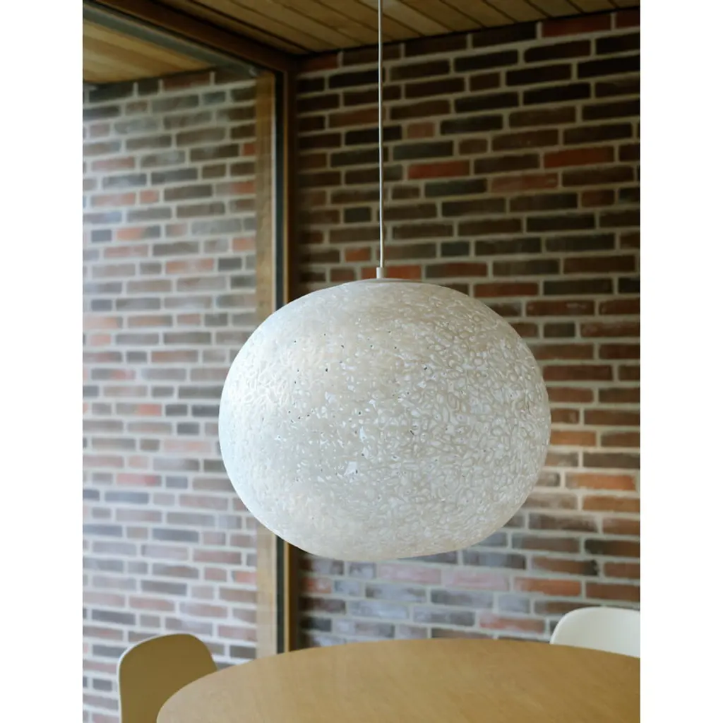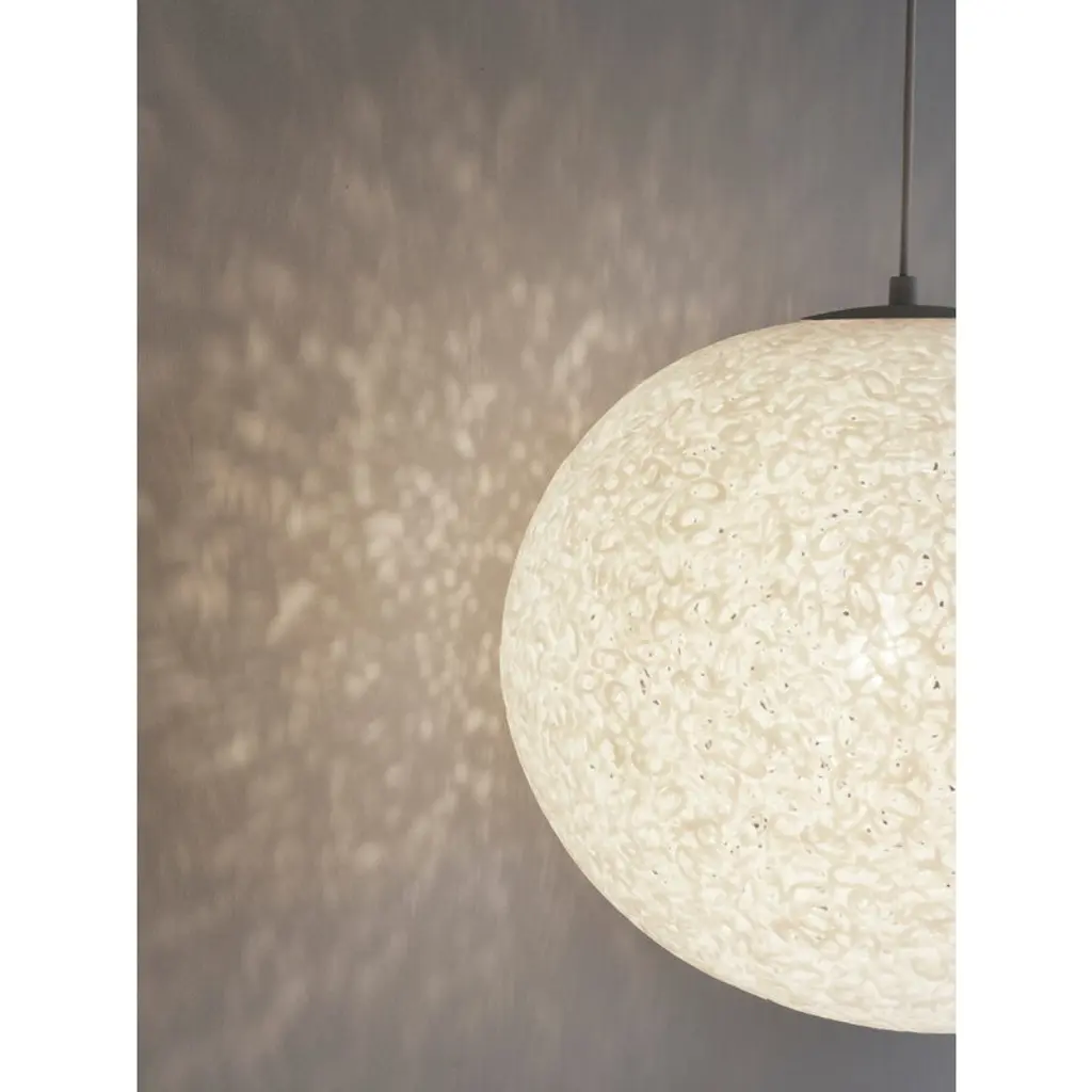 The Act pendant lamp by Normann Copenhagen is a refined example of circular thinking and inventive design. The lamp’s shade is crafted from PE plastic pipes which, due to their complex composition, have traditionally been incinerated instead of recycled. Now, in the hands of designer Simon Legald, this plastic waste is given a new life as a lighting object. The shade of the Act pendant is created by diagonally slicing the plastic pipes into oval rings and carefully fusing them together. This process preserves the material’s unique texture and reveals the subtle beauty of recycled plastic. The translucent surface of the oval shade allows light to play through it, casting a soft, atmospheric glow. The Act pendant lamp is an excellent choice above a dining table, as a statement piece in a living room or in public spaces that value sustainable and thoughtful design.