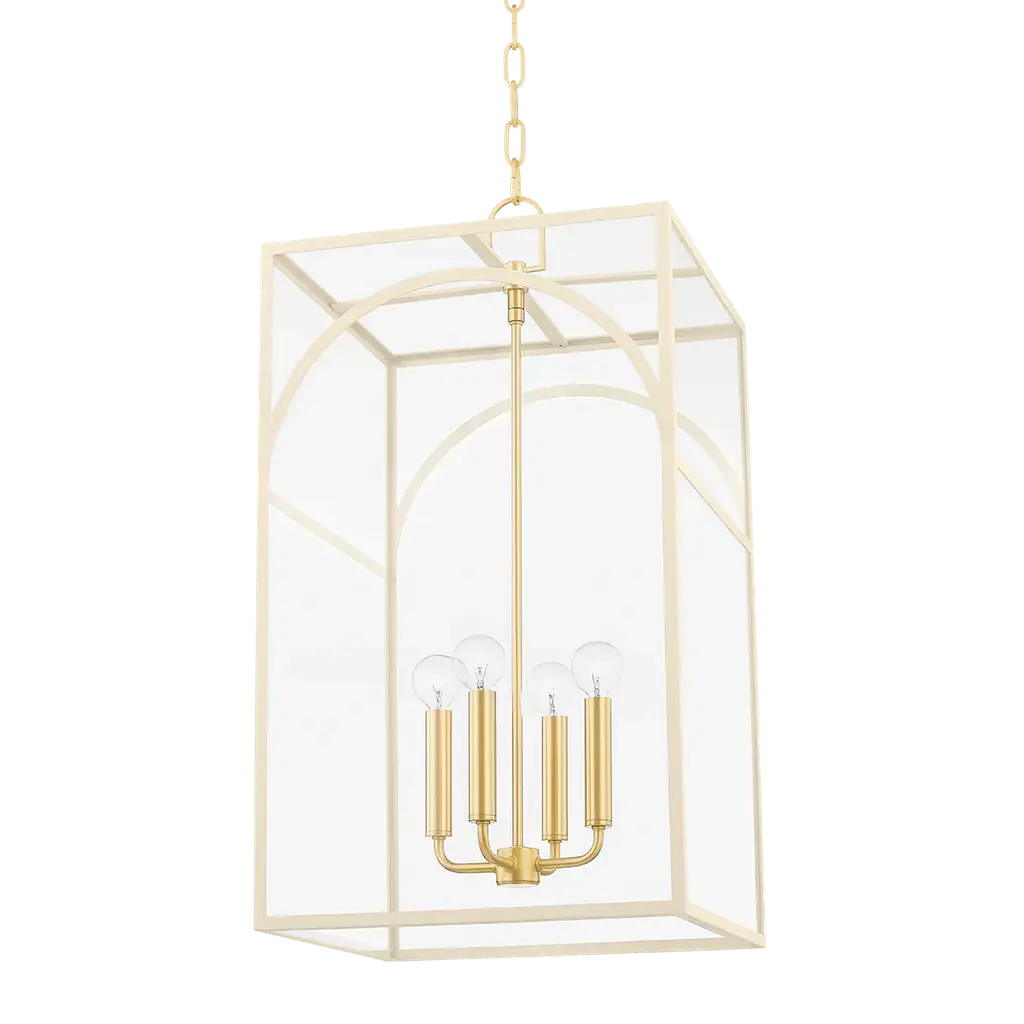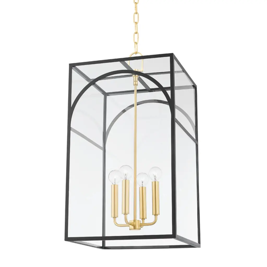 Like a fixture within a fixture, a series of aged brass candlesticks hang within a decorative metal cage. The arched details and defined lines of the frame give Addison an architectural air. This updated take on the classic lantern design demands to be noticed. Choose from aged brass with textured cream or textured black.