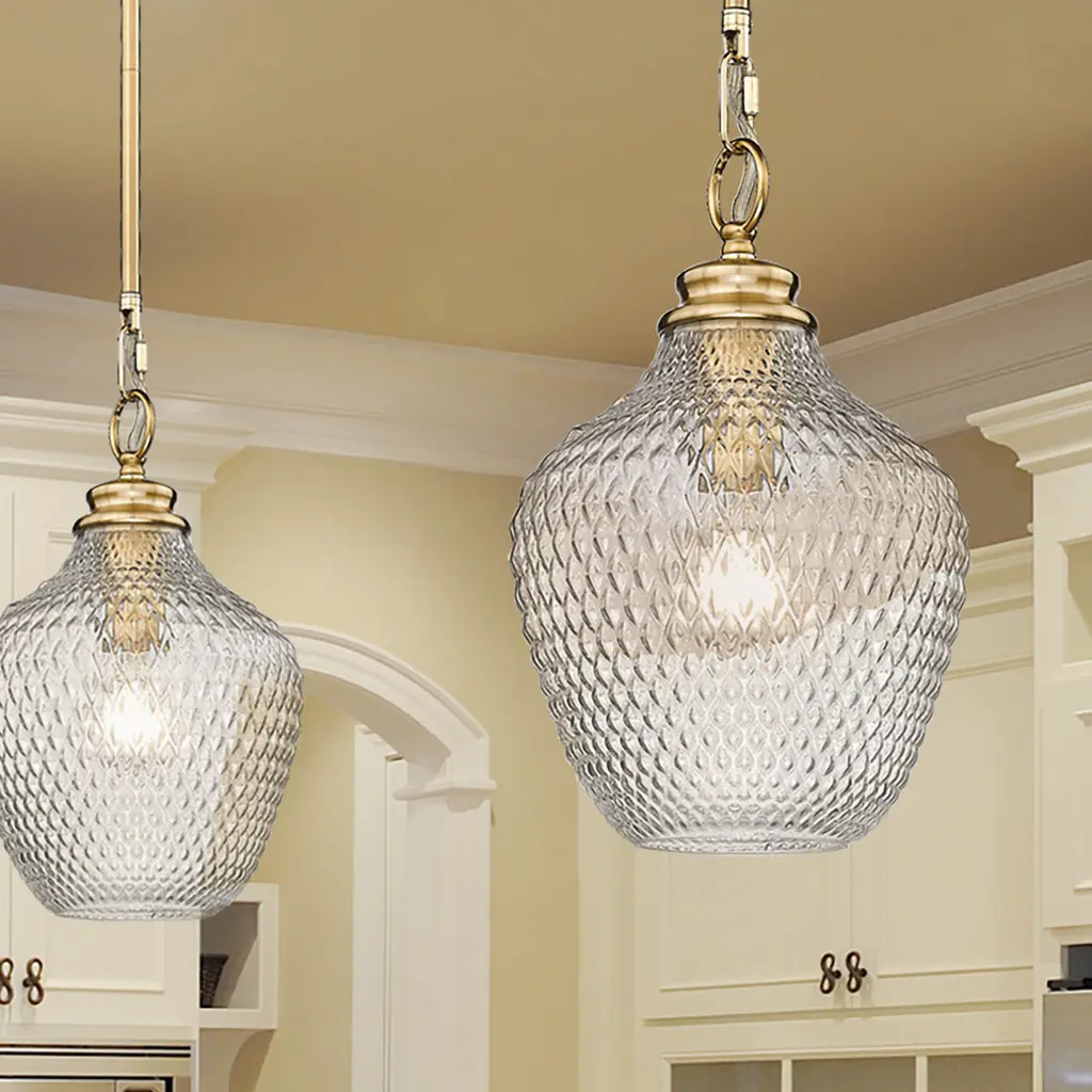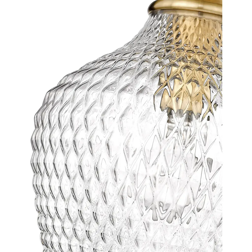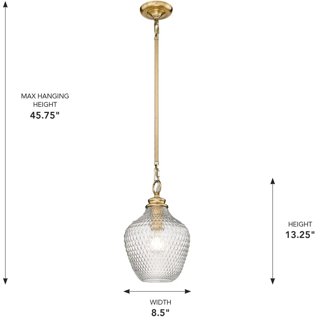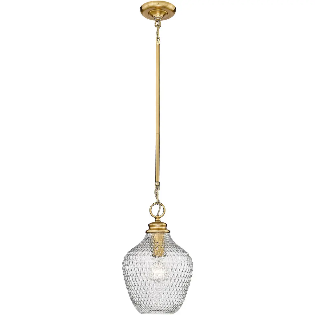 Elevate your interiors with the Golden Lighting Adeline 1-light Pendant, blending modern elegance with functional design. Featuring a clear glass shade and a modern brushed gold frame, it radiates a warm and inviting glow.The clear glass shade provides brilliant illumination, allowing the bulb's beauty to shine through while maintaining an uncluttered aesthetic. This simplistic design complements a myriad of decor styles.Showcasing a radiant modern brushed gold finish, this pendant adds a luxe touch to your decor, enhancing every corner it graces.Rated for damp locations, it is ideal for covered areas like kitchens, living spaces, and bathrooms. Installation is a breeze with sloped-ceiling compatibility and adjustable height ranging from 16.375" to 45.75". It requires one E26 Medium base bulb (not included) with a maximum wattage of 100.Overall Dimensions: 8.5"W x 13.25"H x 8.5"D. Experience the blend of style and quality with Golden Lighting, perfect for any home.