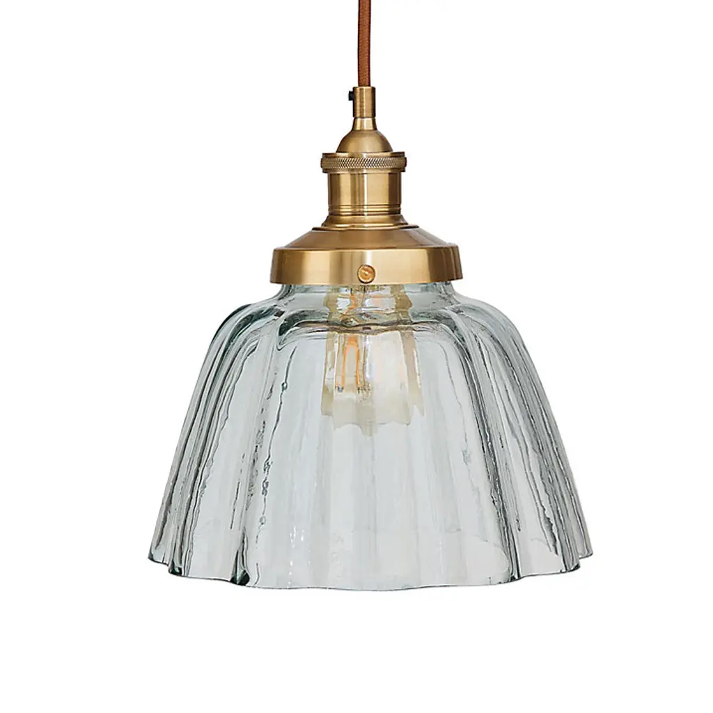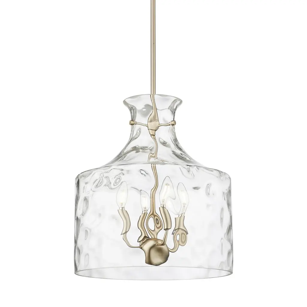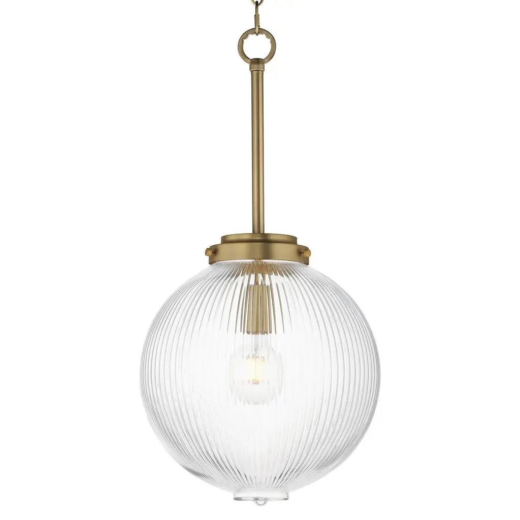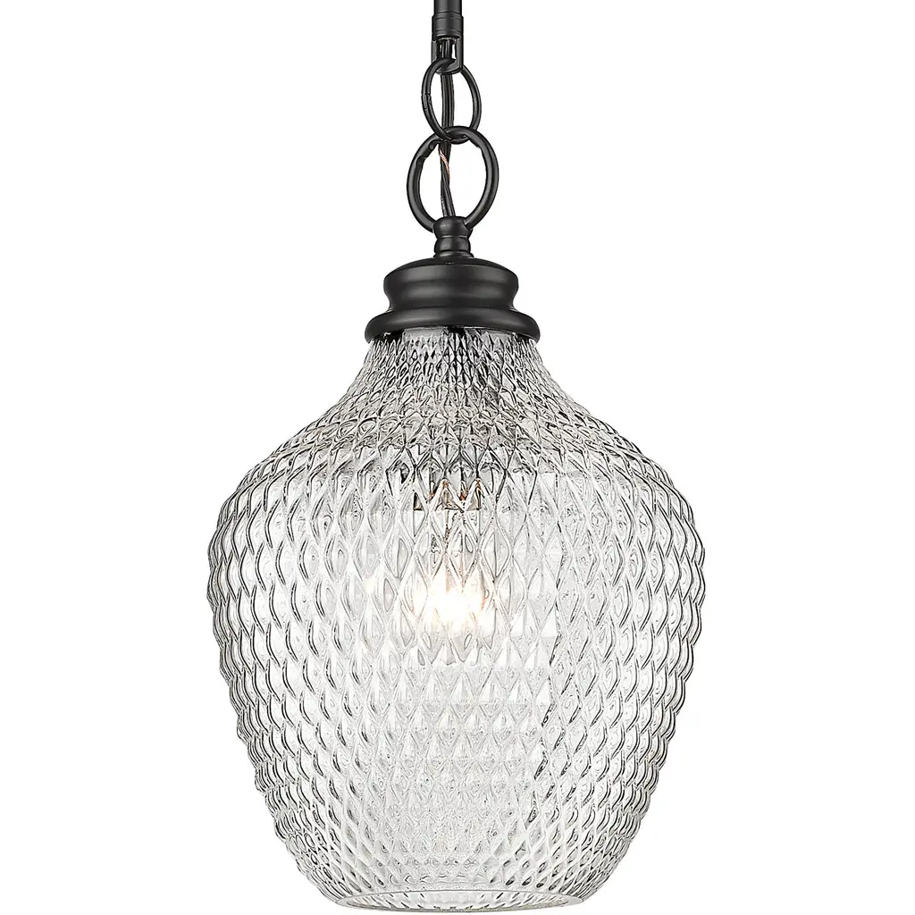 Elevate your interiors with the Golden Lighting Adeline 1-light Pendant, blending modern elegance with functional design. Featuring a clear glass shade and a modern brushed gold frame, it radiates a warm and inviting glow.The clear glass shade provides brilliant illumination, allowing the bulb's beauty to shine through while maintaining an uncluttered aesthetic. This simplistic design complements a myriad of decor styles.Showcasing a radiant modern brushed gold finish, this pendant adds a luxe touch to your decor, enhancing every corner it graces.Rated for damp locations, it is ideal for covered areas like kitchens, living spaces, and bathrooms. Installation is a breeze with sloped-ceiling compatibility and adjustable height ranging from 16.375" to 45.75". It requires one E26 Medium base bulb (not included) with a maximum wattage of 100.Overall Dimensions: 8.5"W x 13.25"H x 8.5"D. Experience the blend of style and quality with Golden Lighting, perfect for any home.
