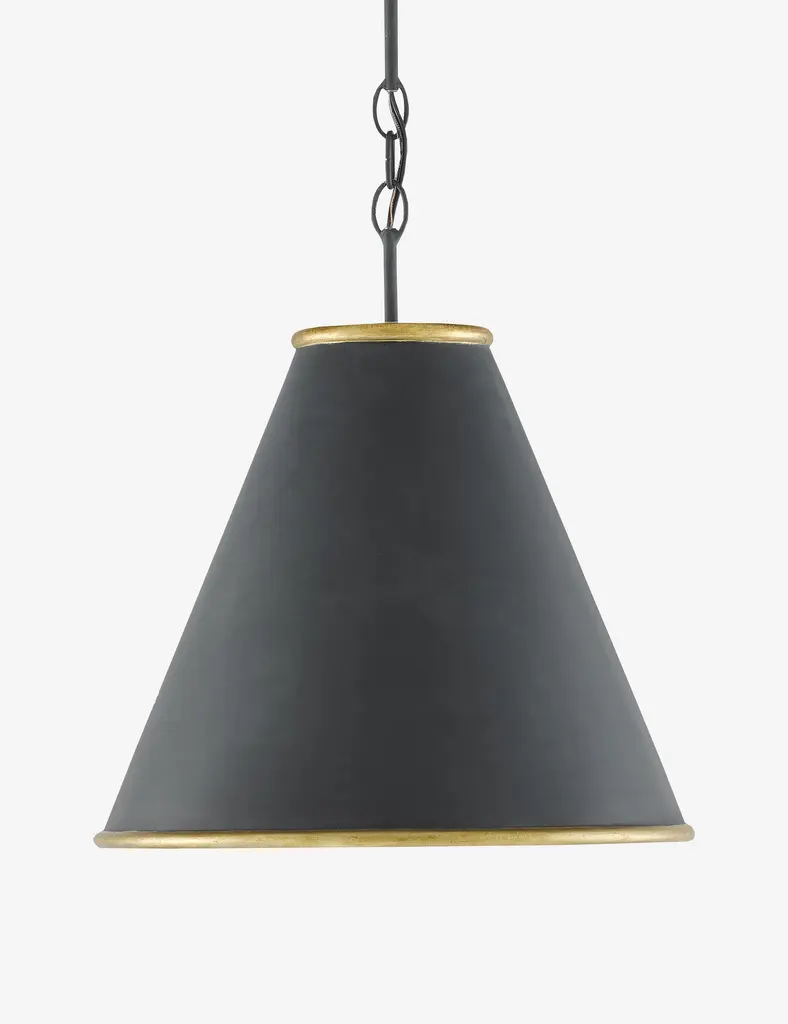 The Adkins pendant brings a bold look to the classic cone light. The matte finish is set for impact overhead, with the gold leaf lining and painted gold accent rings adding a touch of sophistication. We love this pendant in multiples for a kitchen or lounge.