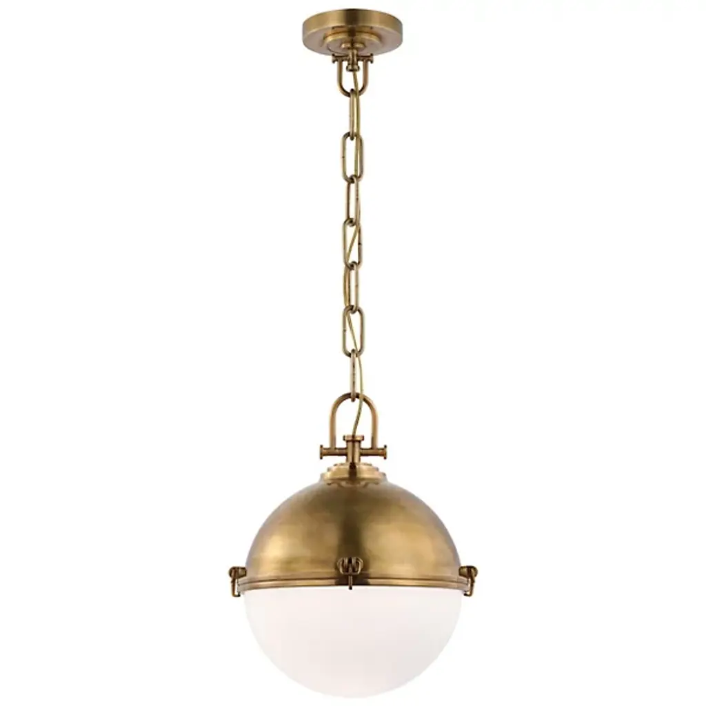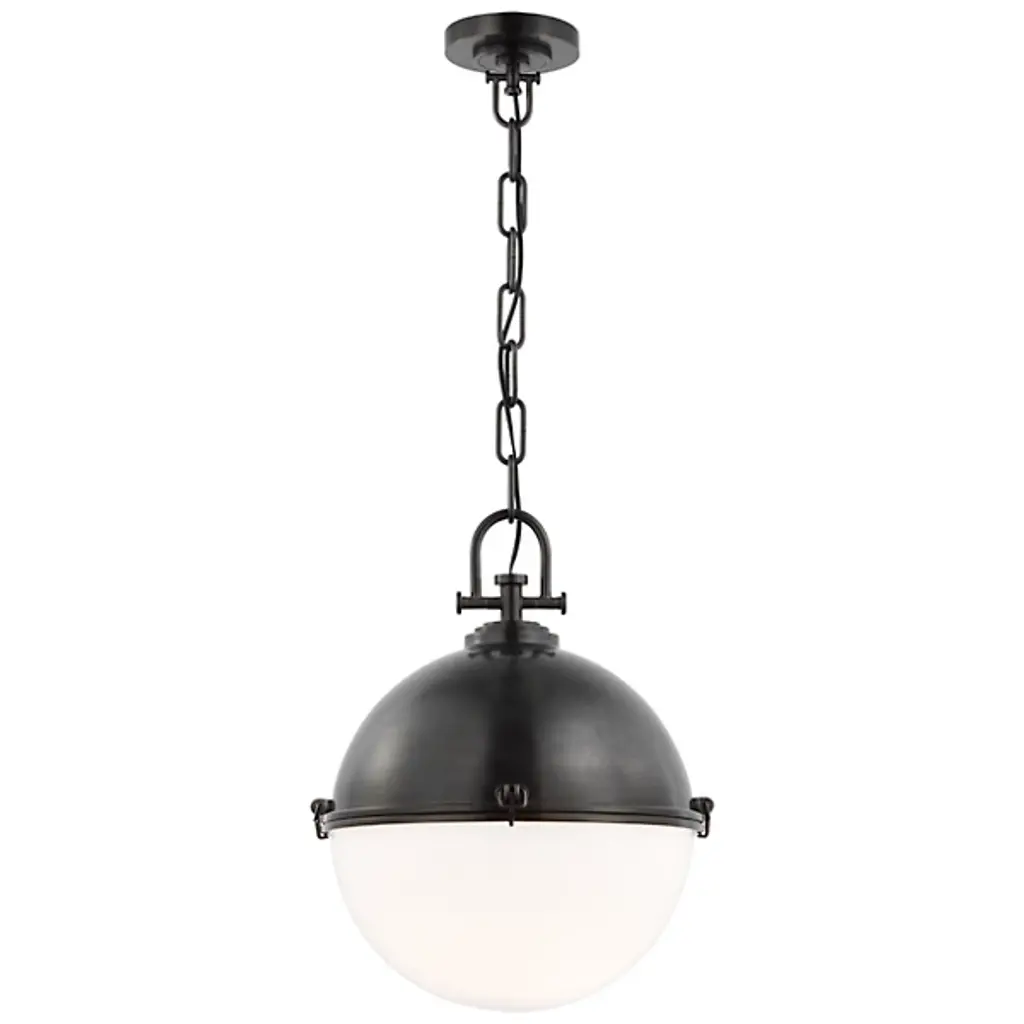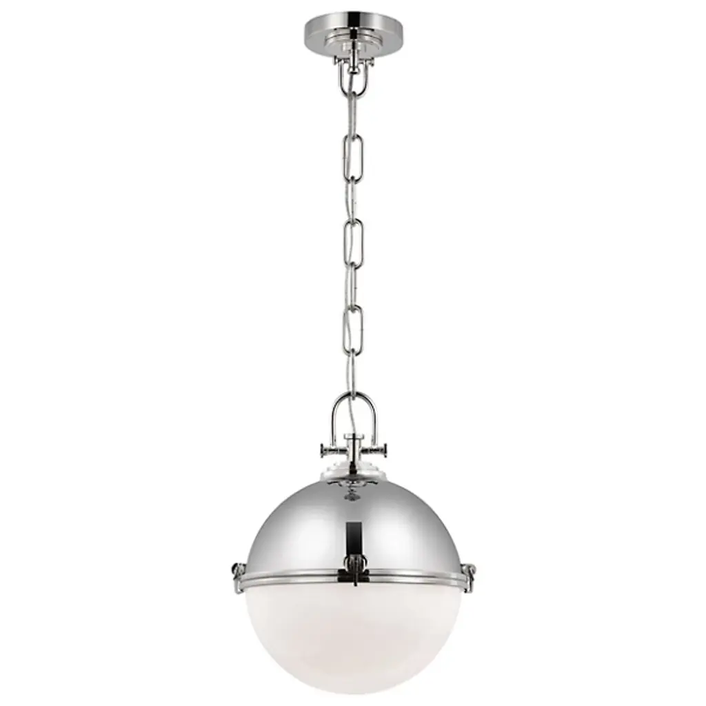 A stylish, simple lamp with a bold retro touch. The Adrian Globe Pendant from Visual Comfort Signature, formerly known as Visual Comfort, extends down from a stepped circular canopy along a robust length of large chain links. The chain terminates in a stirrup-shaped finial that positions potent, damp-listed lamping beneath a robust metal dome shade. The shade features a series of evenly-spaced bolts that run around its lower surface, securing a matching white glass dome below to create a vintage-inspired sphere structure that transforms direct light into an even layer of ambiance that suffuses its surroundings.