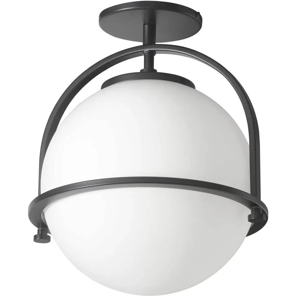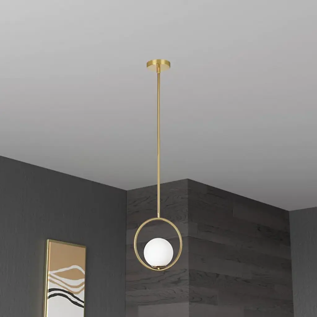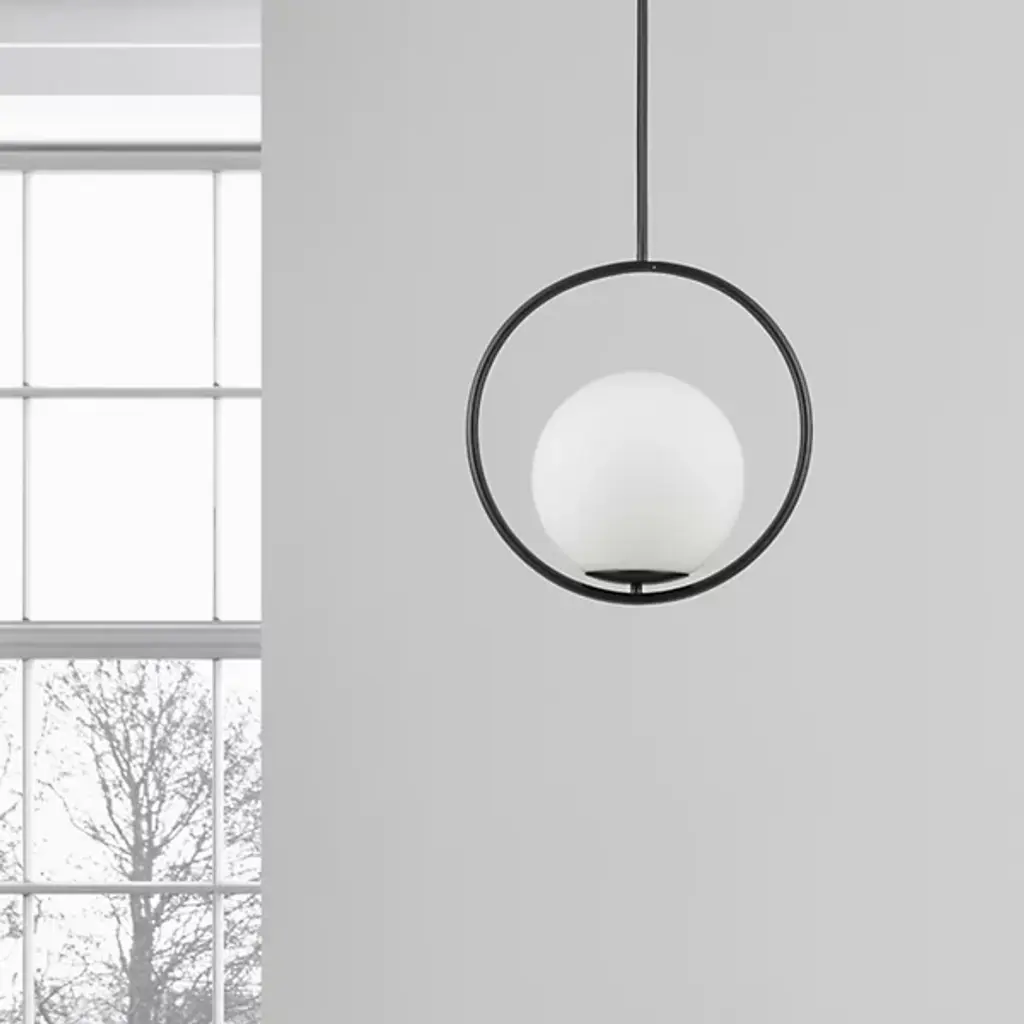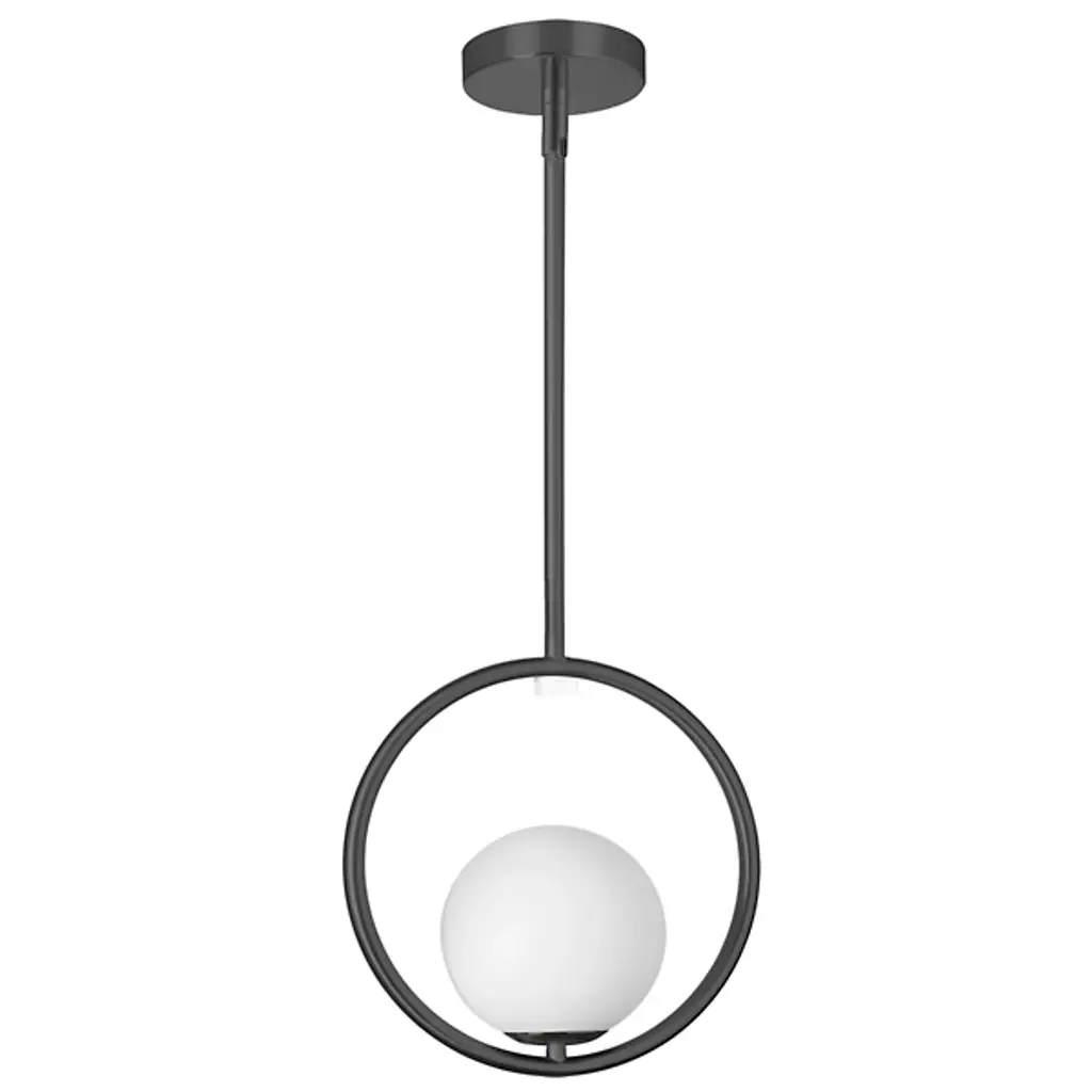 An appealing modern piece thanks to a balance of simplicity and elegance, the Adrienna Pendant from Dainolite shapes the atmosphere of the space around it. Made of smooth metal, this piece consists of a single downrod that drops from a rounded ceiling mount, and a wide, open ring at the end of the downrod holds a crisp glass globe. The globe rests on a brief pedestal and contains a single bulb as it rests comfortably within the ring. The bulb emits a bright and even glow that diffuses soothingly out of the material and into the home.