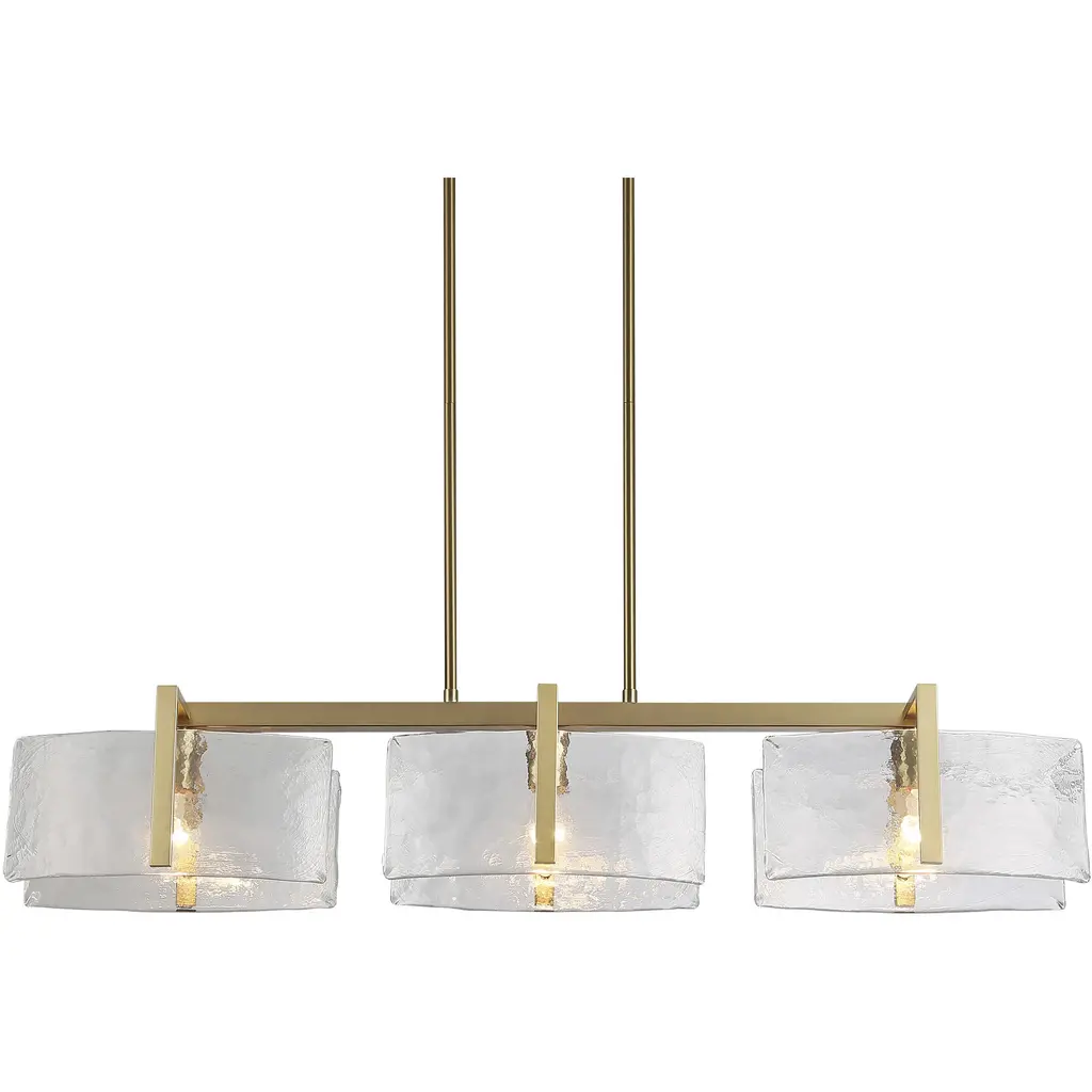 Bring Nature-Inspired elegance into your home with the Golden Lighting Aenon 3-light Island Light in Pewter. Featuring a glass shade and a pewter frame, it creates a welcoming atmosphere.The hammered water glass shade features a deeply irregular texture that captures and refracts light, casting mesmerizing patterns akin to natural elements like water and ice. Each piece showcases artisanal craftsmanship that elevates the beauty of this fixture.Our pewter finish offers a soft and timeless alternative to brighter silver tones, with a medium-grey hue that adds warmth to your interiors. This classic finish is created through a durable electroplating process, complemented by a satin luster that gently diffuses light for an elegant, non-glare glow.Specifically designed for kitchen islands, this fixture is dry location rated, making it ideal for indoor spaces not subject to moisture such as hallways and living rooms. The fixture is sloped-ceiling compatible and features an adjustable height from 8.875" to 53.75" for flexibility in any space.Overall dimensions are 40.5"W x 8.13"H x 8.88"D, and it requires 3 E26 Medium base bulbs (not included), with a maximum wattage of 100 each.Enhance your home with this high-quality fixture that reflects both artistry and functionality, adding a luxurious touch to your kitchen design.