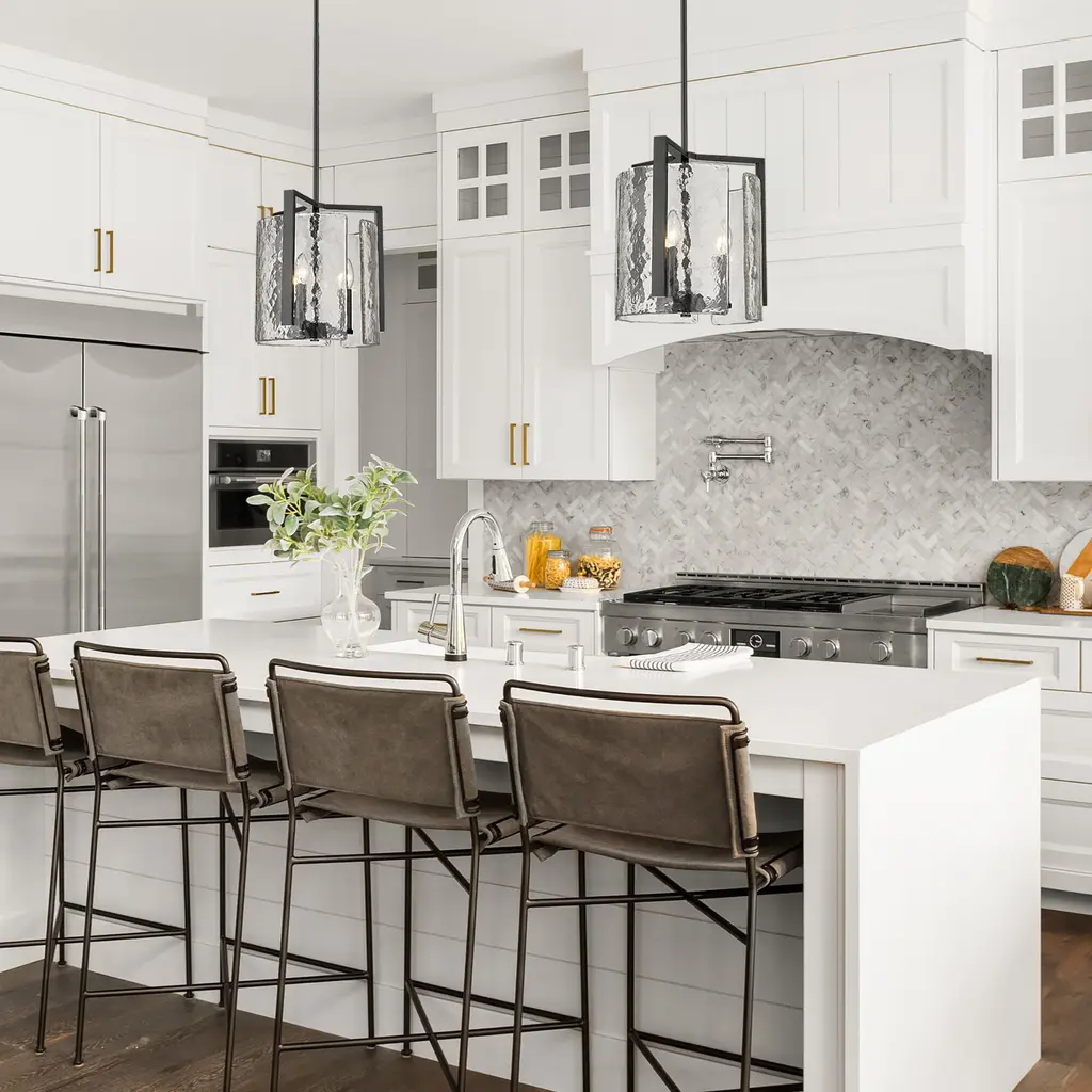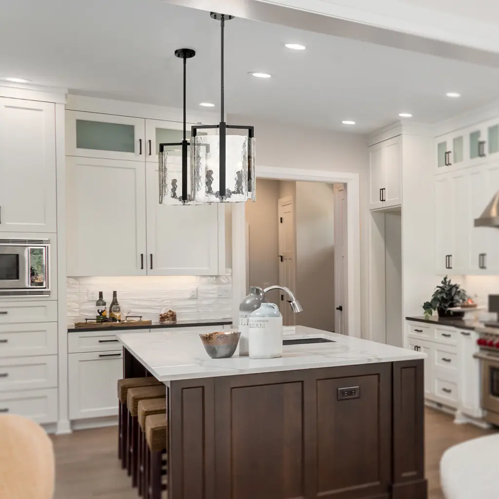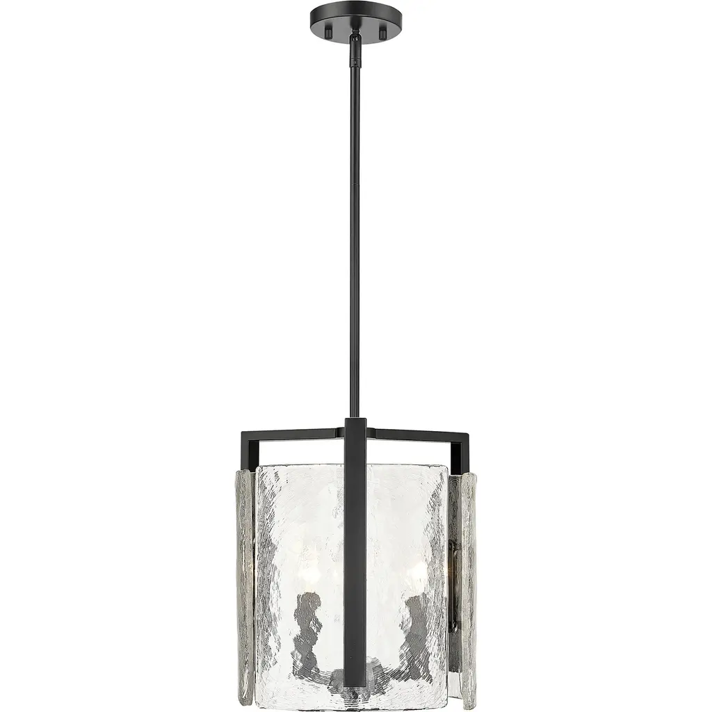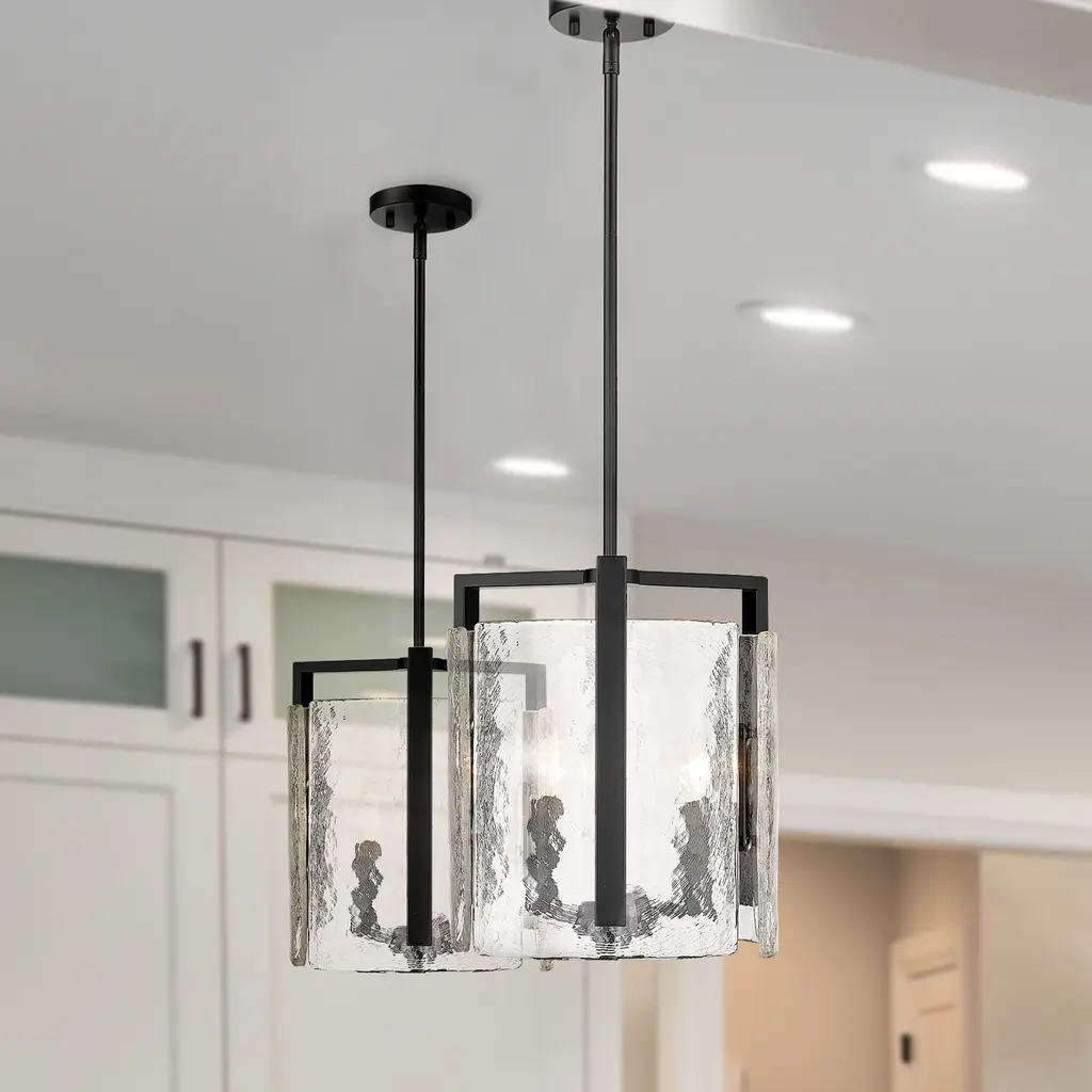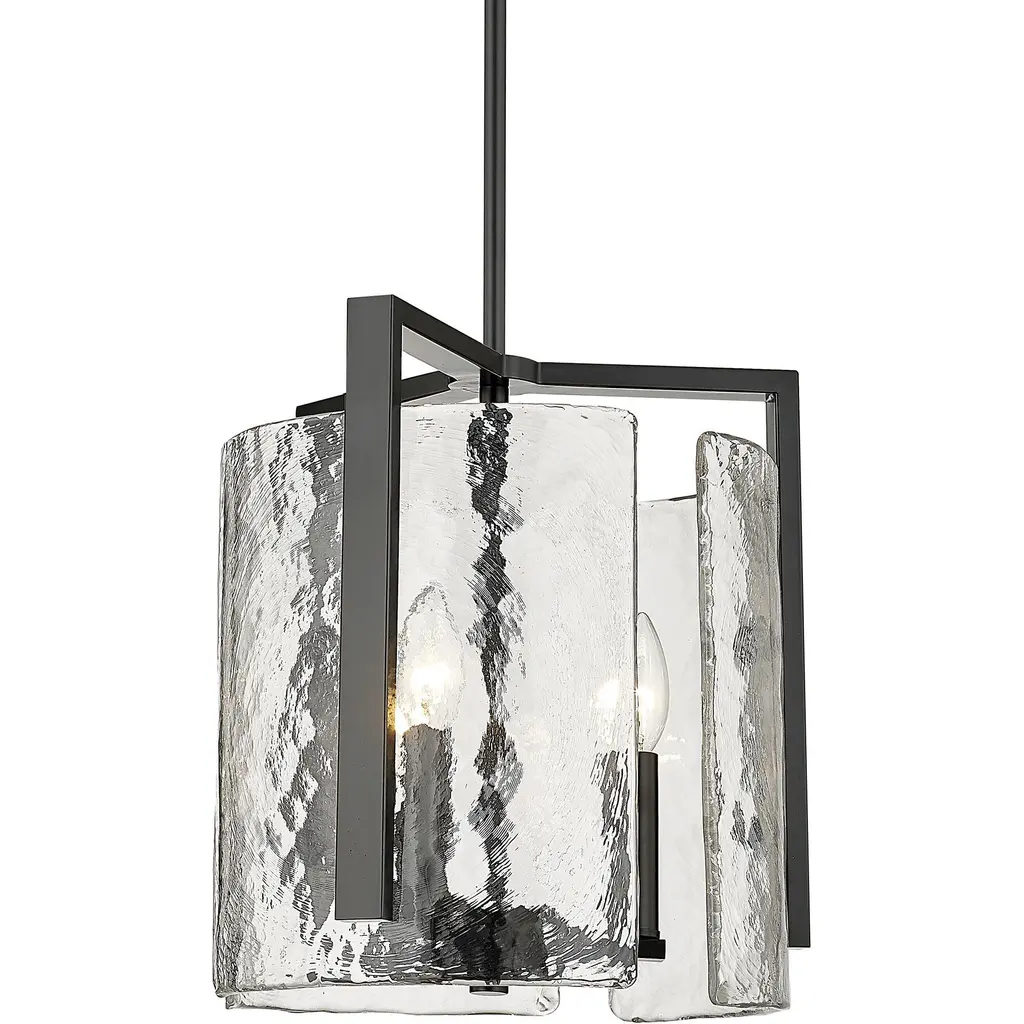 Bring nature-inspired elegance into your home with the Golden Lighting Aenon 3-light Pendant in Matte Black. Featuring a glass shade, it creates a welcoming atmosphere. This glass shade captures elemental beauty with its hammered water design that creates a beautifully distorted and refractive light effect.The matte black finish is the epitome of clean, modern style, offering timeless versatility that's smooth to the touch and complements various decor styles, from minimalist and industrial to bold contemporary. Ideal for kitchens, dining rooms, and bedrooms, this pendant is dry location rated for indoor spaces. Easily install it on angled ceilings and customize the hanging length for your space with its adjustable height feature (Min: 13.625"- Max: 58.25"). Overall dimensions are 13"W x 13.63"H x 13"D, and it requires three E12 candelabra base bulbs (not included), with a maximum wattage of 60 per bulb. The Aenon Pendant is not only a stylish statement piece but also designed with quality craftsmanship, enhancing your interior with its artistry and elegance.