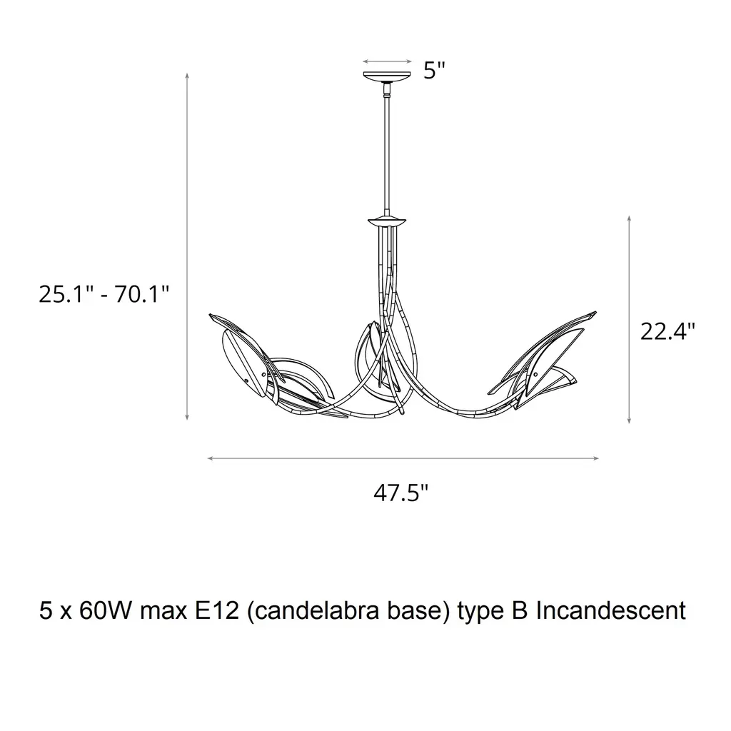 The large-scale Aerial Pendant strikes an artistic balance of materials. Leaf-like steel forms are complimented by art glass—created through heating and draping over contoured forms. Asymmetrical and organic design lends itself to the botanical feel of the fixture. Adjustable 5-light pendant chandelier with frosted glass and finish options. Features
