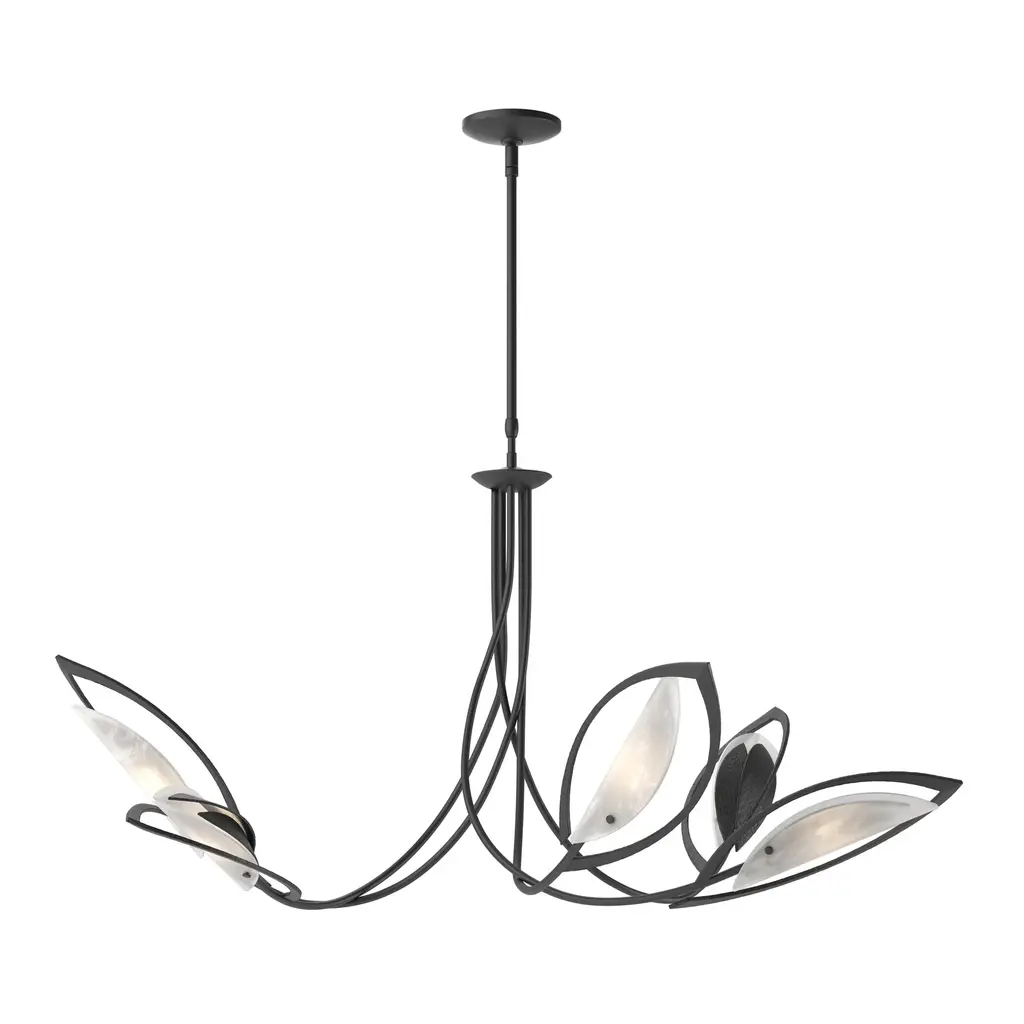 The large-scale Aerial Pendant strikes an artistic balance of materials. Leaf-like steel forms are complimented by art glass—created through heating and draping over contoured forms. Asymmetrical and organic design lends itself to the botanical feel of the fixture. Adjustable 5-light pendant chandelier with frosted glass and finish options. Features