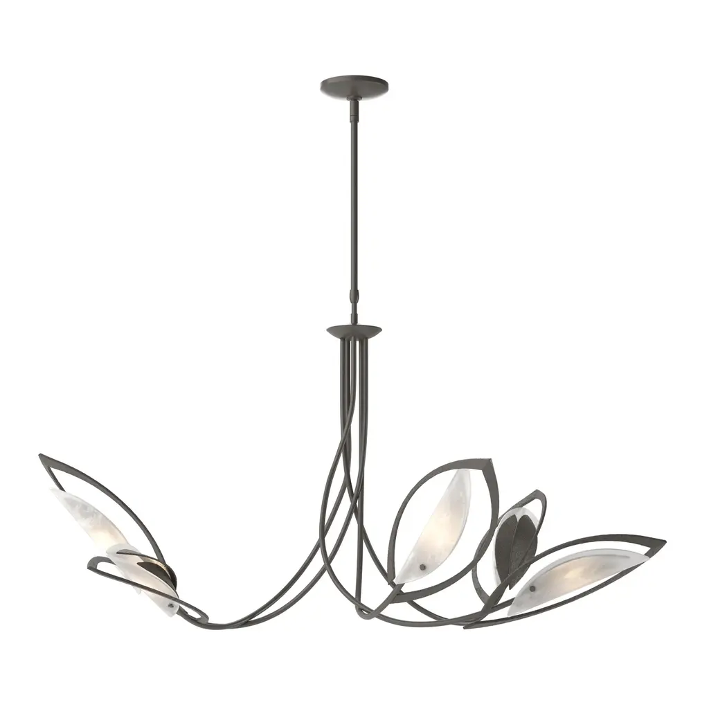 The large-scale Aerial Pendant strikes an artistic balance of materials. Leaf-like steel forms are complimented by art glass—created through heating and draping over contoured forms. Asymmetrical and organic design lends itself to the botanical feel of the fixture. Adjustable 5-light pendant chandelier with frosted glass and finish options. Features