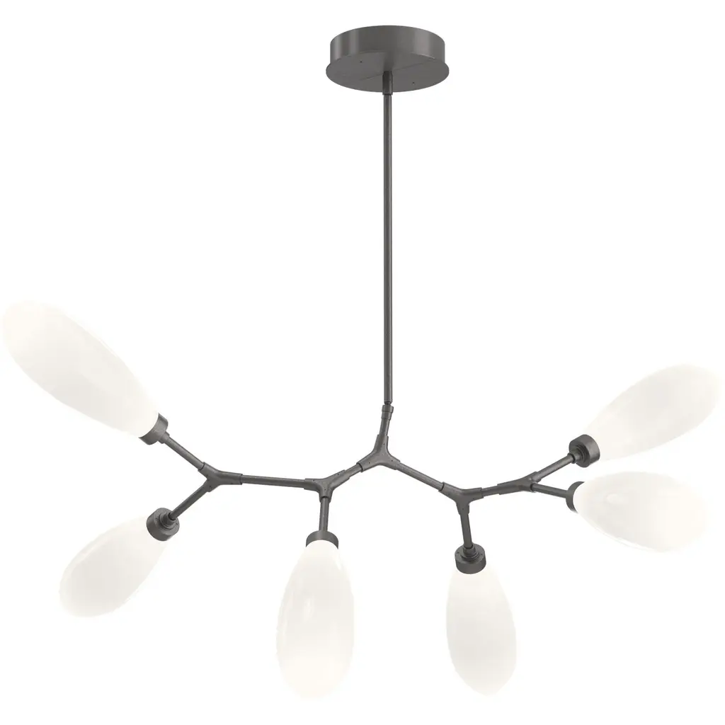 The large-scale Aerial Pendant strikes an artistic balance of materials. Leaf-like steel forms are complimented by art glass—created through heating and draping over contoured forms. Asymmetrical and organic design lends itself to the botanical feel of the fixture. Adjustable 5-light pendant chandelier with frosted glass and finish options. Features