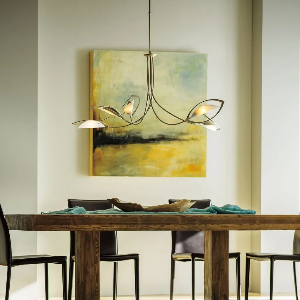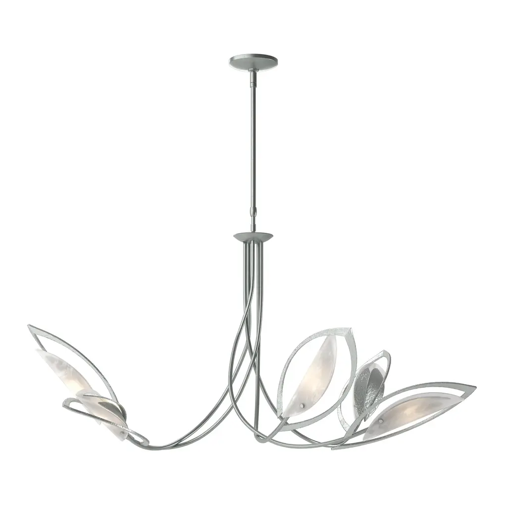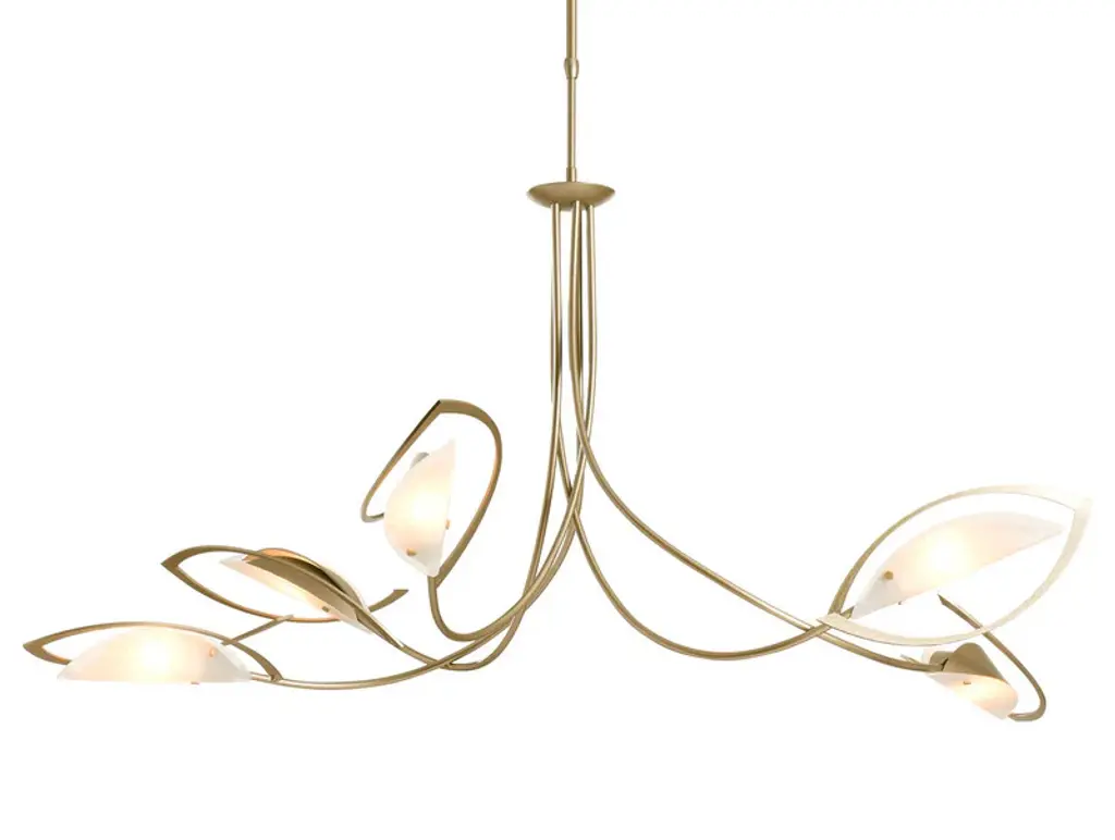 The large-scale Aerial Pendant strikes an artistic balance of materials. Leaf-like steel forms are complimented by art glass—created through heating and draping over contoured forms. Asymmetrical and organic design lends itself to the botanical feel of the fixture. Adjustable 5-light pendant chandelier with frosted glass and finish options. Features