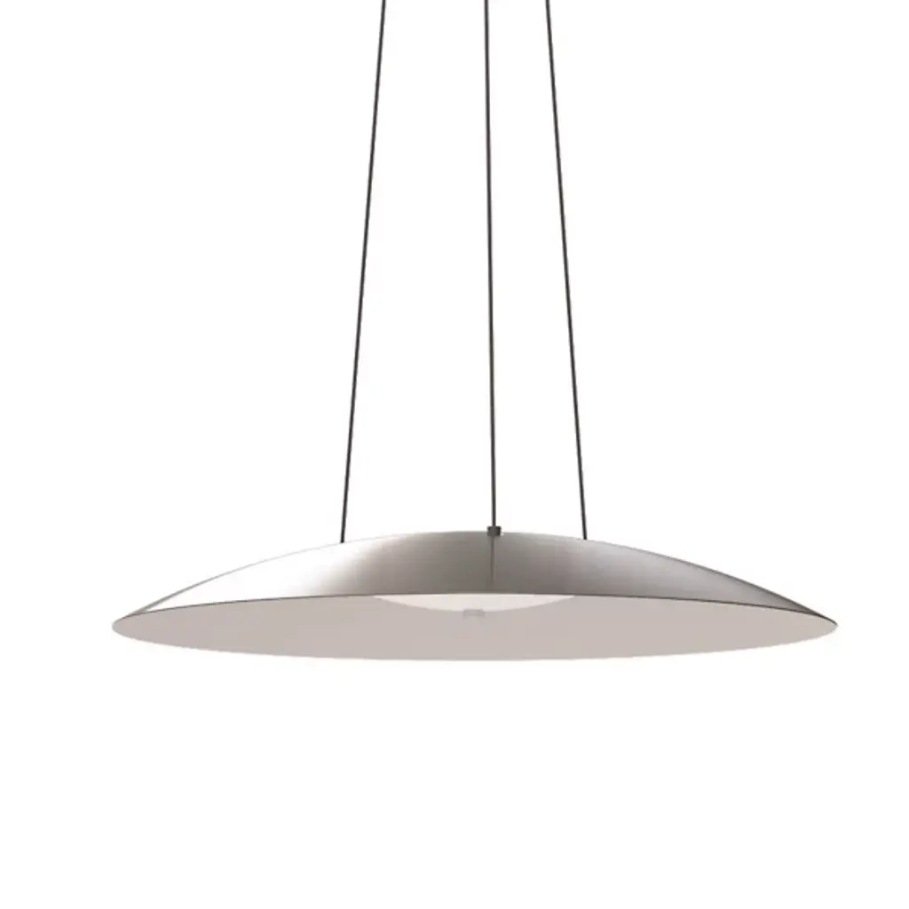 Smoothly shaped with an airy style, the Aero LED Pendant by Blackjack Lighting offers a unique accent to its surroundings. Designed in 2018 by Stephen Blackman, its surprisingly simple structure starts with a dome canopy that sends down three evenly spaced wires to a wide dish shade of spun aluminum below. Illumination is provided by a powerful integrated LED, restrained by the shade’s sides, and focused by the smooth interior to a broad pool of downlight.