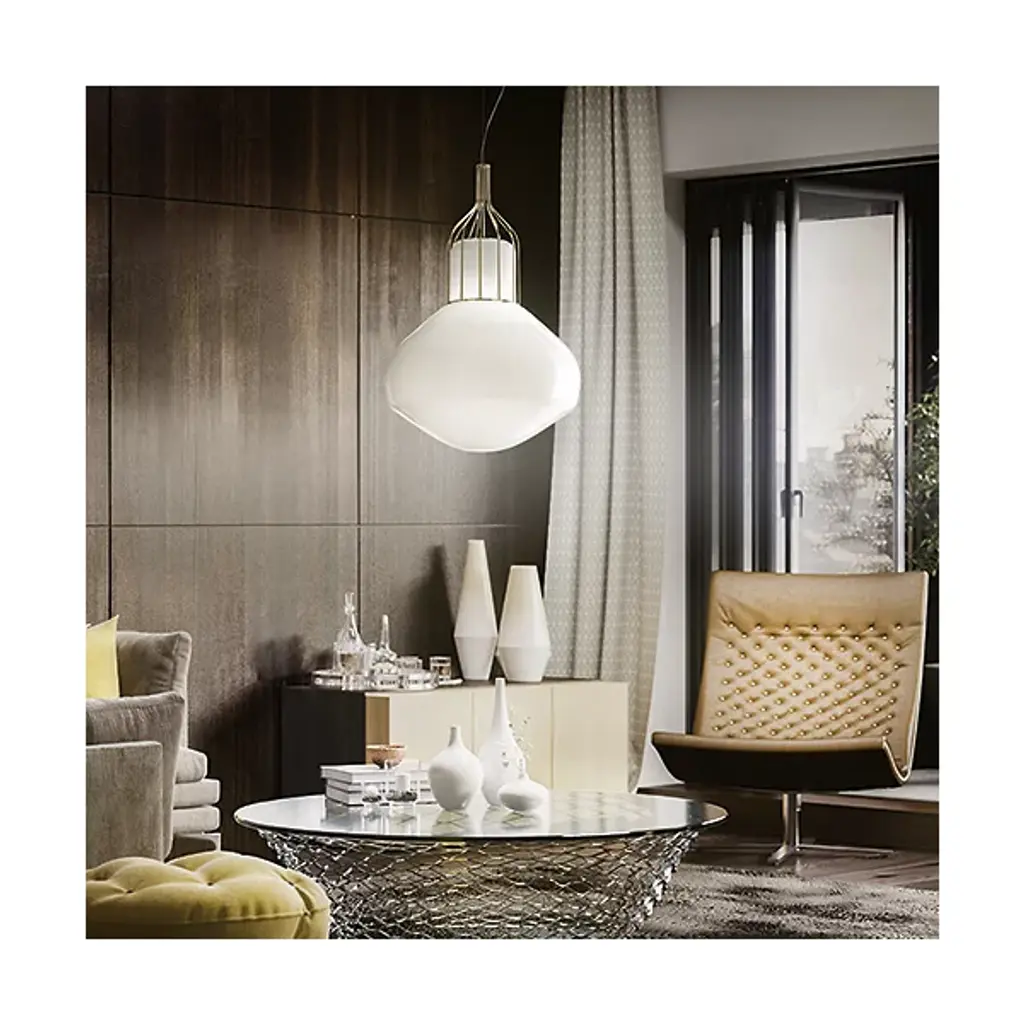 Subtle beauty and a relaxing glow make the Aerostat Cage Pendant by Fabbian a welcoming addition to any space. It's designed by Guillaume Delvigne and boasts a durable metal cage structure along with a white blown glass shade. This fixture comes with a gorgeous polished canopy and is available in various finishes and sizes to best match your home décor layout.