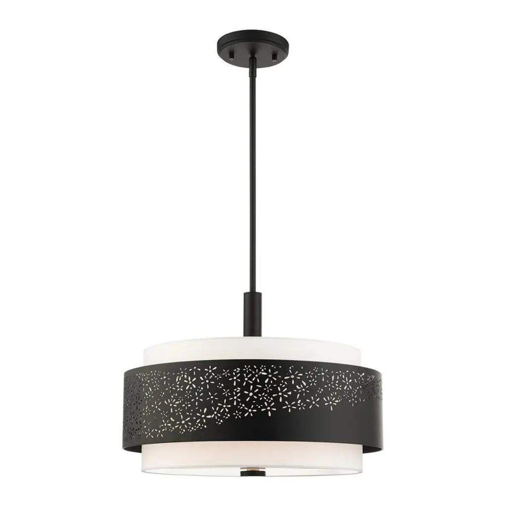 Stylish contemporary LED pendant with a metal geometric pattern accent. Full white acrylic diffuser on side and bottom. Available in three sizes. 3 ft. adjustable ridged stem and aircraft cable expandable to 9 ft. Stylish contemporary pendant with a metal geometric pattern accent / 3 ft. adjustable ridged stem and aircraft cable expandable to 9 ft / Available in three sizes / TRIAC/ELV / White acrylic diffuser. ,