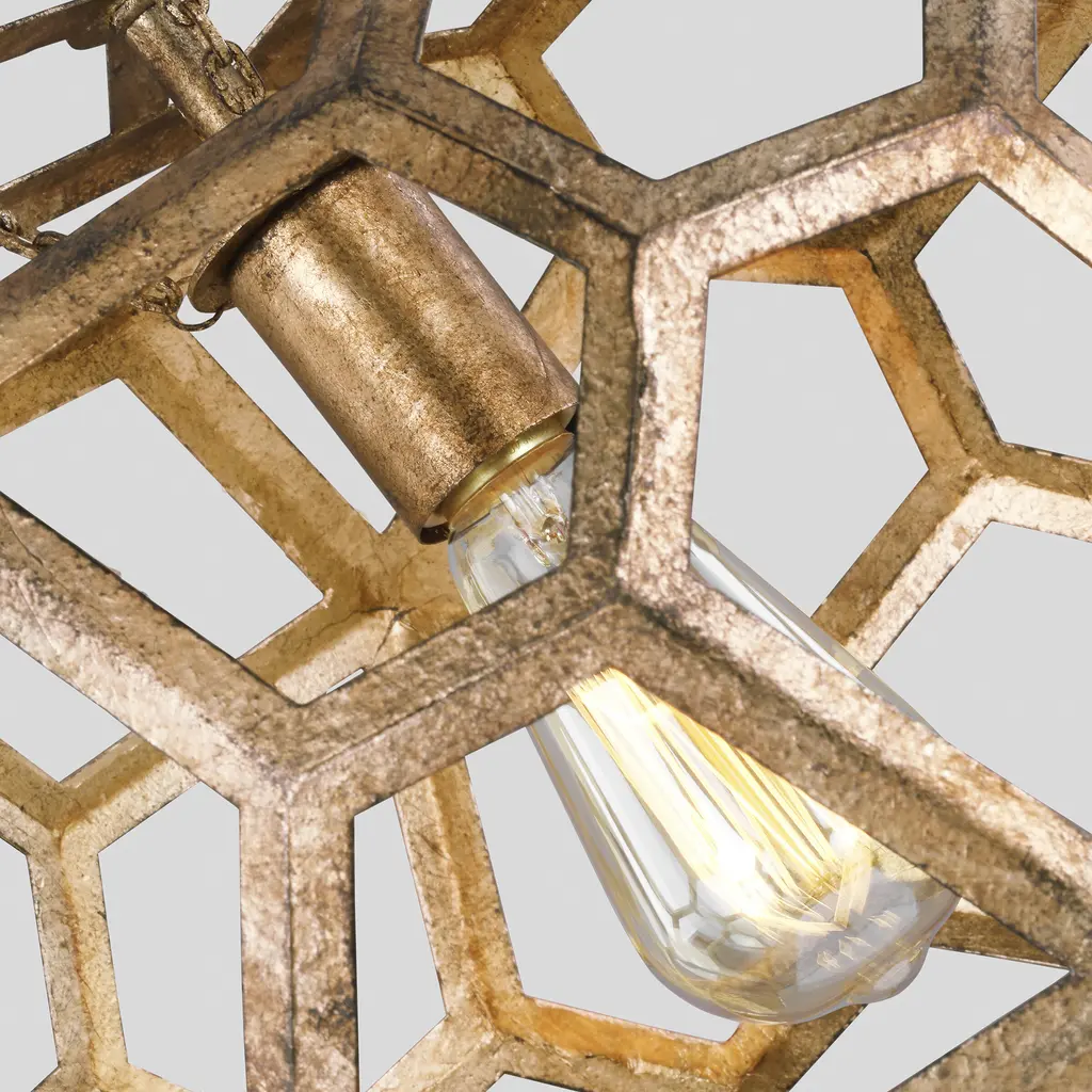 The Alexa Hampton Feccetta one light indoor pendant in antique gild is elegantly charming with a Mid-Century Modern appeal. The fixture is suspended by matching polished brass chain links, and both the shade and socket are held by three smaller chain links. The combination of its circular form with hexagonal shaped cut-out frame, illuminates light from any choice of lamping and can be elegantly placed as the focal point over an island or kitchen table. Alexa Hampton is an industry force who honors tradition and commits to the future, providing smart, stylish, design-rich solutions for every aspect of the home.