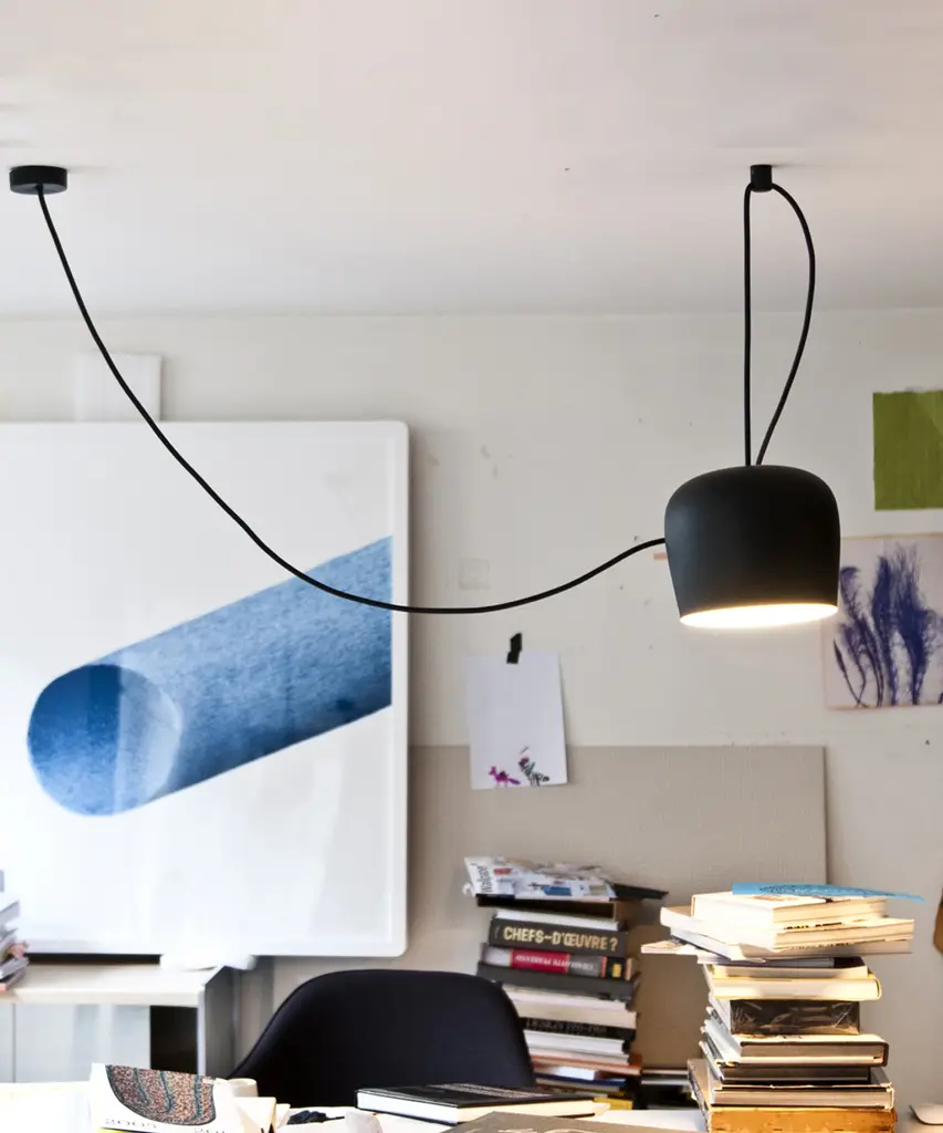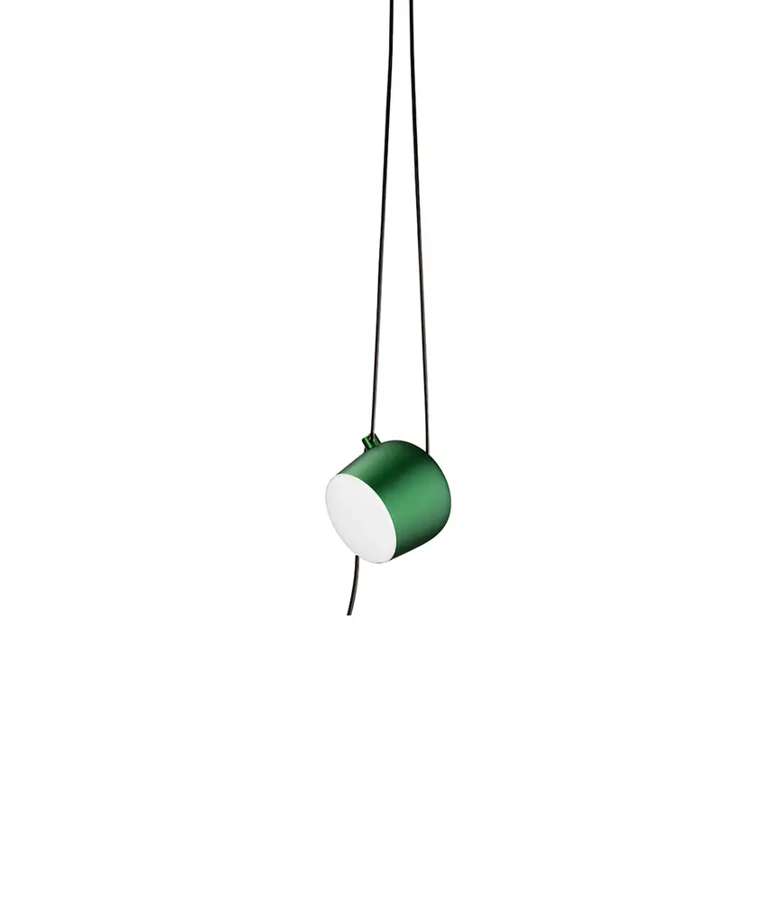 Created by the Bouroullec brothers in 2010, the AIM ceiling light is a design stripped to its most basic and beautiful essence. This innovative form of modern pendant lighting is constructed from a varnished aluminum sheet with a photo-etched optical PC (polycarbonate) shade. The internal reflector is photo-etched ABS. The cable can be adjusted to allow the fixture head and light distribution to be aimed in whatever way you choose. The cable has a total length of 354" long = 29.50 feet = 9 MT. Available in classic white, black, and bronze in addition to new lively colors introduced in 2021 Anodized Blue Steel, Anodized Green, and Anodized Light Silver. The AIM pendant provides direct lighting and is available in two versions: hardwired or plug-in. 1. AIM - Hardwired: Connects to wall-switch by hardwiring to a 120V junction box (no additional LED driver is required). Comes with a 5" diameter canopy.2. AIM - Plug-in: Switch and cord that you can plug into a socket, non-dimmable. The inspiration behind the design: When they created the AIM ceiling light, brothers Ronan and Erwan Bouroullec wanted to keep their core essence limited to the source of light and its cord. By doing that, they ensured that the AIM is versatile enough for any setting not only because of its appearance, but also because it provides a convenient, easily "aimed" light. This authentic design is produced in Italy exclusively by Flos.