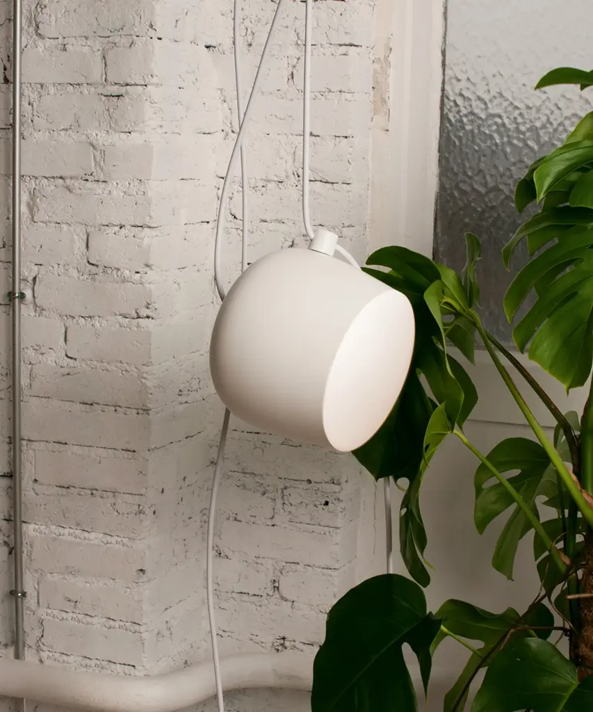 Created by the Bouroullec brothers in 2010, the AIM ceiling light is a design stripped to its most basic and beautiful essence. This innovative form of modern pendant lighting is constructed from a varnished aluminum sheet with a photo-etched optical PC (polycarbonate) shade. The internal reflector is photo-etched ABS. The cable can be adjusted to allow the fixture head and light distribution to be aimed in whatever way you choose. The cable has a total length of 354" long = 29.50 feet = 9 MT. Available in classic white, black, and bronze in addition to new lively colors introduced in 2021 Anodized Blue Steel, Anodized Green, and Anodized Light Silver. The AIM pendant provides direct lighting and is available in two versions: hardwired or plug-in. 1. AIM - Hardwired: Connects to wall-switch by hardwiring to a 120V junction box (no additional LED driver is required). Comes with a 5" diameter canopy.2. AIM - Plug-in: Switch and cord that you can plug into a socket, non-dimmable. The inspiration behind the design: When they created the AIM ceiling light, brothers Ronan and Erwan Bouroullec wanted to keep their core essence limited to the source of light and its cord. By doing that, they ensured that the AIM is versatile enough for any setting not only because of its appearance, but also because it provides a convenient, easily "aimed" light. This authentic design is produced in Italy exclusively by Flos.
