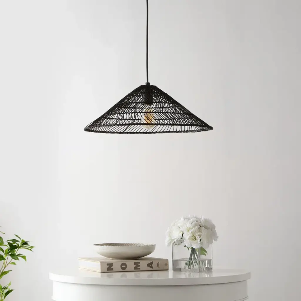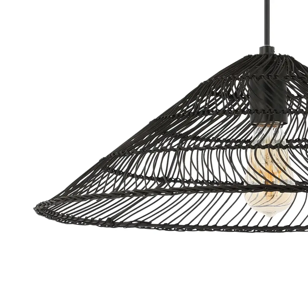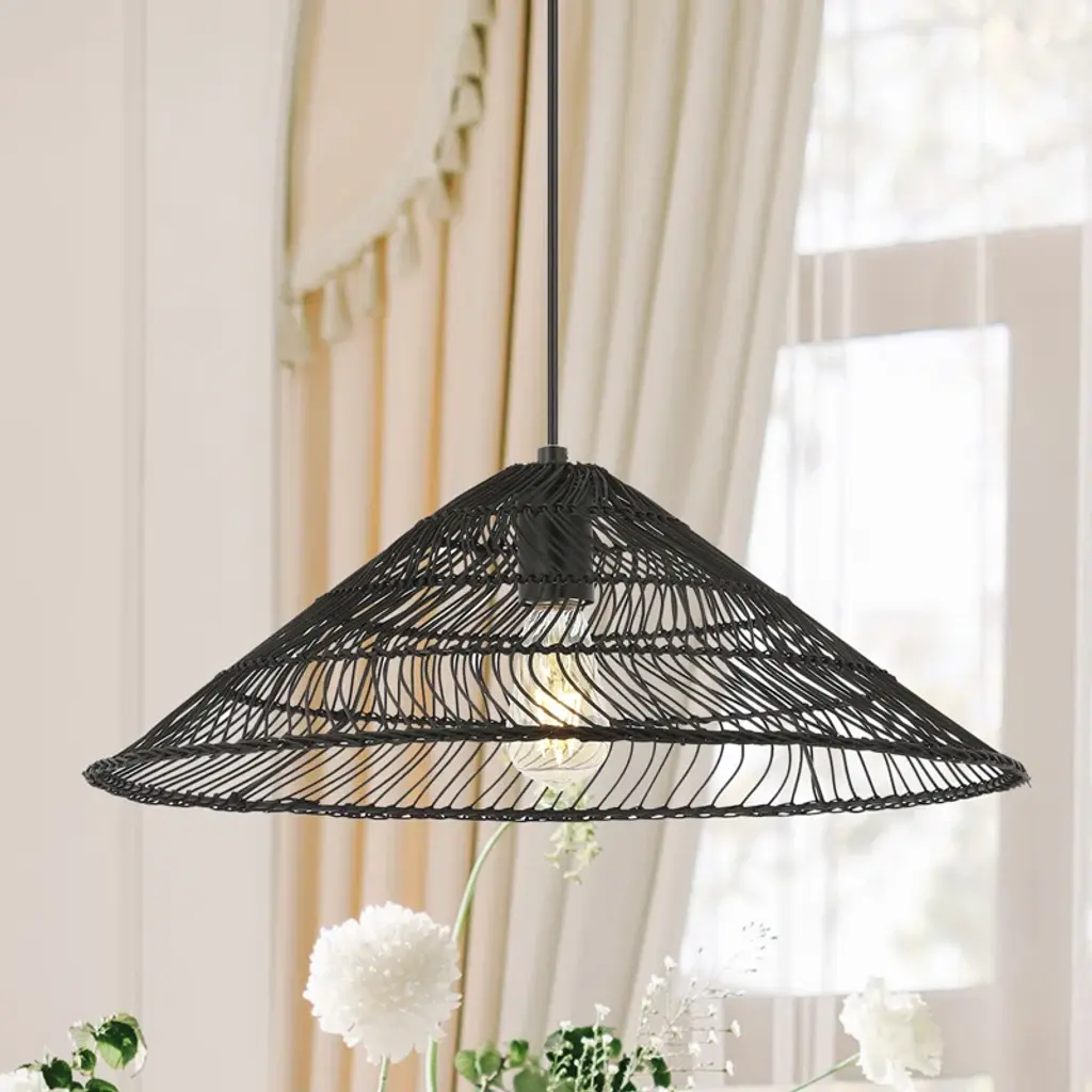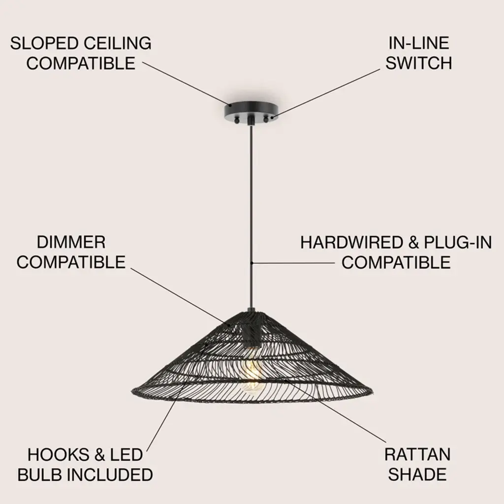 Modern design meets traditional craftsmanship in our classic cone-shaped rattan pendant. A single LED bulb provides bright, warm light. Made from natural rattan woven onto a sturdy metal frame, this ceiling fixture adds a retro touch to your living room, bedroom, or dining room. Plug in or hardwire.