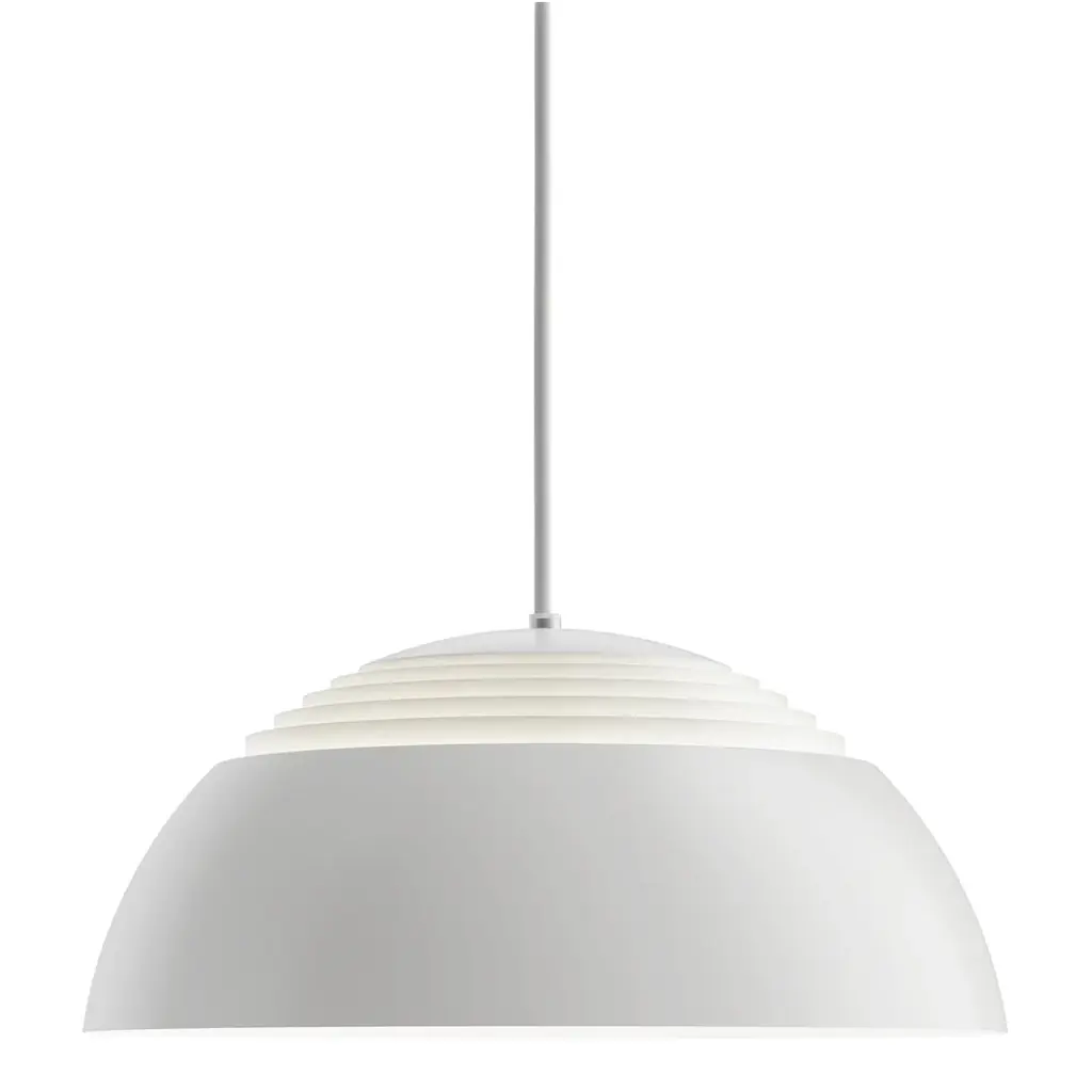 AJ Royal is among the Arne Jacobsen designs developed in 1957 for the SAS Royal Hotel in Copenhagen (Radisson Collection). Here it could be found in a copper version above the tables in the snack bar behind the atrium, in the lounge on the 1st floor and in the Panorama Lounge on the 21st floor. The hotel opened in 1960 and with its 22 floors it gave Copenhagen its first real high-rise building heavily inspired by New York skyscrapers. In those days, the lamp was simply called the AJ Pendant. The segmented spherical design from 1958 is regarded as Jacobsen's first steps back to the basic geometrical shapes that characterize the world-famous Danish architect's later designs. The AJ Royal formed part of the overall design concept that Jacobsen developed for the hotel, of which a number of designs have achieved iconic status. Jacobsen did not only design the hotel down to the smallest detail for SAS (Scandinavian Airlines), he also designed nearly all the hotel's original furniture and utility items. The lamps are probably the most well-known globally, including the AJ Lamp from 1957. The AJ Royal was originally produced in three colors: light grey, dark brown and black. Today, the AJ Royal is available in white in its two original sizes. A smaller variant is introduced in 2020 to celebrate the 60th anniversary of the opening of the hotel, just as the series is reintroduced in black. The AJ Royal retains its classic, graphic look as sharply as ever – irrespective of whether it lights up a dining table, is used in an office, or a showroom, where it ensures an even and flawless downward light and generates ambience with its softened upward light.