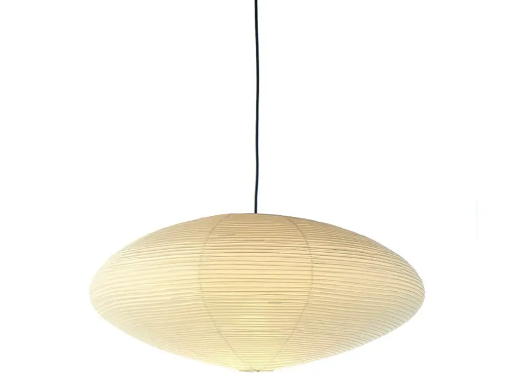 Akari is a suspension lamp with Japanese paper lampshade.The Akari Light Sculptures (1951) by Isamu Noguchi are a series of luminaires, handcrafted from traditional washi paper by Japanese artisans.The oeuvre of Japanese-American artist and designer Isamu Noguchi (1904–1988) is unusually multi-faceted. In addition to sculptures, he also created stage sets, furniture, lighting and interiors, as well as outdoor plazas and gardens. As a sculptor, his interest was not restricted to materials and form, but also extended to spatial effects and interior designs. Noguchi intended his art to serve both practical and social functions, and his sculptural style exerted a lasting influence on the idiom of organic design in the 1950s.In 1951 Isamu Noguchi began to design the Akari Light Sculptures, works characterised by weightless luminosity. He chose the name 'akari' for these objects, a word that means 'light' in Japanese, connoting both illumination and physical lightness. During a journey to Japan, Noguchi paid a visit to Gifu, a town known for its manufacture of paper parasols and lanterns. While there he sketched his first two Akari Light Sculptures, and over the following years he created a total of more than 100 models, consisting of table, floor and ceiling lamps ranging in size from 24 to 290 cm.Each luminaire is meticulously crafted by hand in the Ozeki workshop, a traditional family-run company based in Gifu. In a first step, bamboo rods are stretched across the original wooden forms designed by Noguchi to make the framework that determines the object's shape. Washi paper, derived from the bark of the mulberry tree, is cut in strips to fit the size and shape of the lamp and then glued to the bamboo ribbing. After the glue has dried, the wooden form is removed and the shade can be folded. The Akari Light Sculptures are packed for shipping or storage in flat boxes developed especially for the luminaires.'The harshness of electricity is thus transformed through the magic of paper back to the light of our origin – the sun – so that its warmth may continue to fill our rooms at night.'Isamu NoguchiThe Akari Light Sculptures are marked with a stylised sun-and-moon logo, which also resembles the corresponding Japanese characters. This symbol guarantees the authenticity of each product.