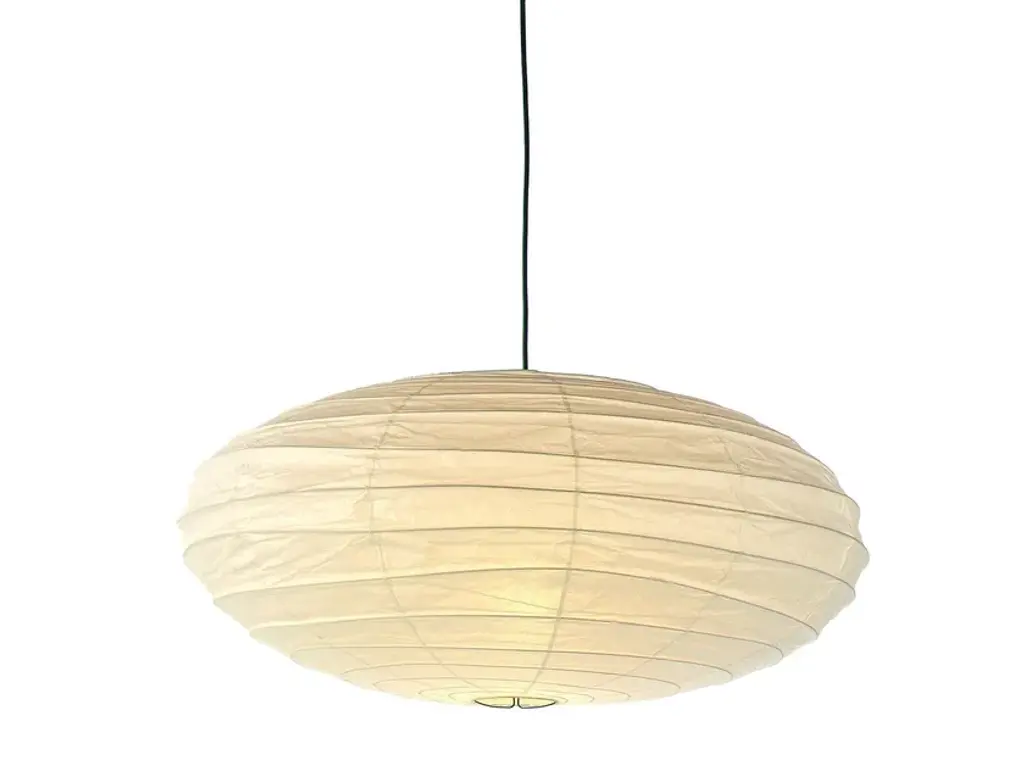Akari is a suspension lamp with Japanese paper lampshade.The Akari Light Sculptures (1951) by Isamu Noguchi are a series of luminaires, handcrafted from traditional washi paper by Japanese artisans.The oeuvre of Japanese-American artist and designer Isamu Noguchi (1904–1988) is unusually multi-faceted. In addition to sculptures, he also created stage sets, furniture, lighting and interiors, as well as outdoor plazas and gardens. As a sculptor, his interest was not restricted to materials and form, but also extended to spatial effects and interior designs. Noguchi intended his art to serve both practical and social functions, and his sculptural style exerted a lasting influence on the idiom of organic design in the 1950s.In 1951 Isamu Noguchi began to design the Akari Light Sculptures, works characterised by weightless luminosity. He chose the name 'akari' for these objects, a word that means 'light' in Japanese, connoting both illumination and physical lightness. During a journey to Japan, Noguchi paid a visit to Gifu, a town known for its manufacture of paper parasols and lanterns. While there he sketched his first two Akari Light Sculptures, and over the following years he created a total of more than 100 models, consisting of table, floor and ceiling lamps ranging in size from 24 to 290 cm.Each luminaire is meticulously crafted by hand in the Ozeki workshop, a traditional family-run company based in Gifu. In a first step, bamboo rods are stretched across the original wooden forms designed by Noguchi to make the framework that determines the object's shape. Washi paper, derived from the bark of the mulberry tree, is cut in strips to fit the size and shape of the lamp and then glued to the bamboo ribbing. After the glue has dried, the wooden form is removed and the shade can be folded. The Akari Light Sculptures are packed for shipping or storage in flat boxes developed especially for the luminaires.'The harshness of electricity is thus transformed through the magic of paper back to the light of our origin – the sun – so that its warmth may continue to fill our rooms at night.'Isamu NoguchiThe Akari Light Sculptures are marked with a stylised sun-and-moon logo, which also resembles the corresponding Japanese characters. This symbol guarantees the authenticity of each product.
