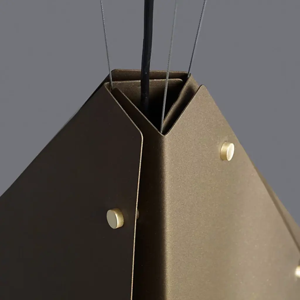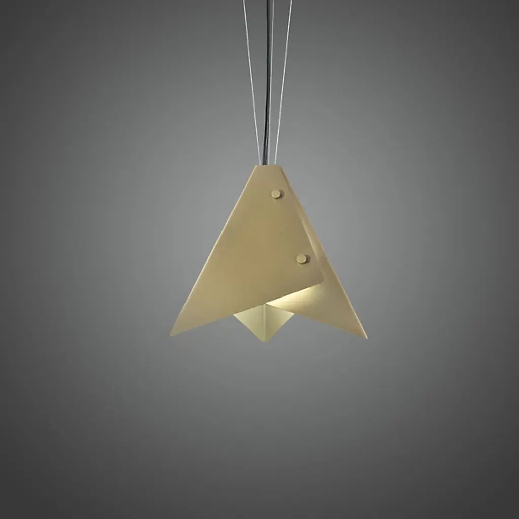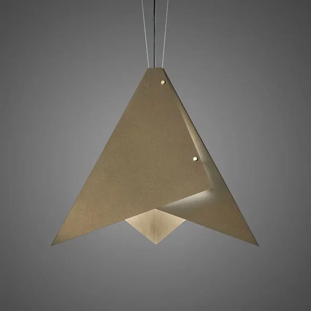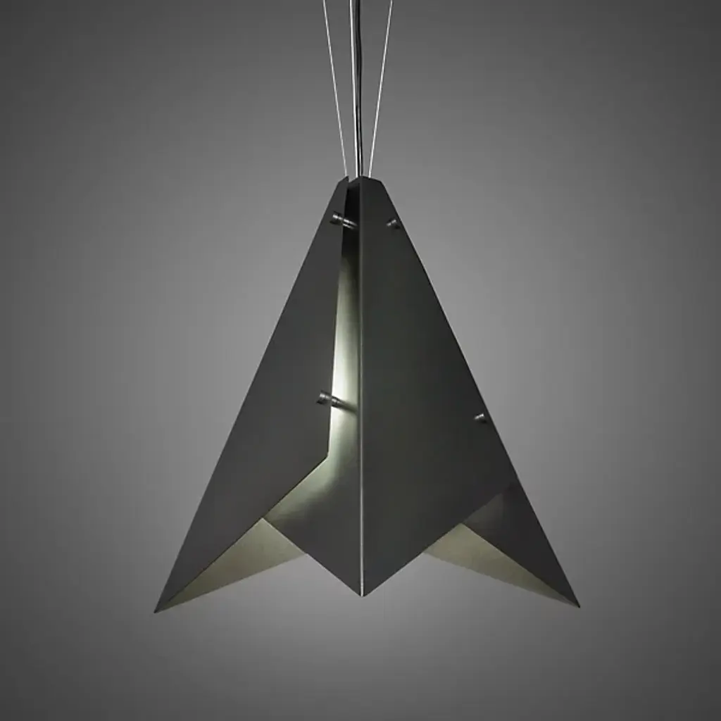 Sleek sophistication. The Akira 21469 Pendant from Ultralights is a statement-making piece, fashioning its silhouette like beautiful origami. The contemporary pendant gives off a futuristic vibe with dynamic geometry. Made from metal, the shade is crafted from folded panels. The panels combine with fine caps to create an elegantly tapered form with complex edges. Bulbs nestle inside for a pleasant glare-free experience. The bulbs produce a gentle light that glazes the sleek shade's internal walls. Light spills out the bottom as a clean down glow.