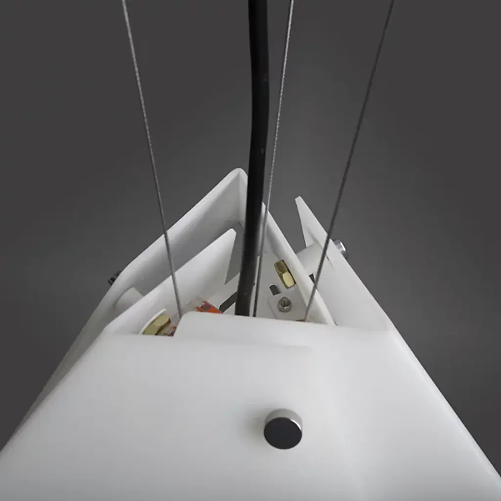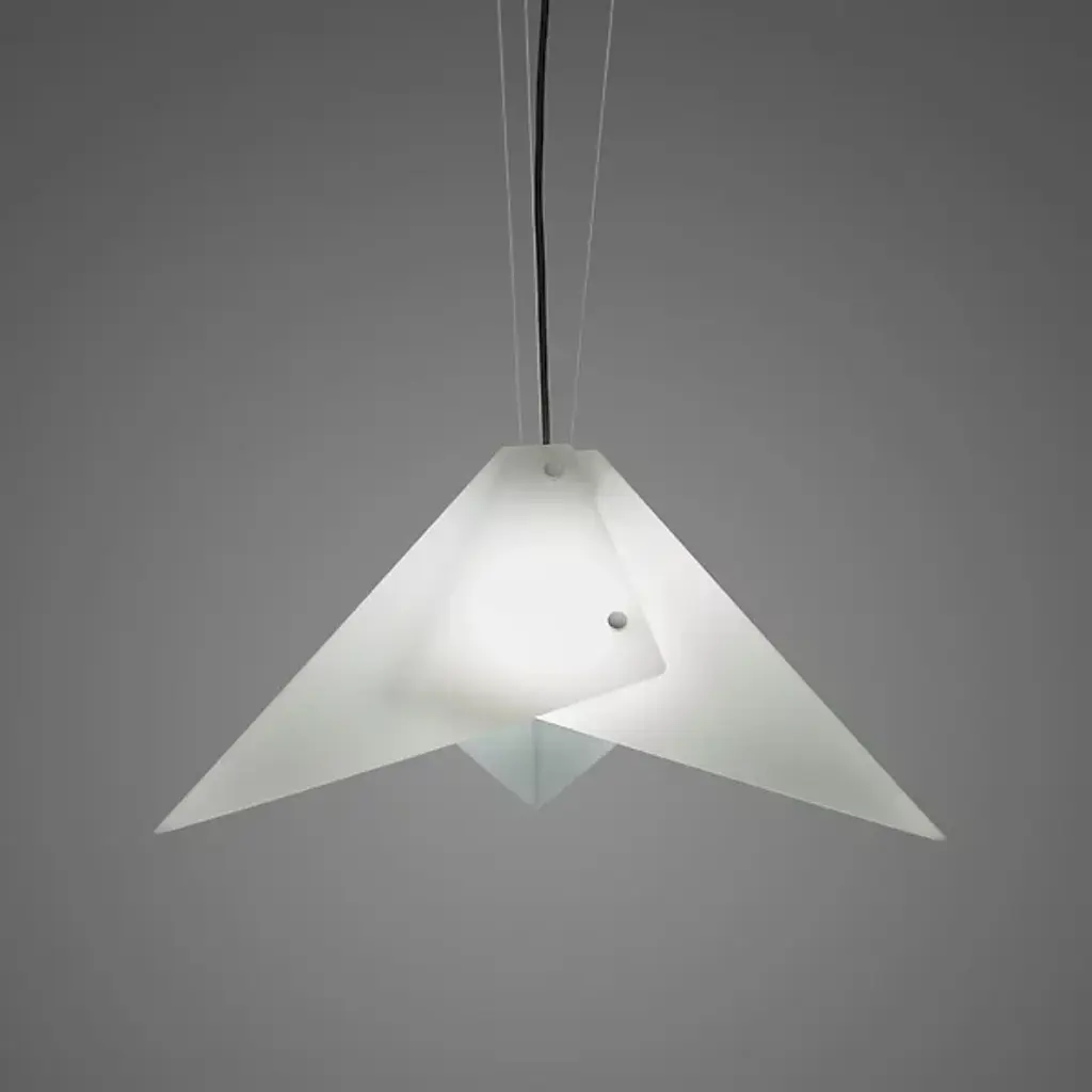 Be at the cutting-edge of contemporary design with the origami-like visuals of the Akira 21470 Acrylic Pendant from Ultralights. This forward-thinking piece presents simple geometry with a sense of dynamism. Opal acrylic shapes are folded and overlapped to create an ultra-sleek take on the familiar lamp shade. Metal accents fastening the acrylic shapes together give the piece a crafted quality. As light passes through the layered acrylic, it creates a seductive display of bright and mellow tones. Outpouring light creates a pleasant ambiance and lays a soft down glow over a surface below.
