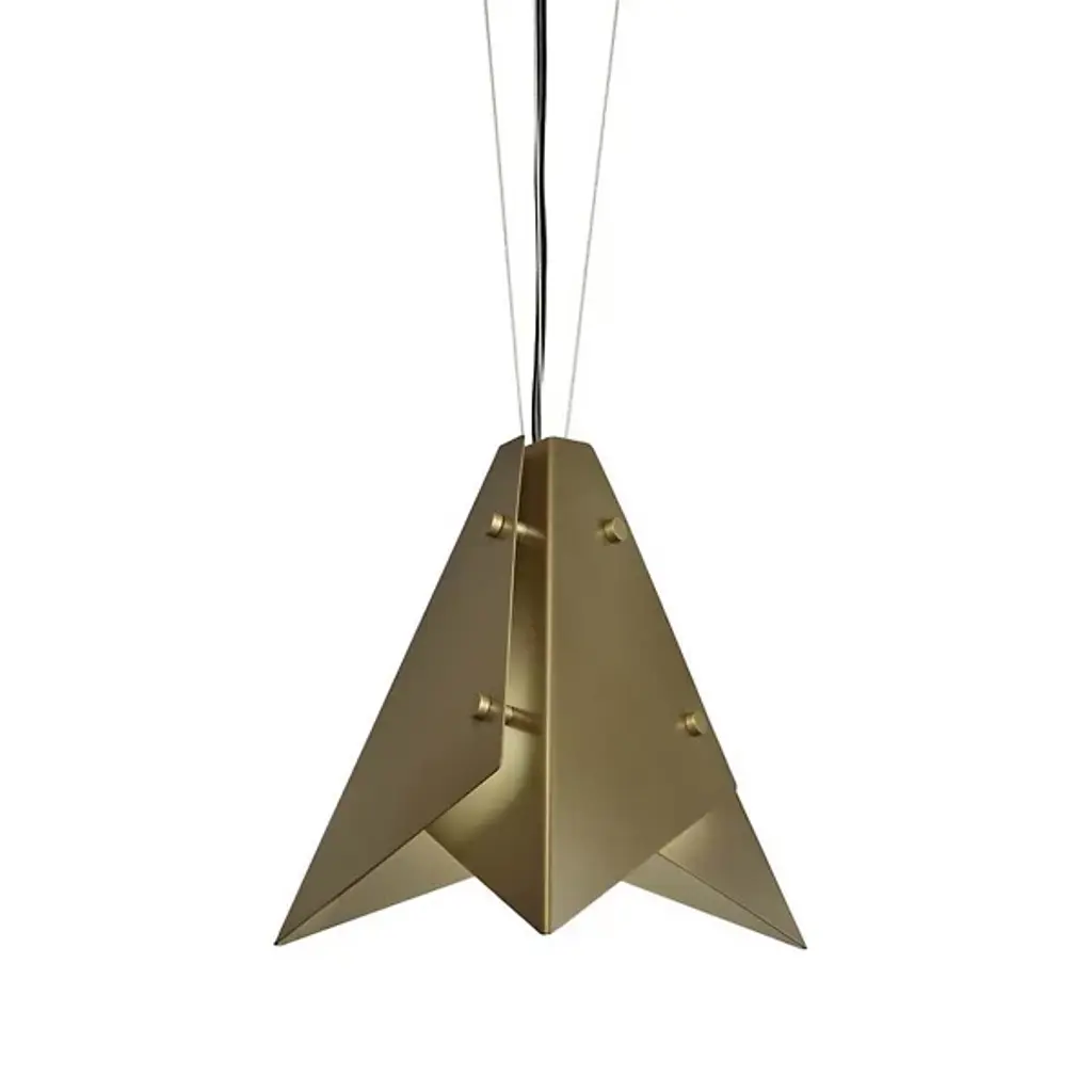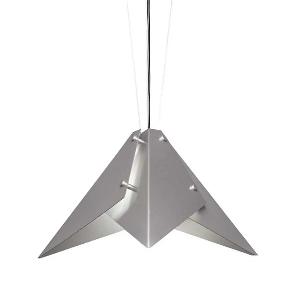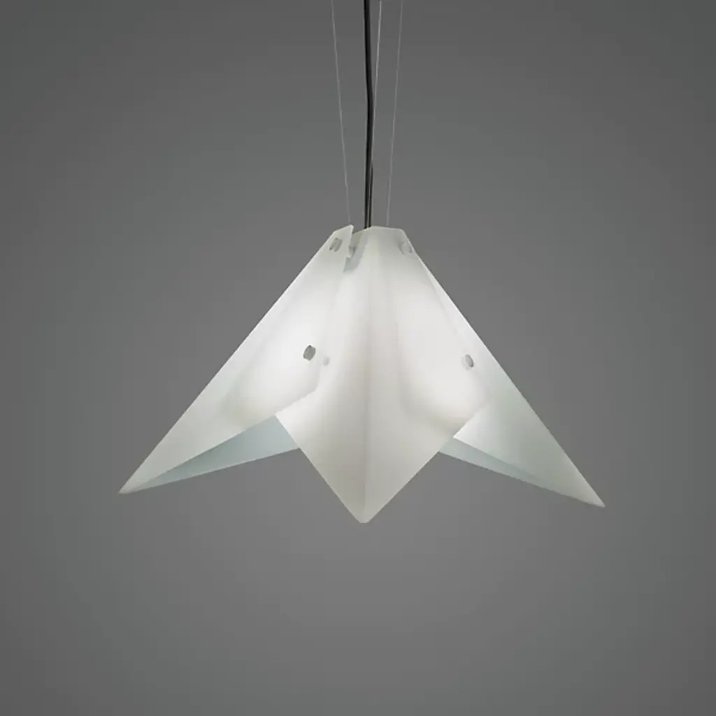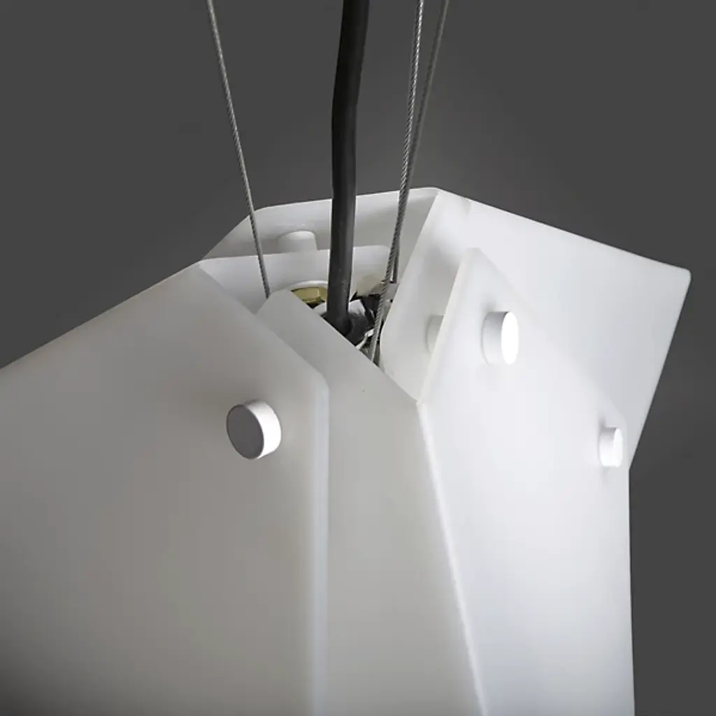 Be at the cutting-edge of contemporary design with the origami-like visuals of the Akira 21470 Acrylic Pendant from Ultralights. This forward-thinking piece presents simple geometry with a sense of dynamism. Opal acrylic shapes are folded and overlapped to create an ultra-sleek take on the familiar lamp shade. Metal accents fastening the acrylic shapes together give the piece a crafted quality. As light passes through the layered acrylic, it creates a seductive display of bright and mellow tones. Outpouring light creates a pleasant ambiance and lays a soft down glow over a surface below.