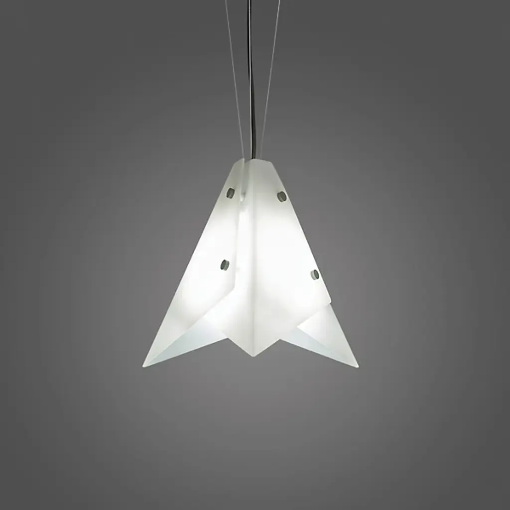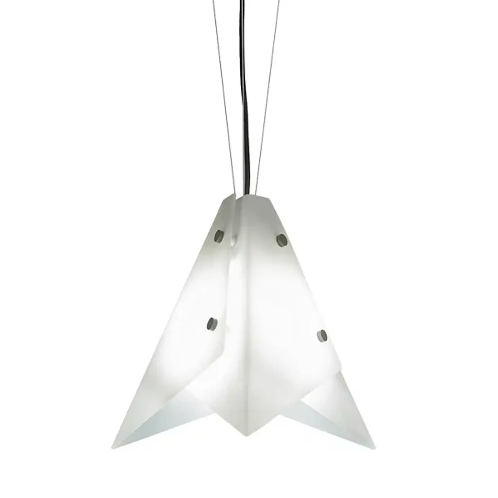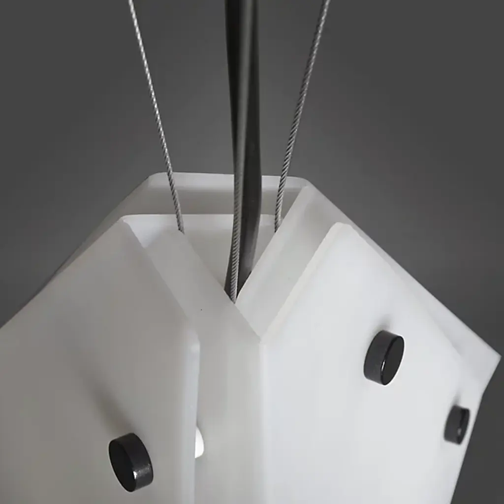 A design to unfold with your eyes. Like an intricately crafted piece of origami, the Akira 21471 Acrylic Pendant from Ultralights finds the striking balance between simplicity and complexity. This pendant's sleek, precise construction serves as a futuristic display in the contemporary home. Made from opal acrylic, the shade gets the eyes moving with the sharp angles created by its folded shapes. Arranged with a sculptural quality, the acrylic shade is secured with visually popping metal accents. The opaque shade mellows out the light of the bright LED bulbs into an alluring ambient glow. Light also fans out the sleek opening to accentuate your tables or the floor.