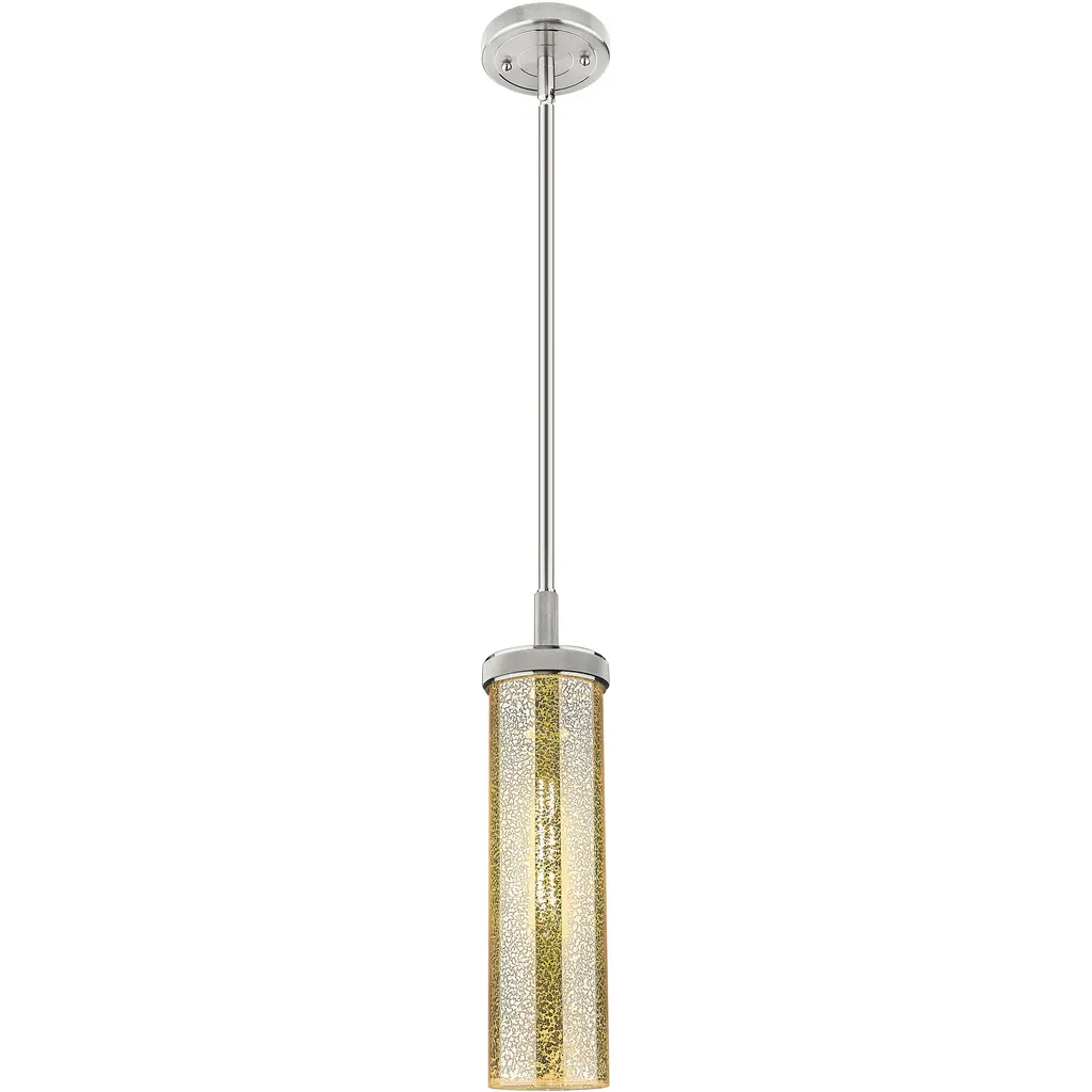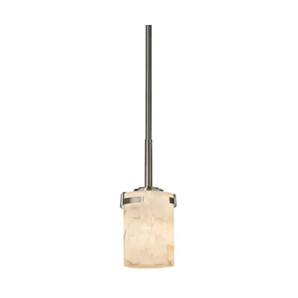 Adorn your decor in a elegant sense of contemporary style — with an eye catching twist. The Alabaster Rocks! Atlas Mini Pendant by Justice Design is crafted around a stylish long profile that can be used to aid a sense of proportion in rooms of all sizes. This pendant light features a flat rim cylinder diffuser that is crafted with shavings of real Alabaster Rock suspended in a milky Resin to create a light effect unmatched by similar looks. This diffuser is suspended with a hand worked Metal rod system and round mount perfect for lending a certain modern minimalist touch.