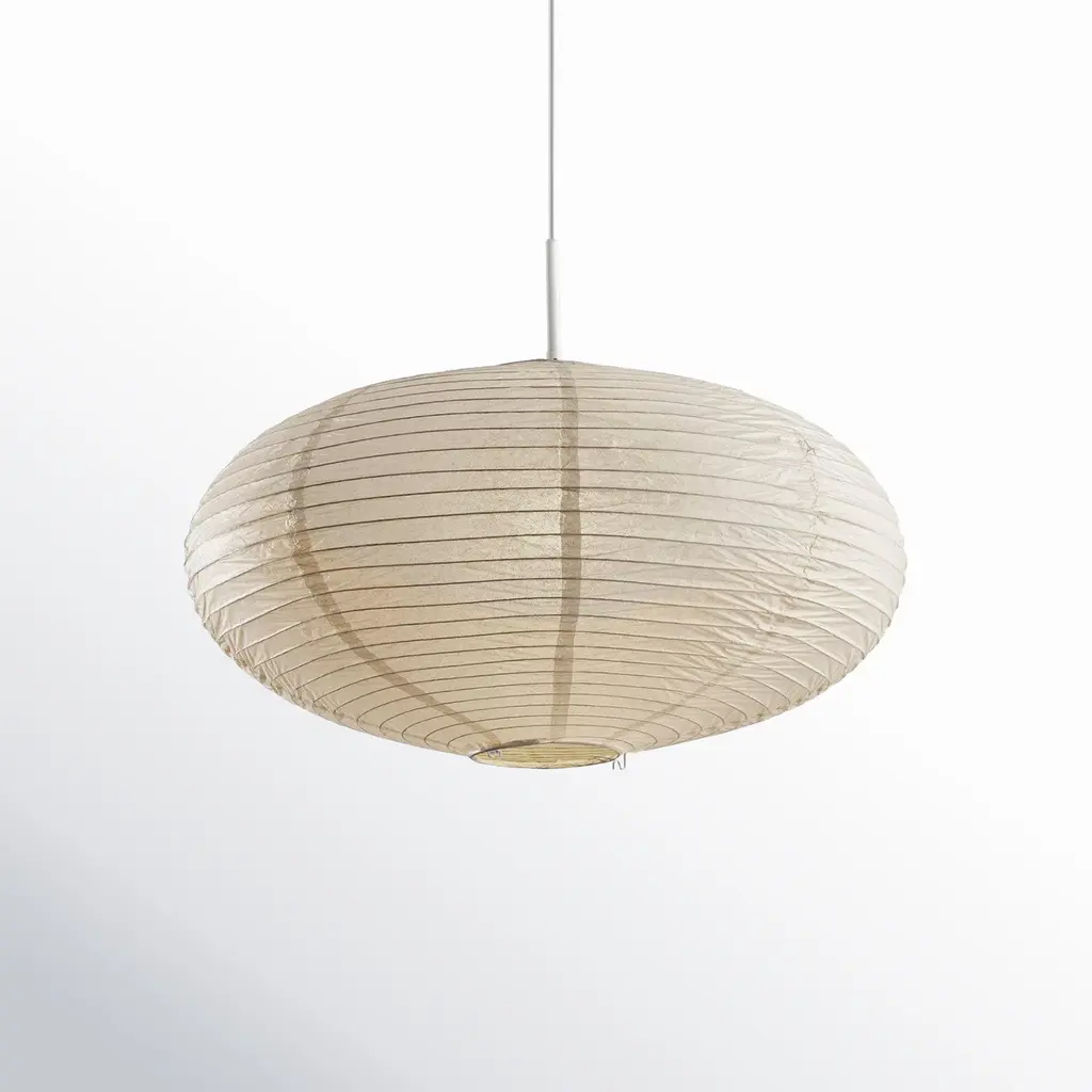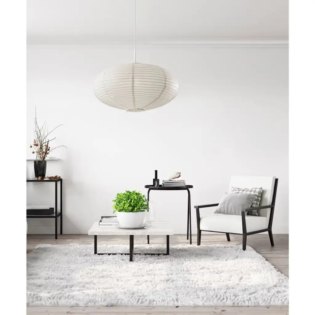 The Alana large pendant light adds a modern spin to the traditional paper lantern design. With a monochrome look, the pendant features a round white canopy base supporting an off-white paper shade measuring 13.25" tall and 24" in diameter. The shade softly distills the light from a 100W bulb for an even, warm glow. Hang the pendant by itself or pair it with several more to create a stunning effect and add illumination to your kitchen, dining area, bedroom, or bathroom. With a 5′ white cord, the height of the light can be adjusted to suit the needs of any room regardless of the ceiling height. The Alana pendant light is also available in a smaller, 11" tall and 20" diameter option.