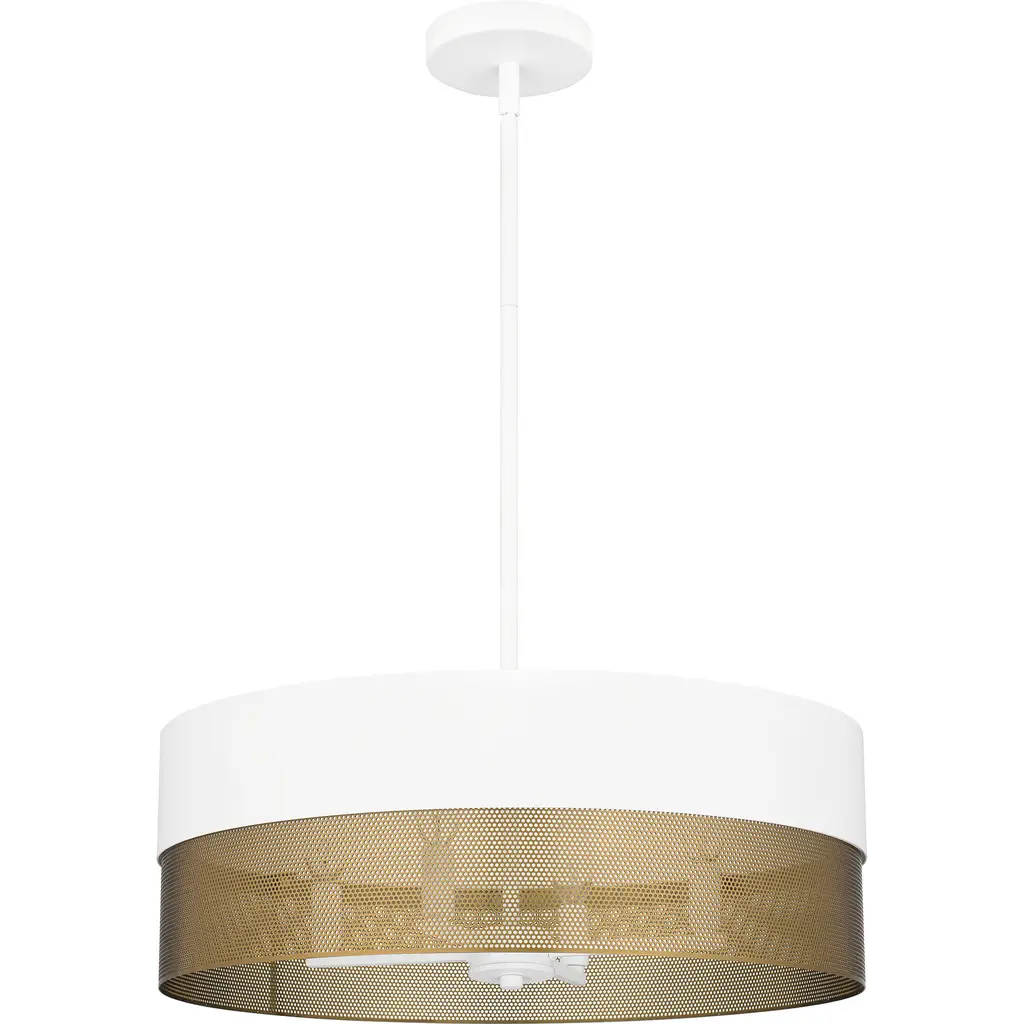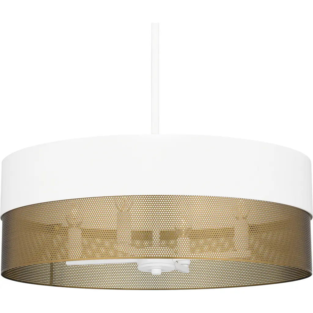 With a two-tone design and industrial styling, Alani pendant lights make a true statement in any space. Available in either matte black or matte white, the drum silhouette incorporates a perforated gold metal shade that adds a unique textured effect. With their versatile design, these oversized pendants look great over a table, in a bedroom, or in a living room area.