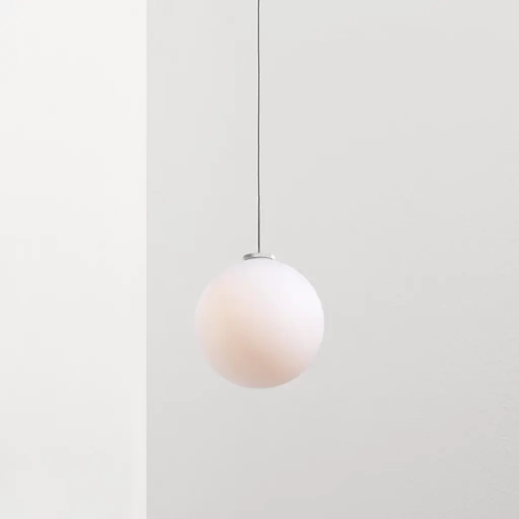 Brass and glass pendant lamp.1 x max 75 WE27↔ 32 cmMaterials: metal / blown-glassColors: satin brass / polished opalineCertifications: CEThe concept of Alba starts with a very simple element: the designer’s imagination was inspired by a drop of water – which she puts to use in different ways, depending on the model. References to the world of nature, with soft shapes contrasted with square lines, together with the use of a satin brass finish, combine to create Alba, a family with a strong visual impact.