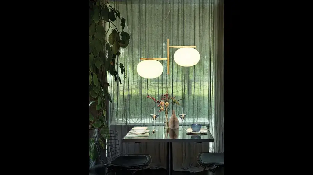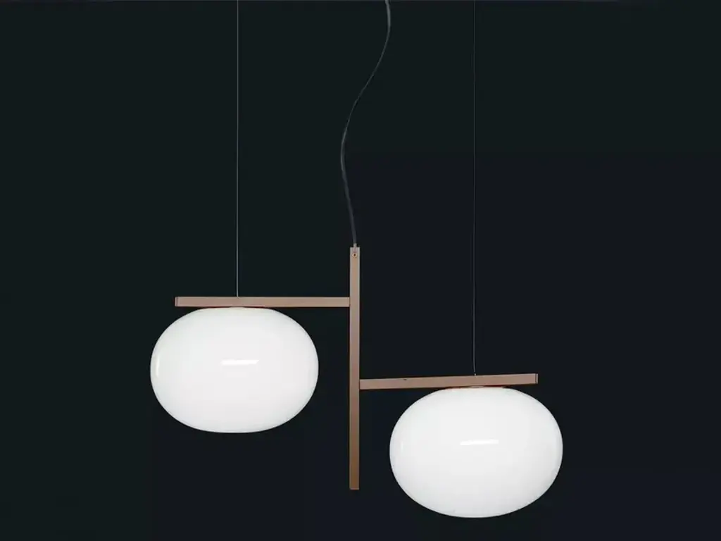 In Alba 468 the cable supports a metal structure with a satin brass finish, with two offset arms, under which light shines from the opaline drops.Suspension lamp giving diffused light in polished opaline blown-glass. Satin brass or anodic bronze finish structure with rectangular profile.2 x max 75 WE27The concept of Alba starts with a very simple element: the designer’s imagination was inspired by a drop of water – which she puts to use in different ways, depending on the model. References to the world of nature, with soft shapes contrasted with square lines, together with the use of a satin brass finish, combine to create Alba, a family with a strong visual impact.