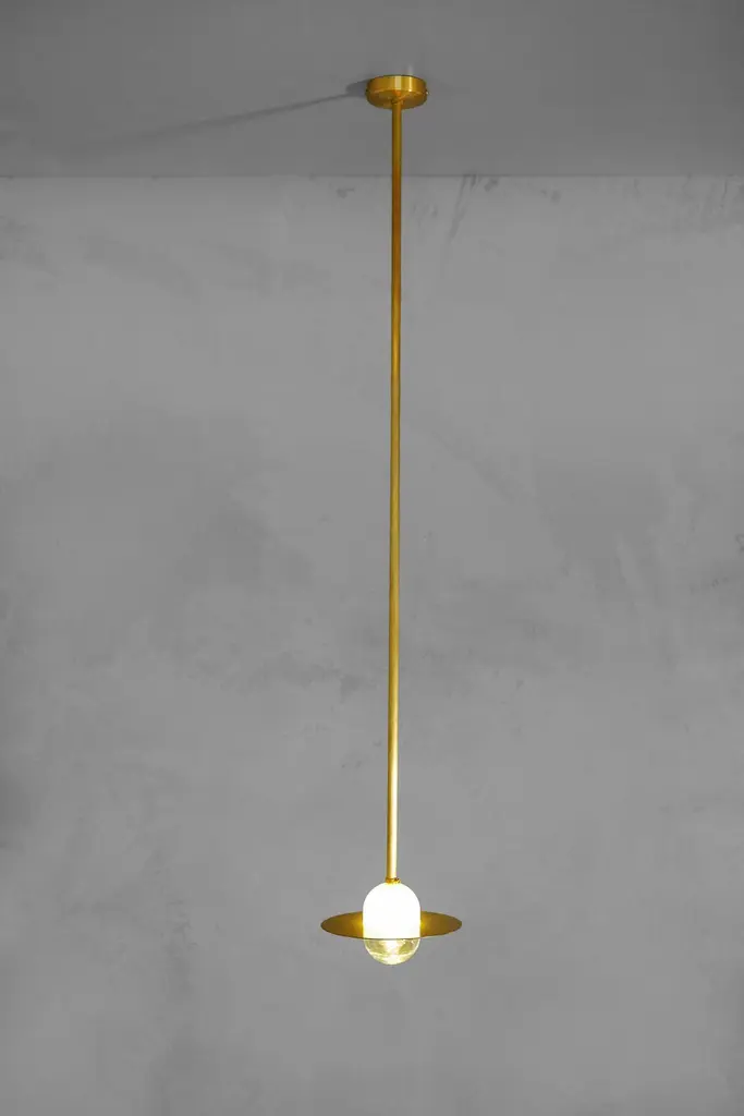Alba pendant tube by Contain.Dimensions: D 15 x W 15 H 100 cm (custom length).Materials: brass, 3D printed PLA structure and optical lens.Also available in different finishes.All our lamps can be wired according to each country. If sold to the USA it will be wired for the USA for instance.“You are where you live” .So, we decided to live in Mallorca. We are Mauricio Obarrio and Juan Peralta and Contain is our lighting and furniture design studio.This collection is the result of the collaboration between our studio, local artisans and the Industrial sector; where creativity and simplicity creates a unique synergy and generates a narrative between the materials used and the pieces created. Our Mission is to deliver artisan crafted, highly engineered, sophisticated yet simple lighting design solutions. Our studio's inspiration is fueled by an obsession with natural materials such as brass, glass, and hardwoods along with a love for artisan craftsmanship.