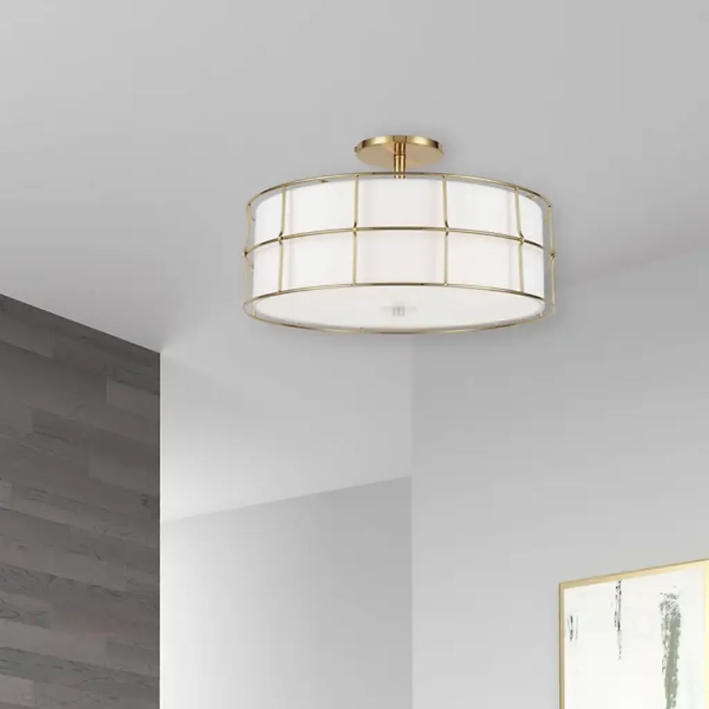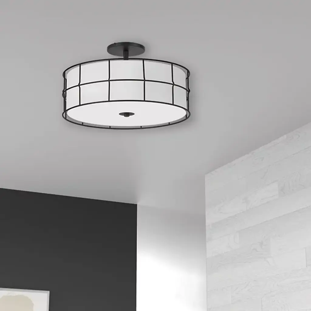 A generous light for a comfortable room. Soft illumination and a sophisticated silhouette come your way with the Alcala Semi-Flushmount from Dainolite. A group of bulbs hides behind a fabric drum shade for a pleasant glare-free experience. The bulb’s light filters through the fabric as a soft, spacious glow. The generous glow enhances the graphic silhouette created by the metal framework. The caged metal framework pops against the clean white surface of the shade for a stylish visual.