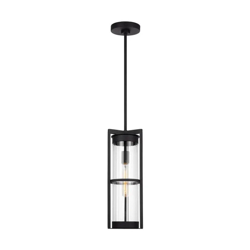 Clear fluted glass shades give the Alcona series a refined industrial look. The elegant square backplate and metal center ring provide a floating glass effect. The Alcona one light outdoor pendant fixture creates a warm and inviting welcome presentation for your home's exterior. Available in a handsome Black or Antique Bronze finish.