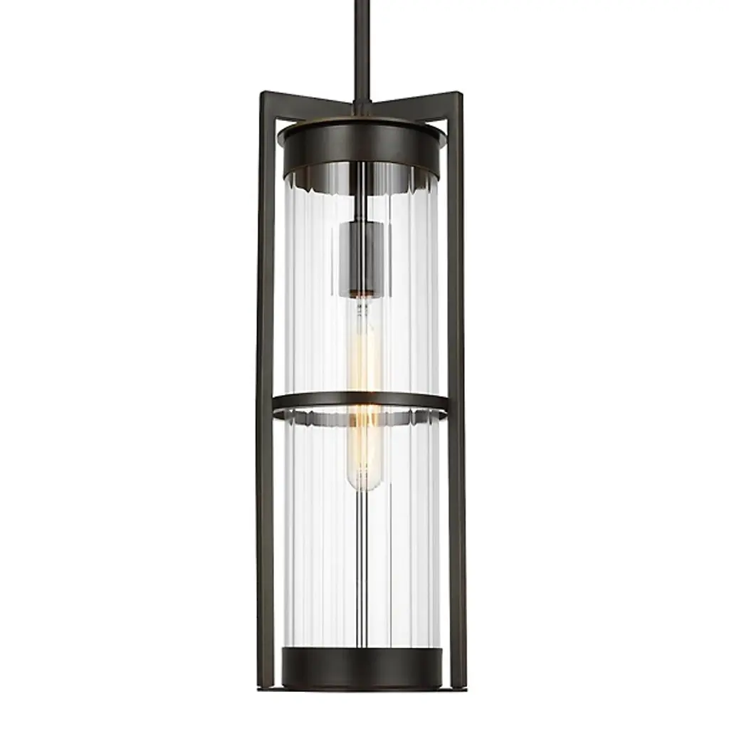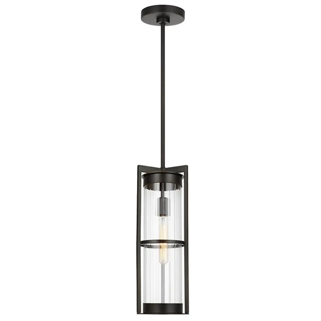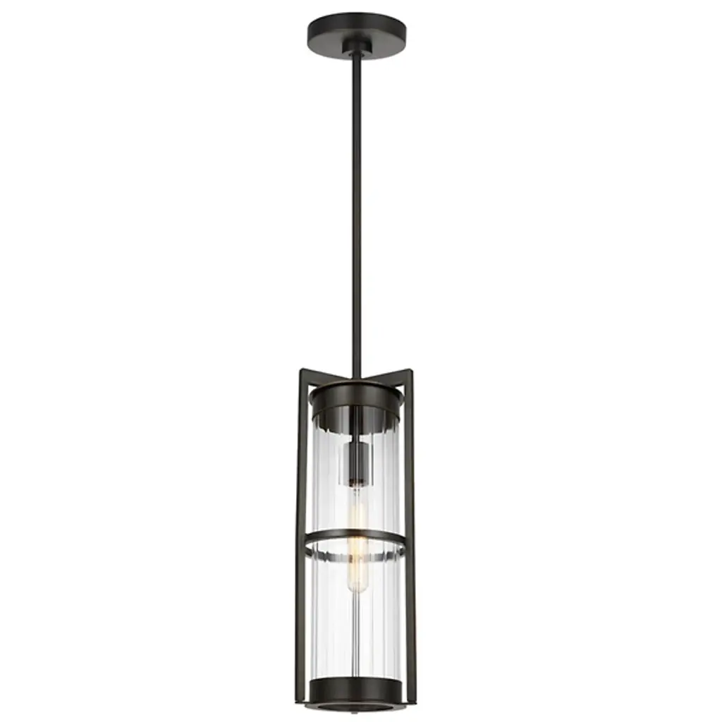 The Alcona Outdoor Mini Pendant from Visual Comfort Studio, formerly known as Sea Gull Lighting, dresses up one's open-air spaces with a clean glow and a pristine linear pattern. It's a transitional design featuring robust materials for outdoor use. On its own or in a series, the piece draws attention with an angular metal framework and a series of round shapes. A clear fluted glass shade receives long linear highlights from the bulb inside. This bulb streams a warm cast light over surfaces below.
