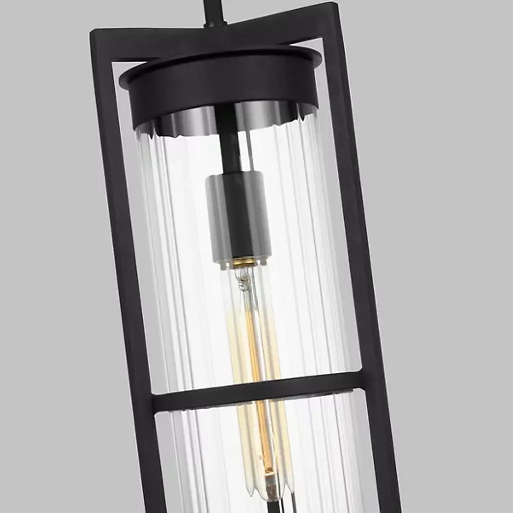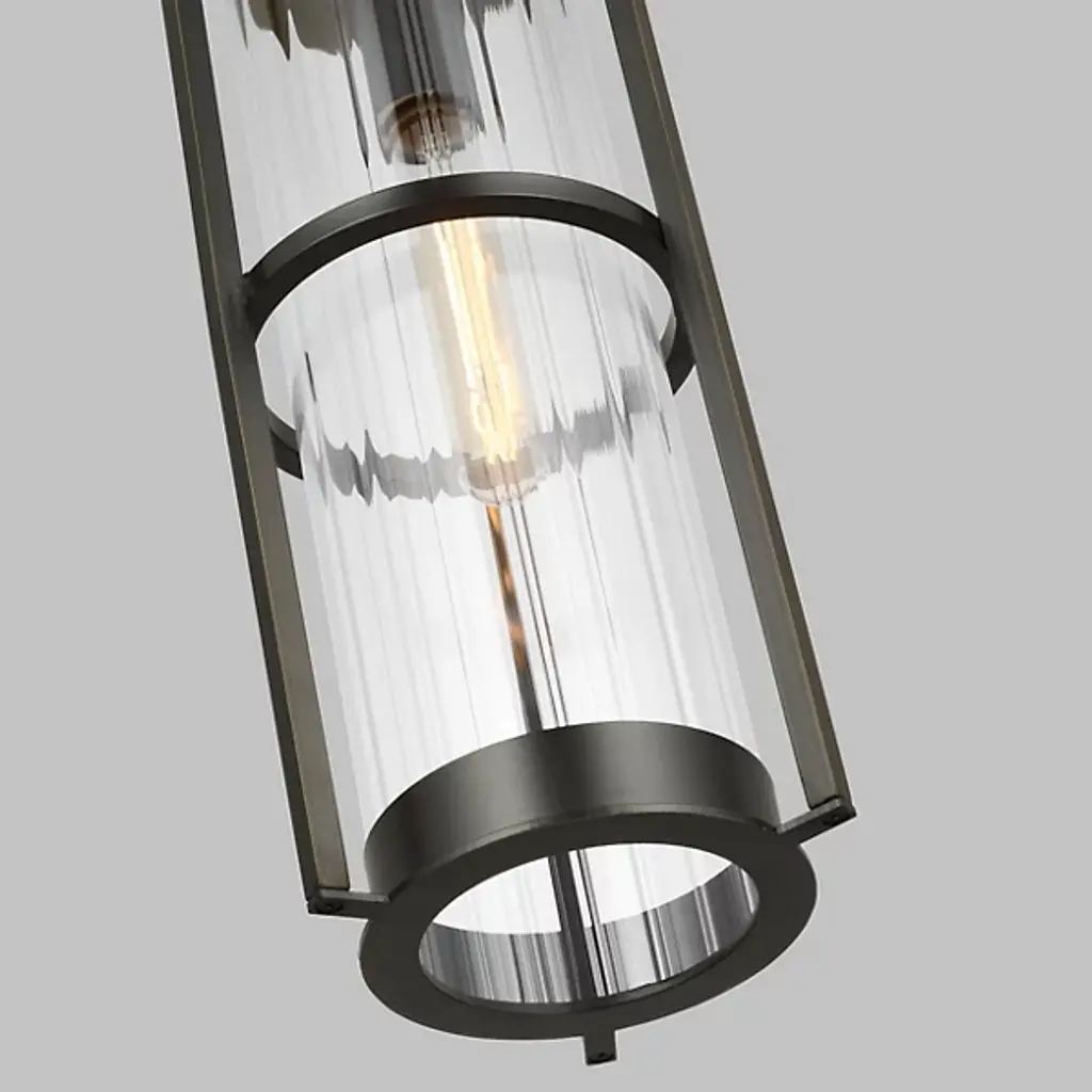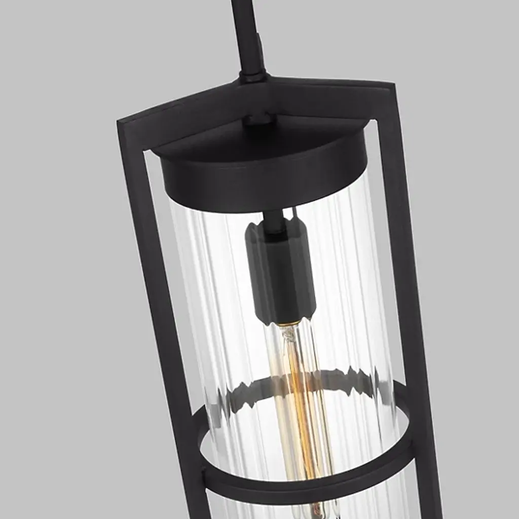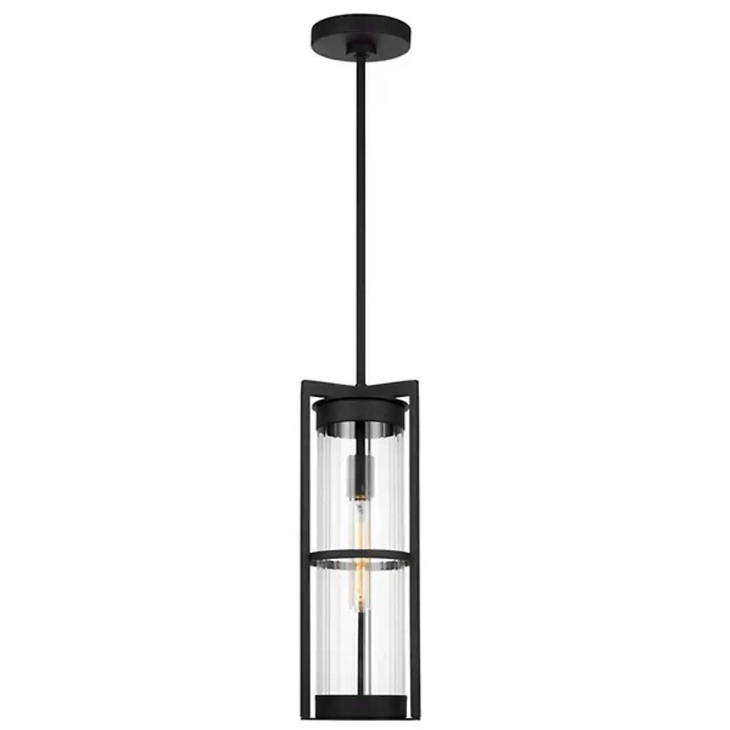 The Alcona Outdoor Mini Pendant from Visual Comfort Studio, formerly known as Sea Gull Lighting, dresses up one's open-air spaces with a clean glow and a pristine linear pattern. It's a transitional design featuring robust materials for outdoor use. On its own or in a series, the piece draws attention with an angular metal framework and a series of round shapes. A clear fluted glass shade receives long linear highlights from the bulb inside. This bulb streams a warm cast light over surfaces below.
