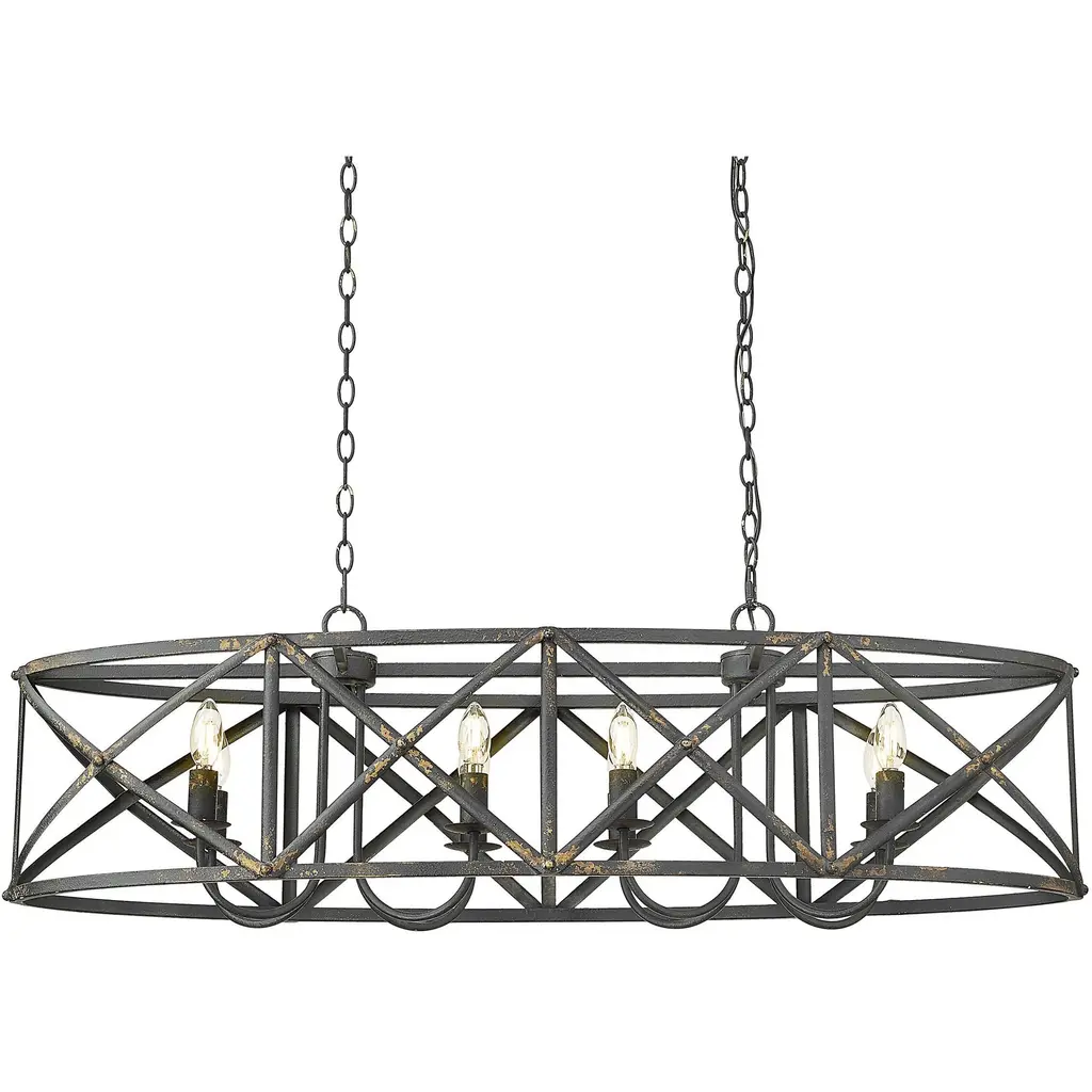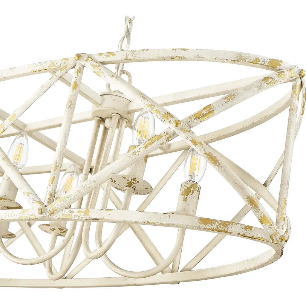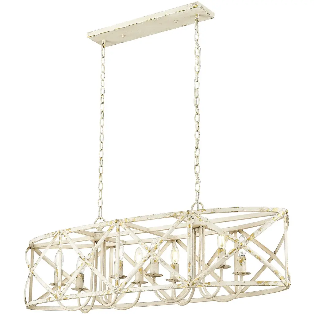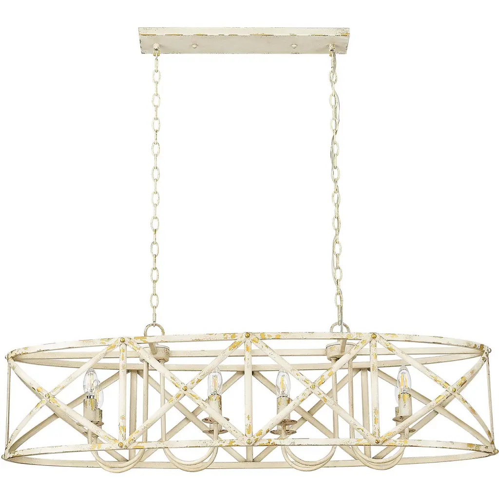 Bring traditional elegance into your home with the Golden Lighting Alcott 8-light Island Light. Featuring an open-cage design, it creates a welcoming atmosphere in your space.This fixture comes in a rich Antique Ivory finish that evokes the timeless charm of a treasured European heirloom. Each piece is carefully hand-painted, adorned with gold leafing, and highlights stunning craftsmanship.Ideal for dry locations like kitchens, dining areas, and hallways, the adjustable height (Min: 16.625"- Max: 90.25") and sloped-ceiling compatibility ensure it fits perfectly anywhere you desire.Overall Dimensions: 45"W x 13.63"H x 14"D. Requires 8 E12 Candelabra base bulbs (not included), with a max of 60 watts per bulb.Elevate your home with the inviting warmth and artisanal quality of this exquisite fixture.